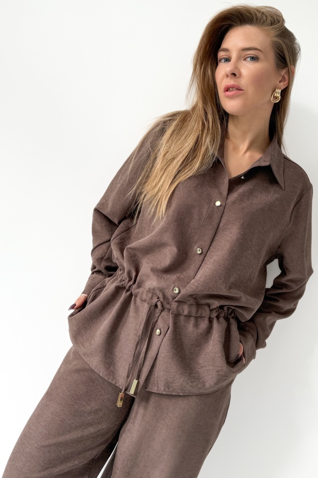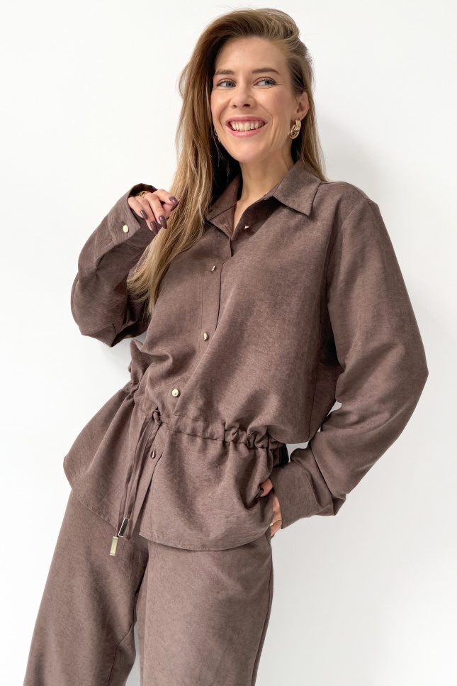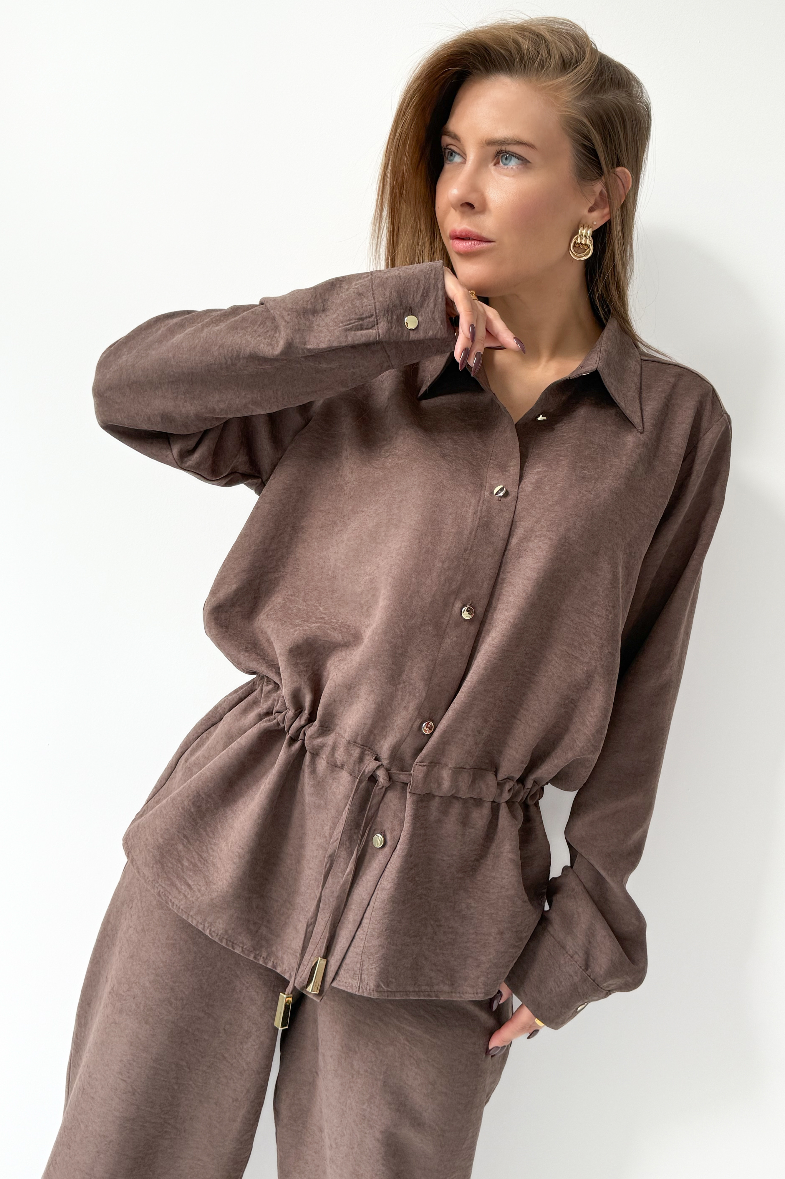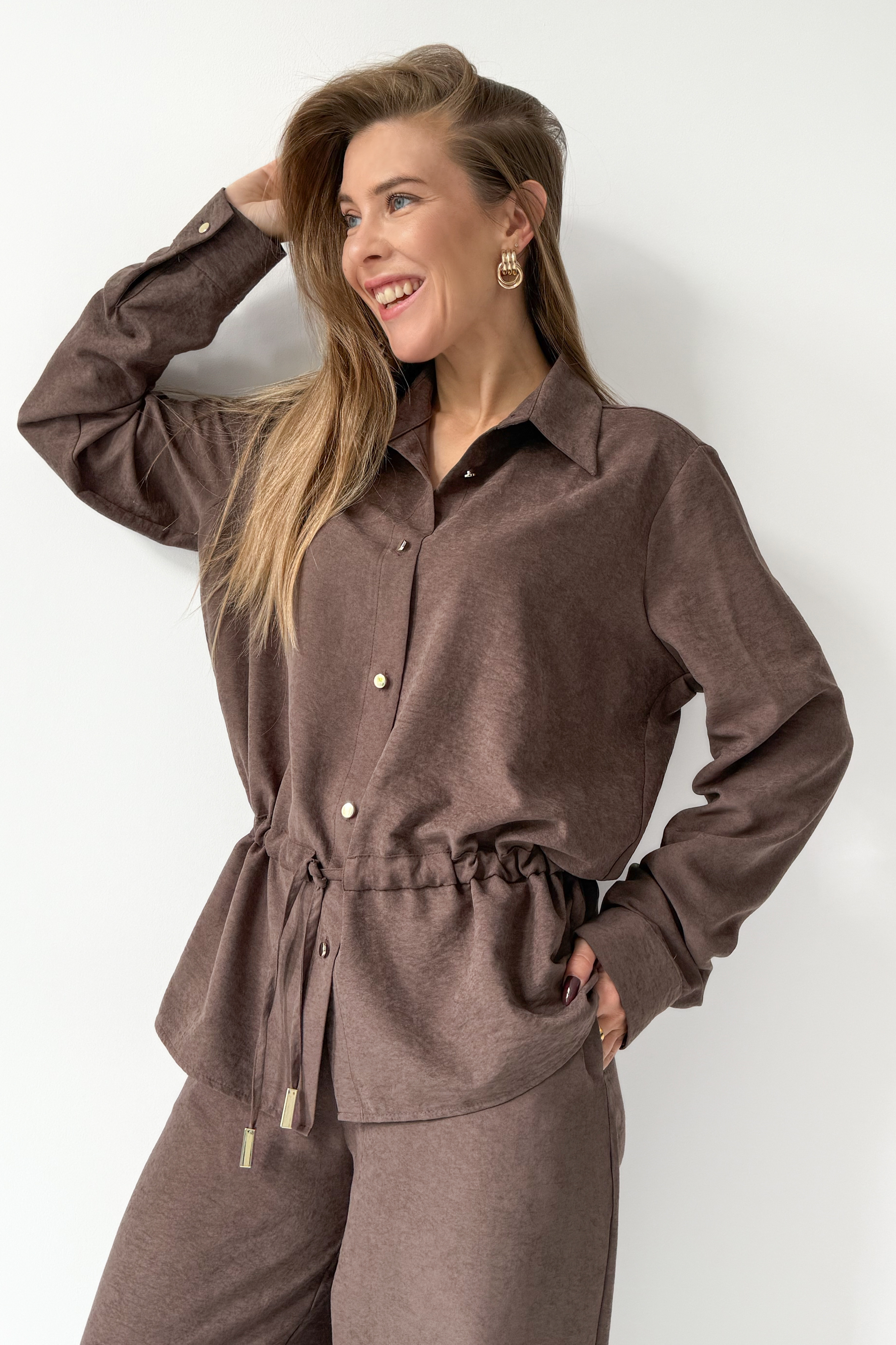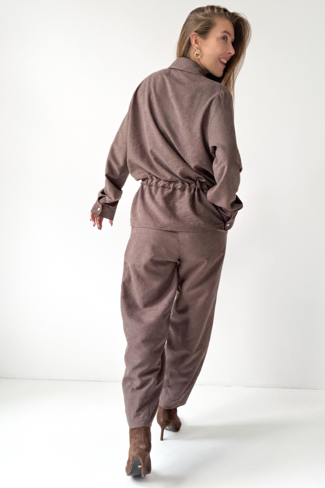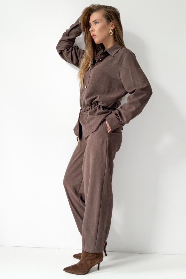 „Serave” to nowoczesny komplet, który łączy wygodę z ponadczasową elegancją. Składa się z luźnej koszuli z wiązaniem w pasie oraz spodni o prostych nogawkach lekko zwężanych ku dołowi. Uszyty z unikatowego materiału przypominającego zamsz (90% lyocell, 10% rayon), zachwyca miękkością i subtelnym wykończeniem. Idealny wybór zarówno do biura, jak i na weekendowe wyjścia czy eleganckie spotkania – „Serave” pozwala tworzyć stylizacje w duchu nowoczesnej, świadomej mody.