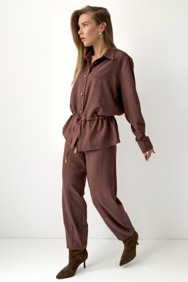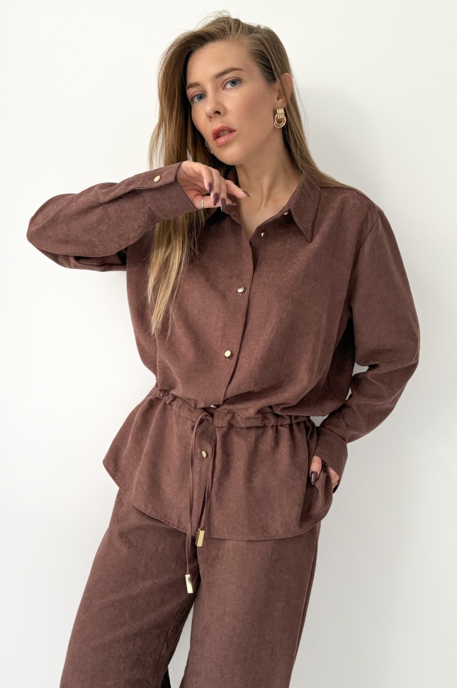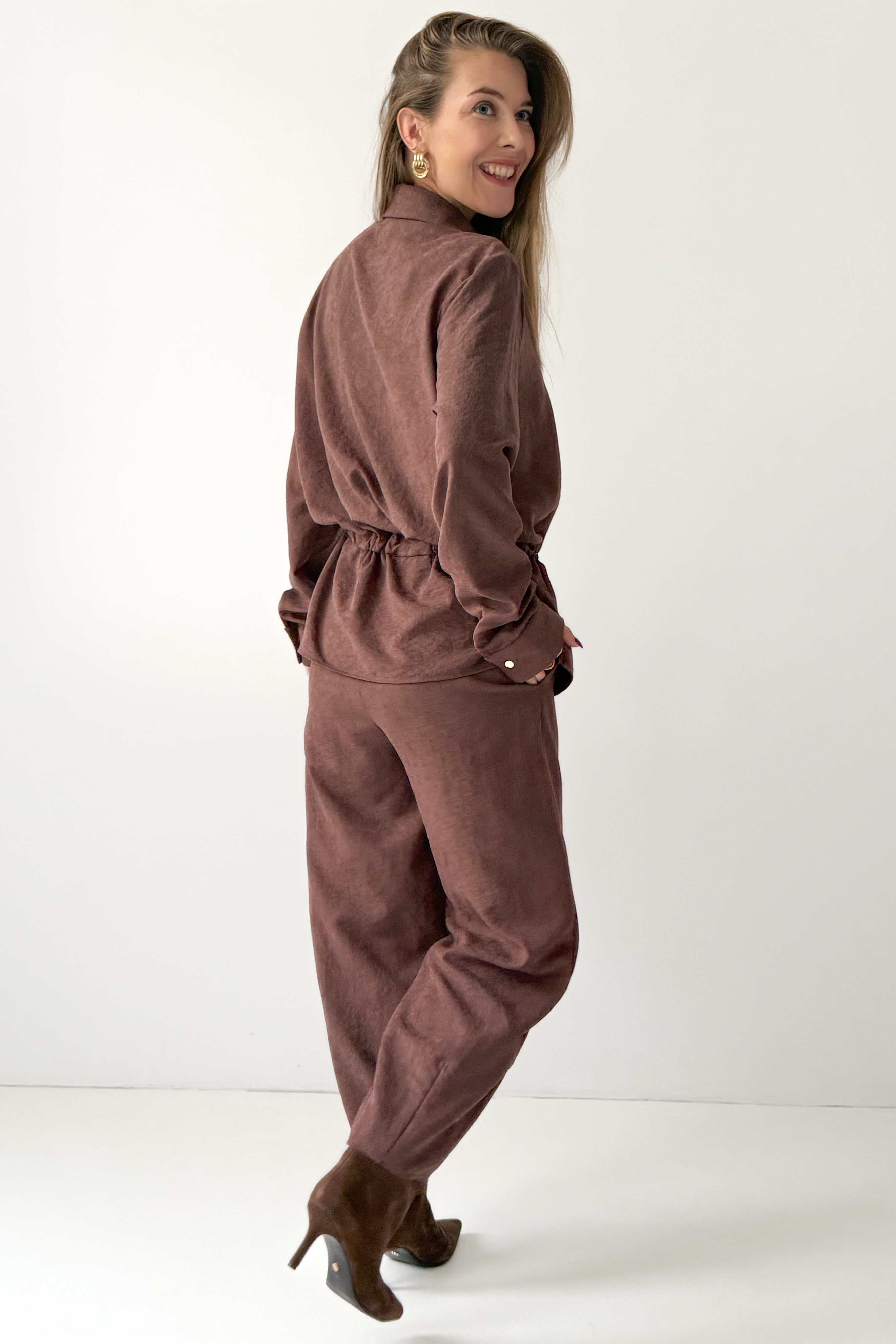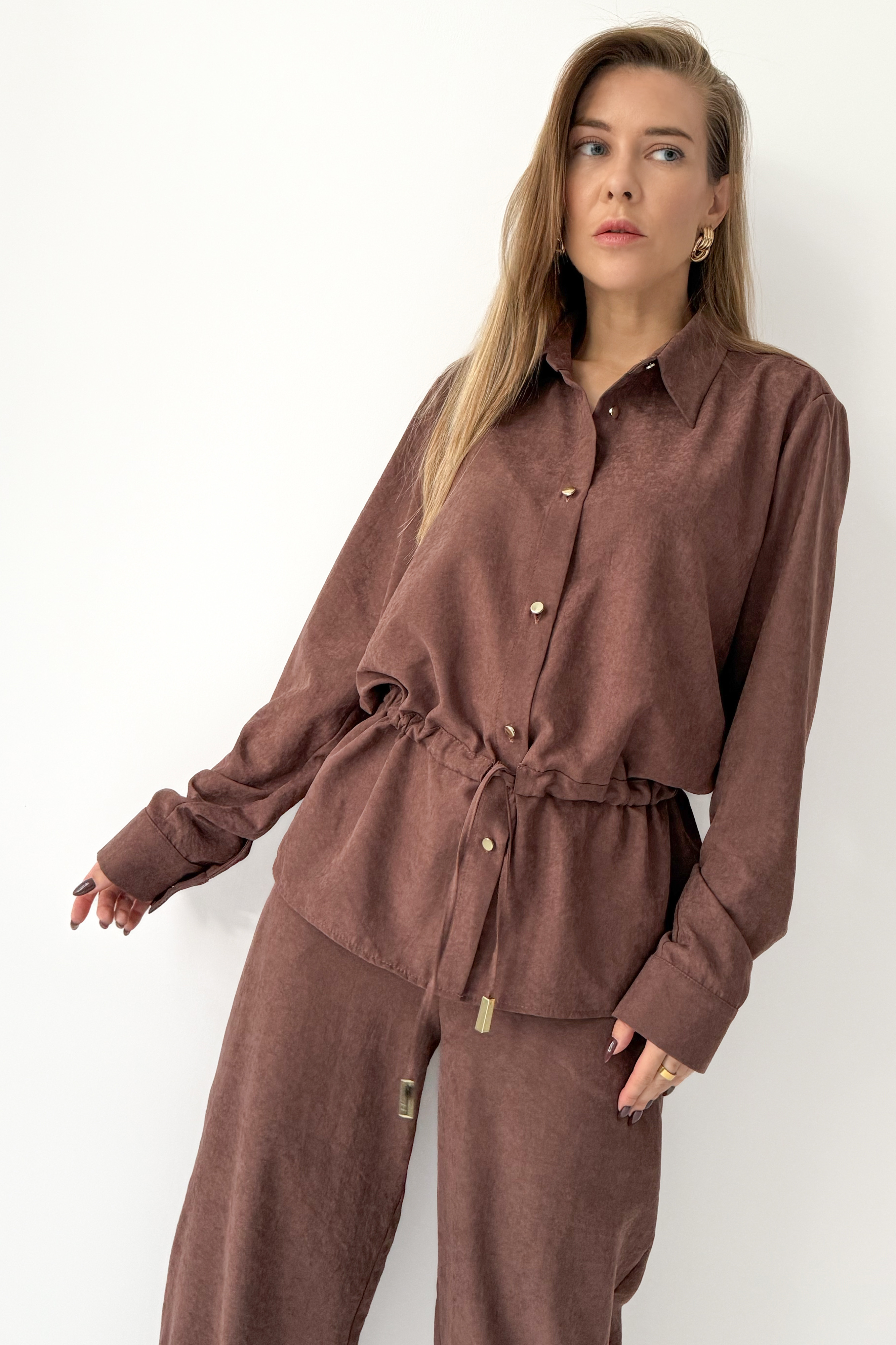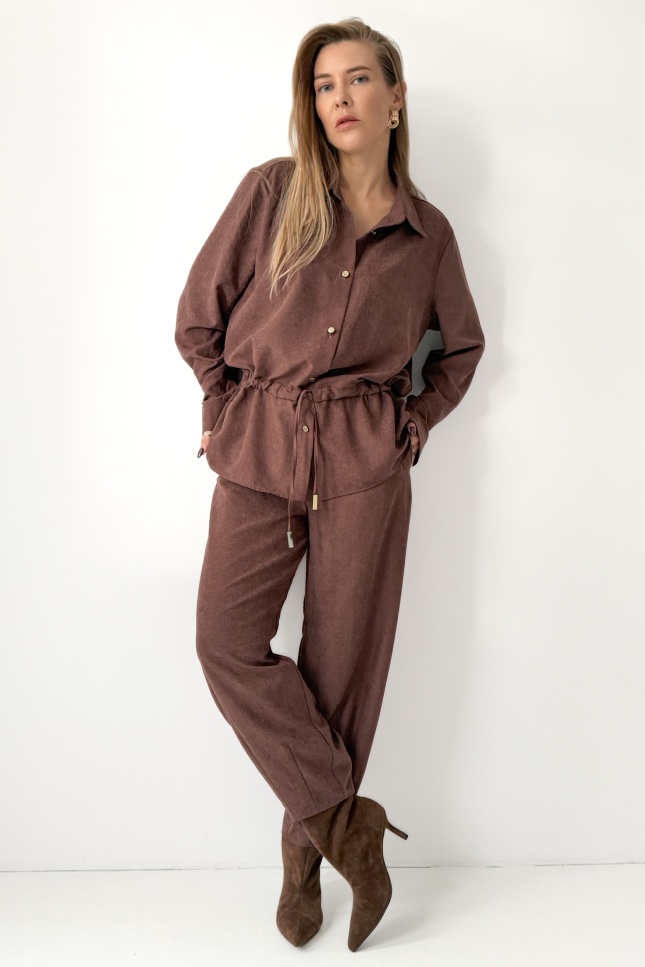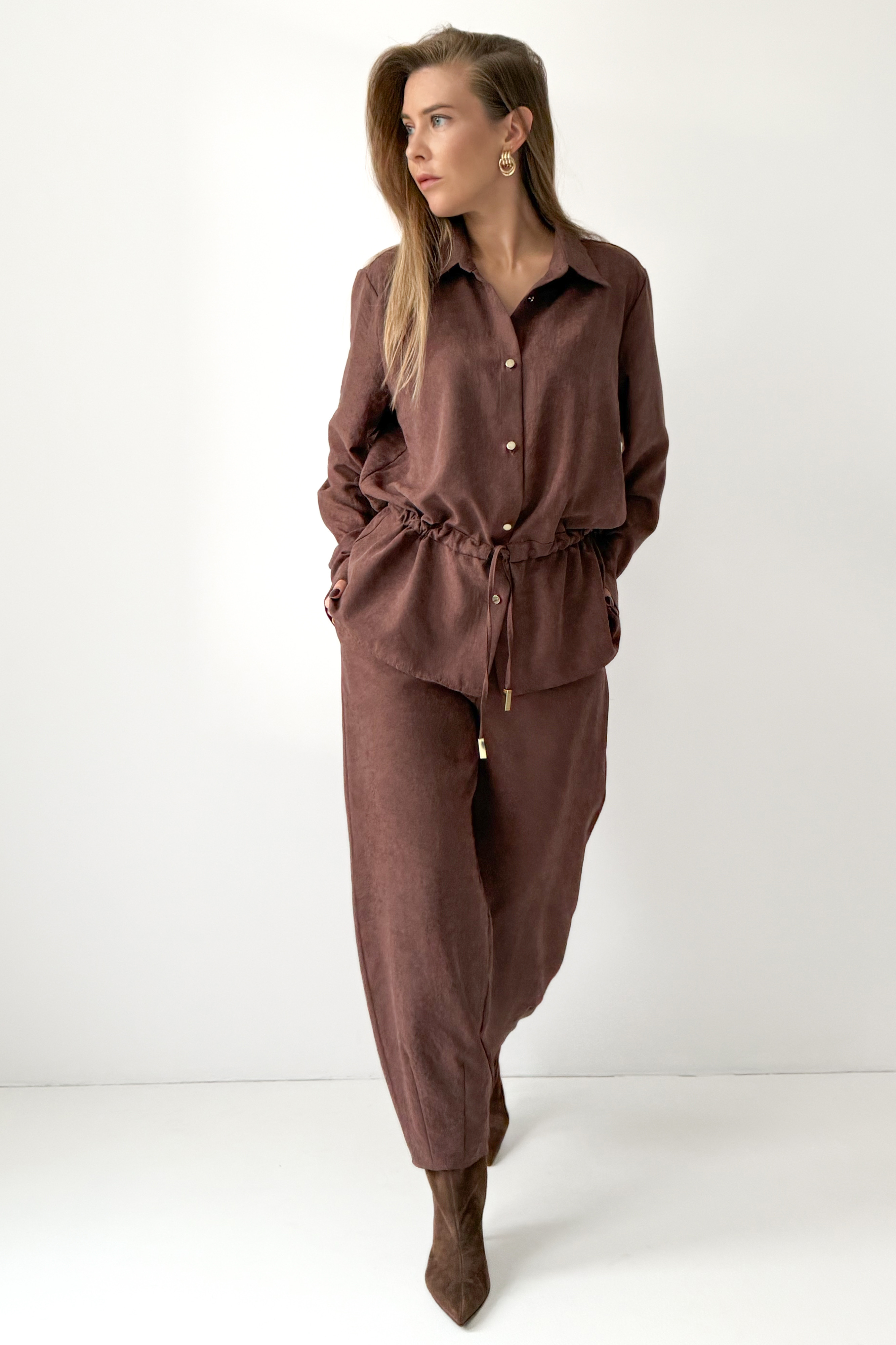 „Serave” to nowoczesny komplet, który łączy wygodę z ponadczasową elegancją. Składa się z luźnej koszuli z wiązaniem w pasie oraz spodni o prostych nogawkach lekko zwężanych ku dołowi. Uszyty z unikatowego materiału przypominającego zamsz (90% lyocell, 10% rayon), zachwyca miękkością i subtelnym wykończeniem. Idealny wybór zarówno do biura, jak i na weekendowe wyjścia czy eleganckie spotkania – „Serave” pozwala tworzyć stylizacje w duchu nowoczesnej, świadomej mody.