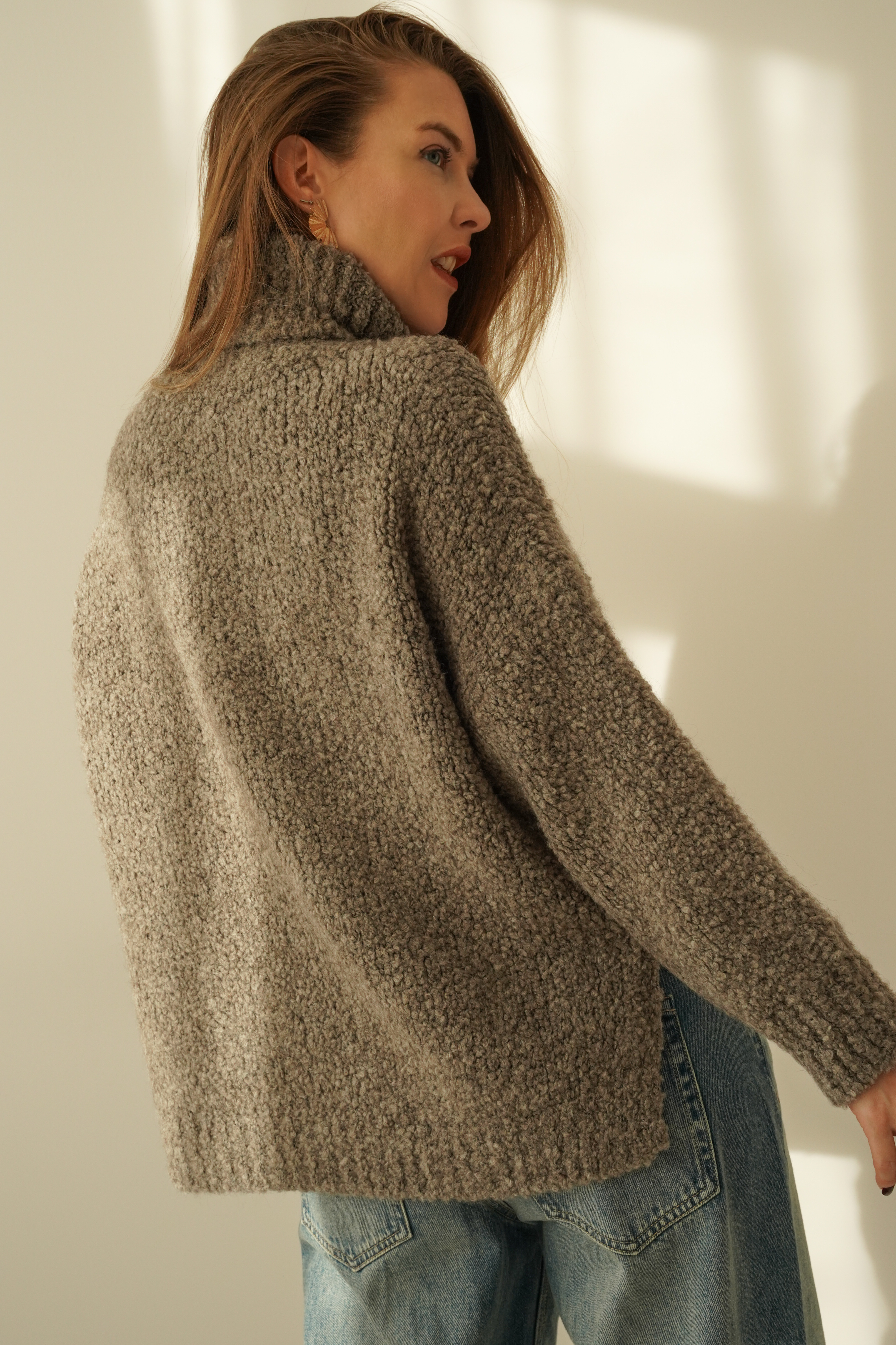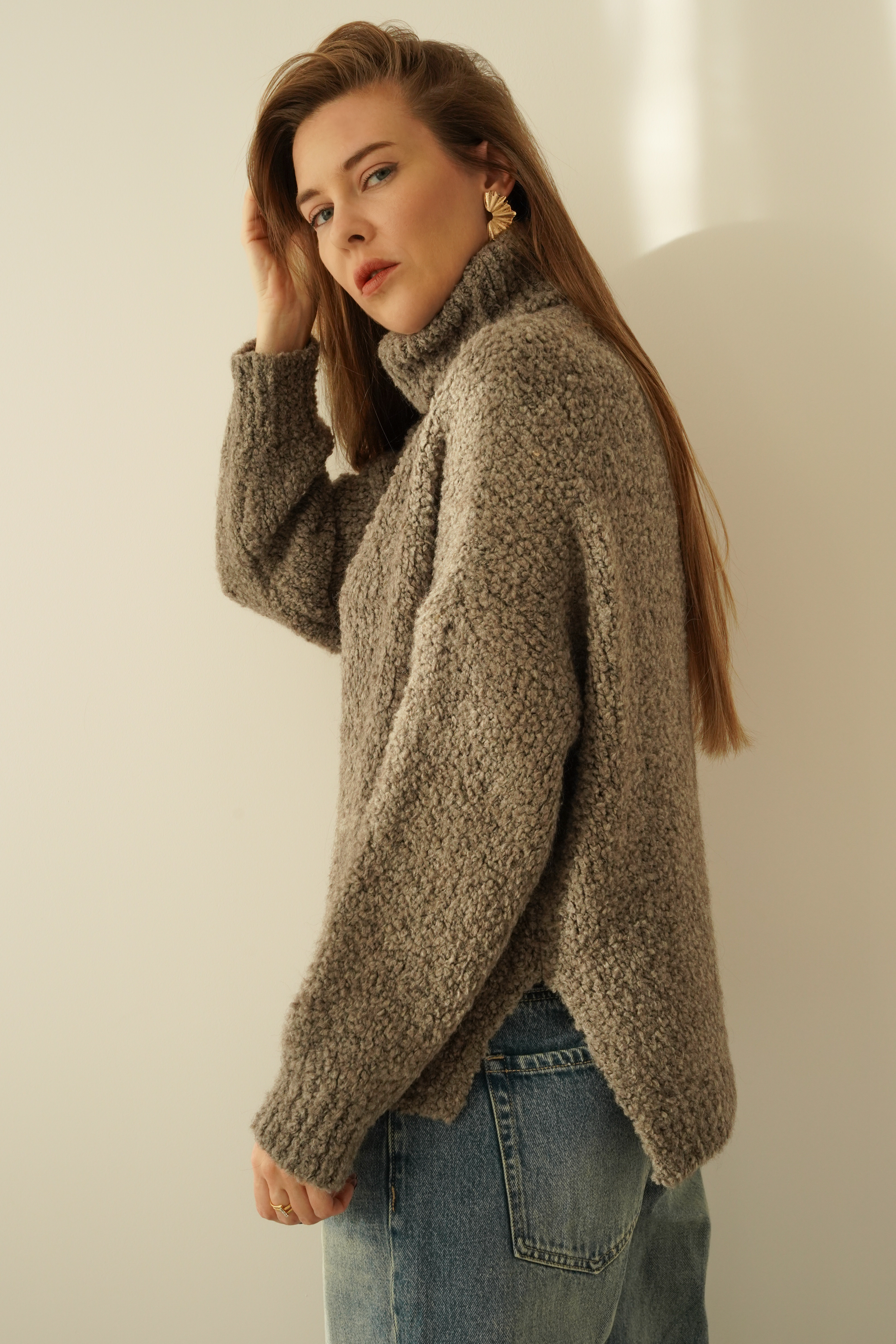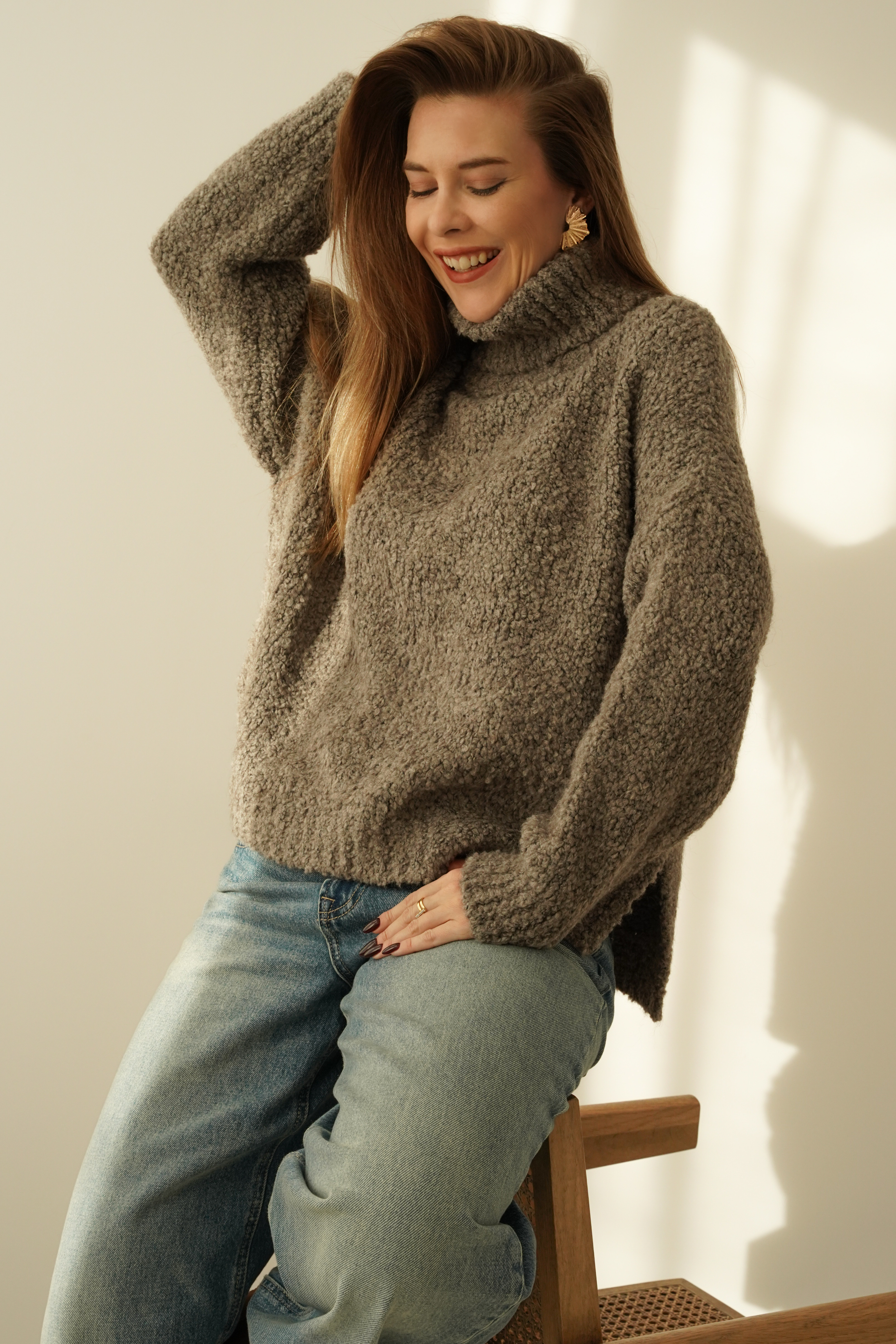Miękki, cieplutki golf wykonany z przędzy typu bouclé, która nadaje mu wyjątkowej puszystości i przytulności. Ma lekko wydłużony tył i luźny fason, który pięknie układa się na sylwetce. „Aspen” to kwintesencja zimowego komfortu – idealny na chłodne dni, do miejskich stylizacji i górskich wyjazdów.