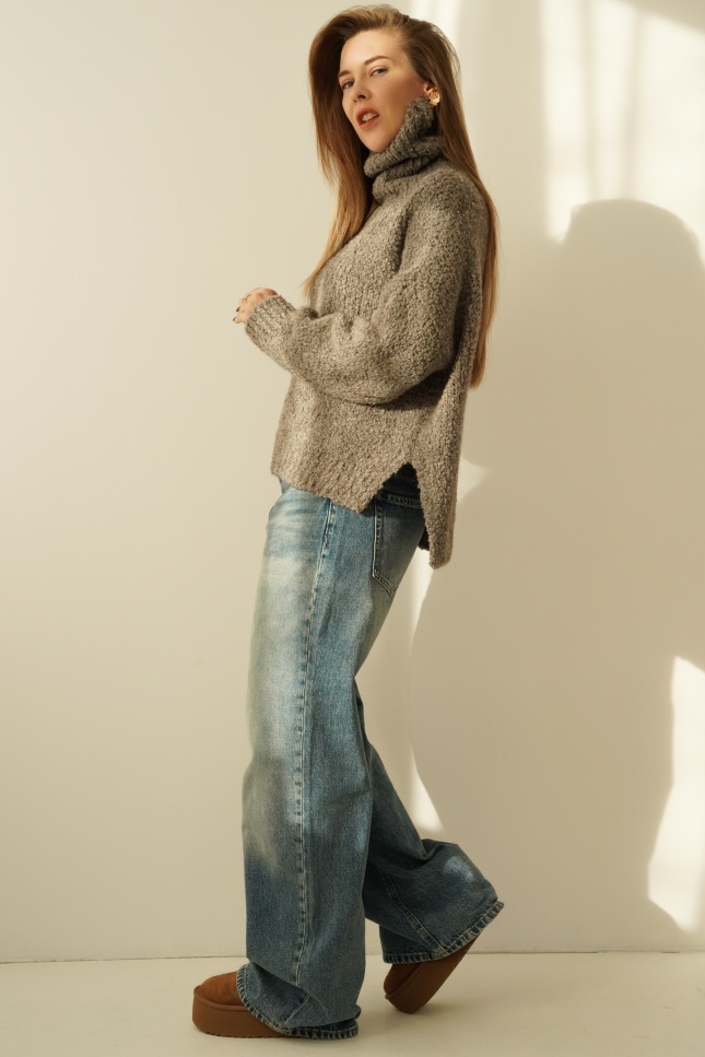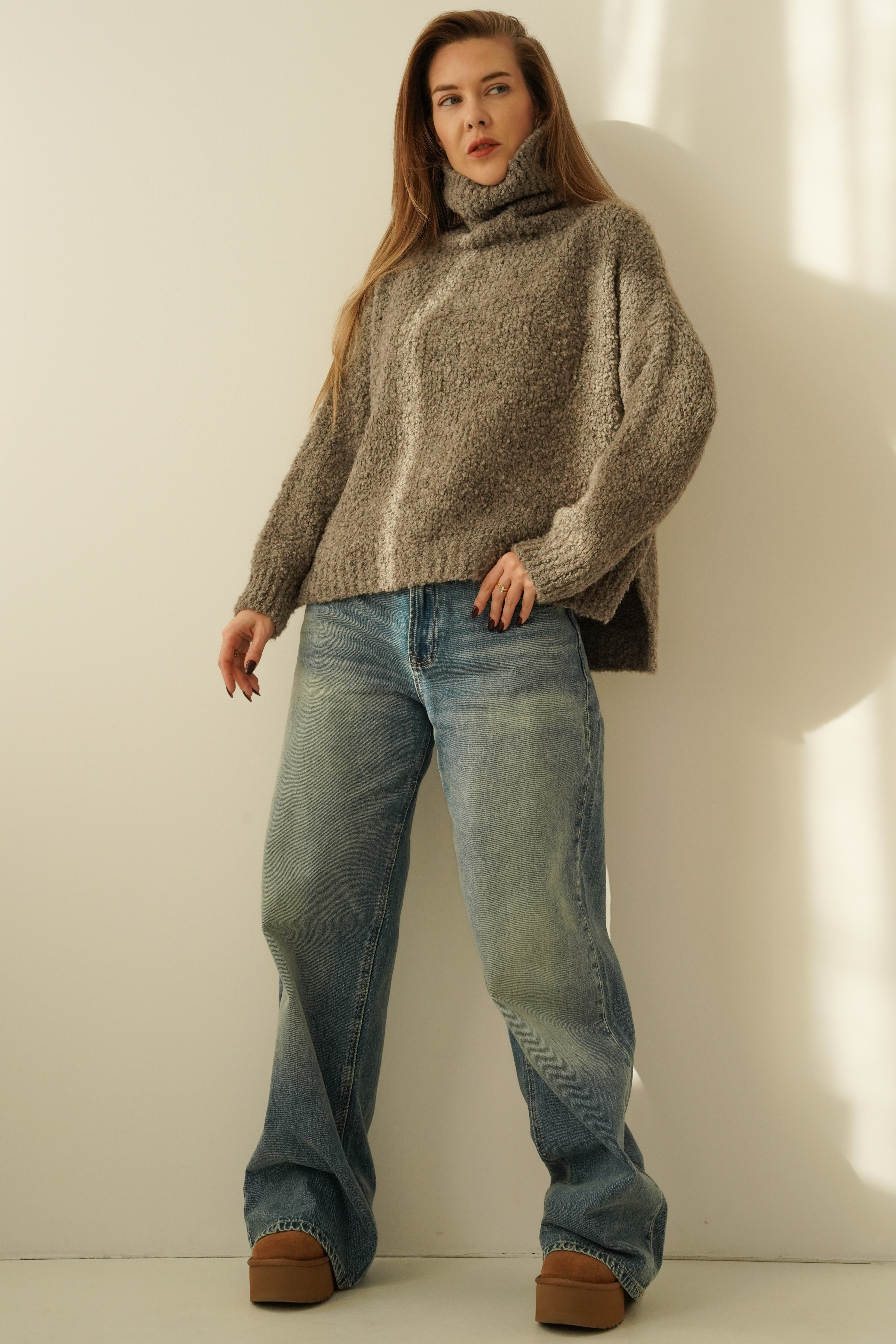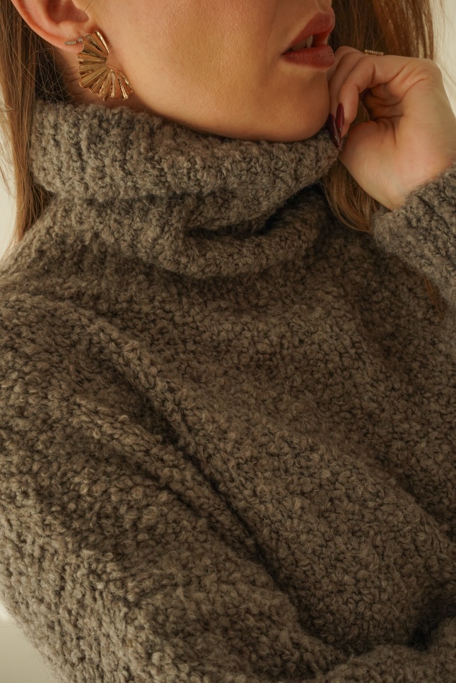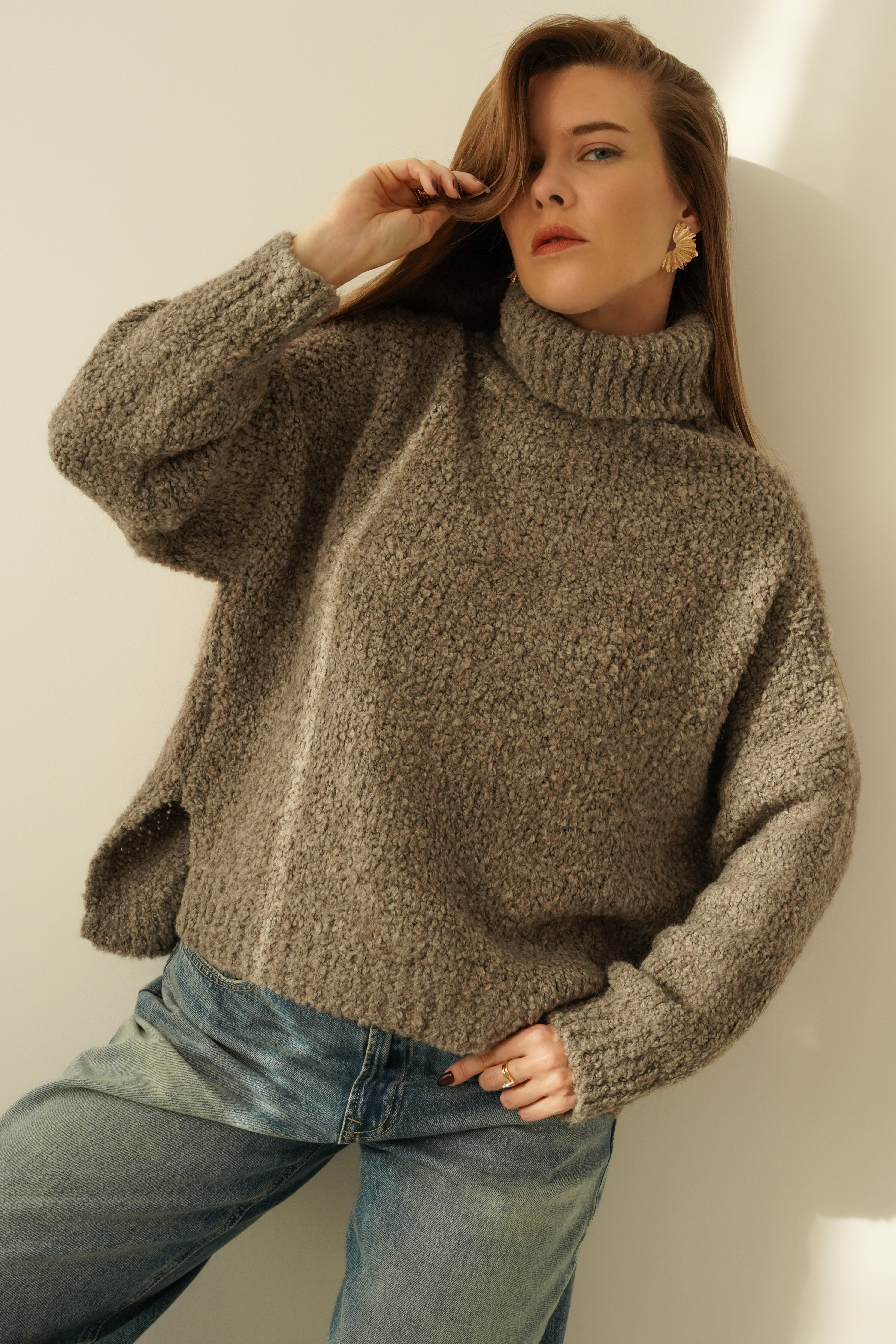 Miękki, cieplutki golf wykonany z przędzy typu bouclé, która nadaje mu wyjątkowej puszystości i przytulności. Ma lekko wydłużony tył i luźny fason, który pięknie układa się na sylwetce. „Aspen” to kwintesencja zimowego komfortu – idealny na chłodne dni, do miejskich stylizacji i górskich wyjazdów.