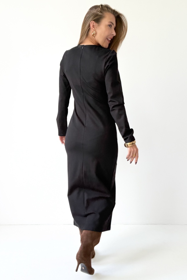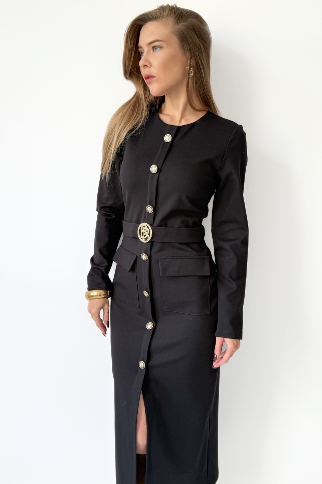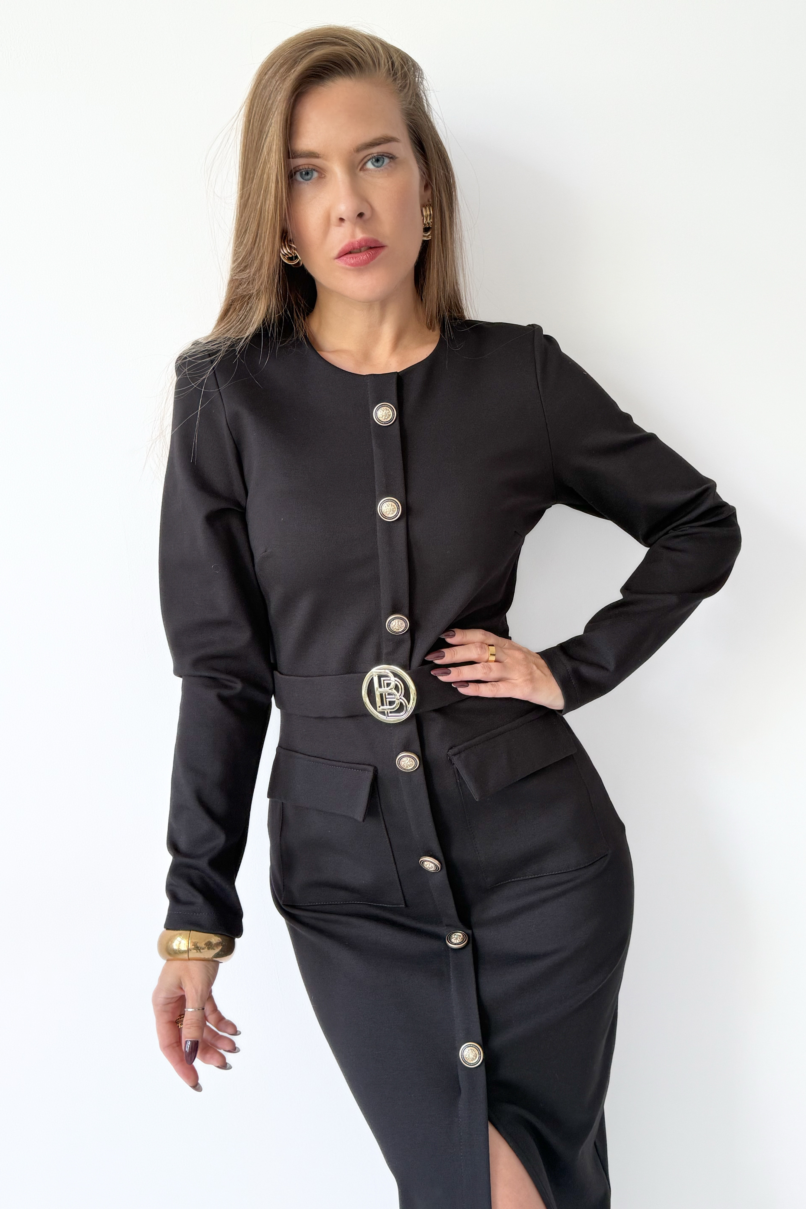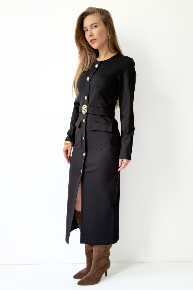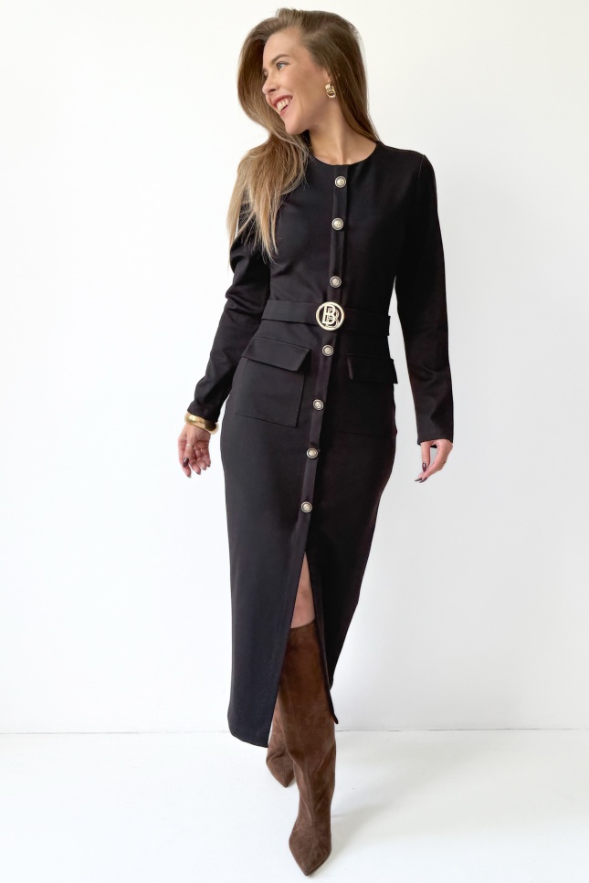 „Bordeaux” to kobieca, dopasowana sukienka, która łączy klasykę z nowoczesnym szykiem. Ozdobne guziki na całej długości i kieszonki w linii bioder nadają jej wyjątkowego charakteru, a rozcięcie z przodu subtelnie eksponuje nogi. Wykonana z miękkiej, przyjemnej w dotyku dzianiny – zapewnia komfort noszenia i elegancki wygląd na każdą okazję.