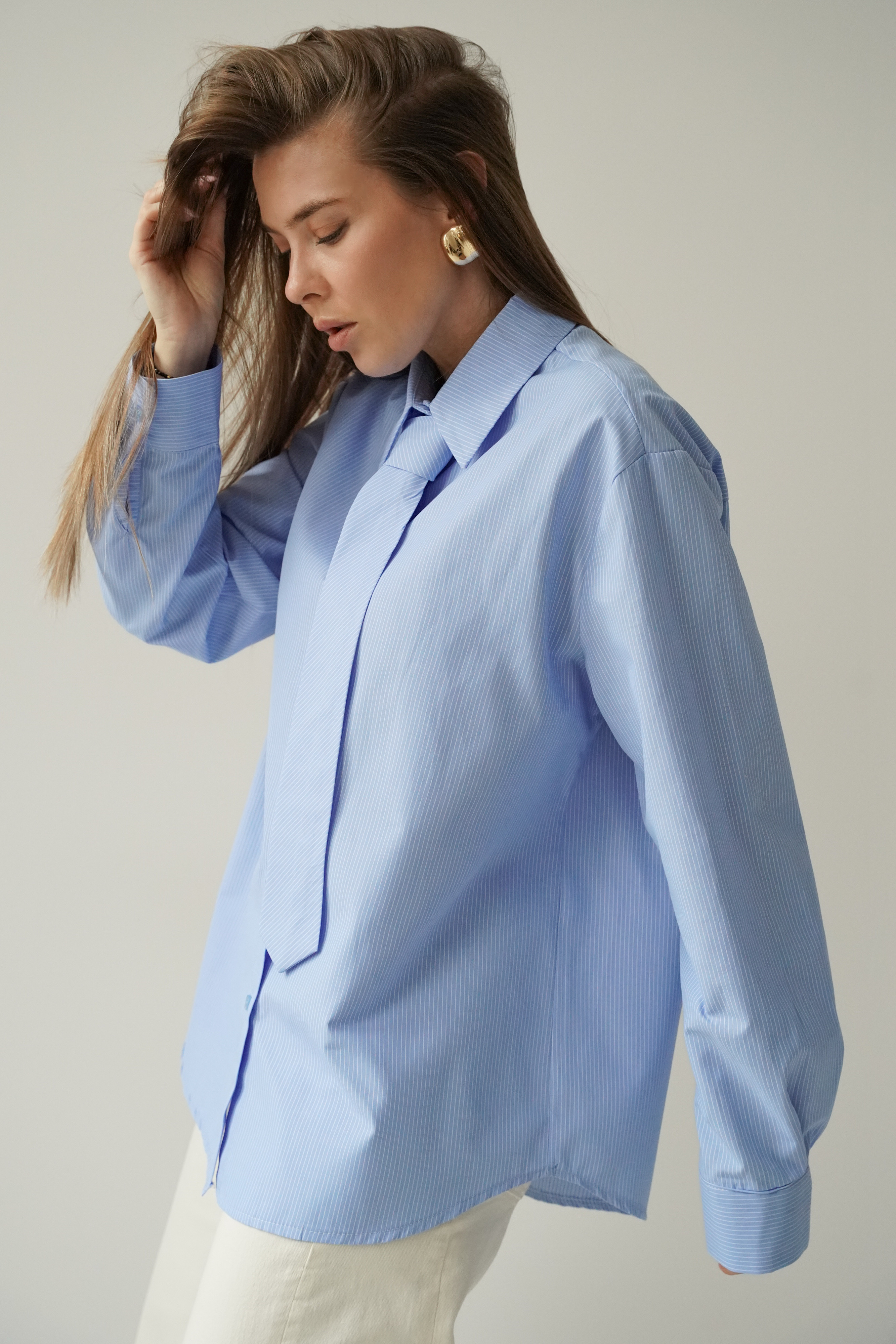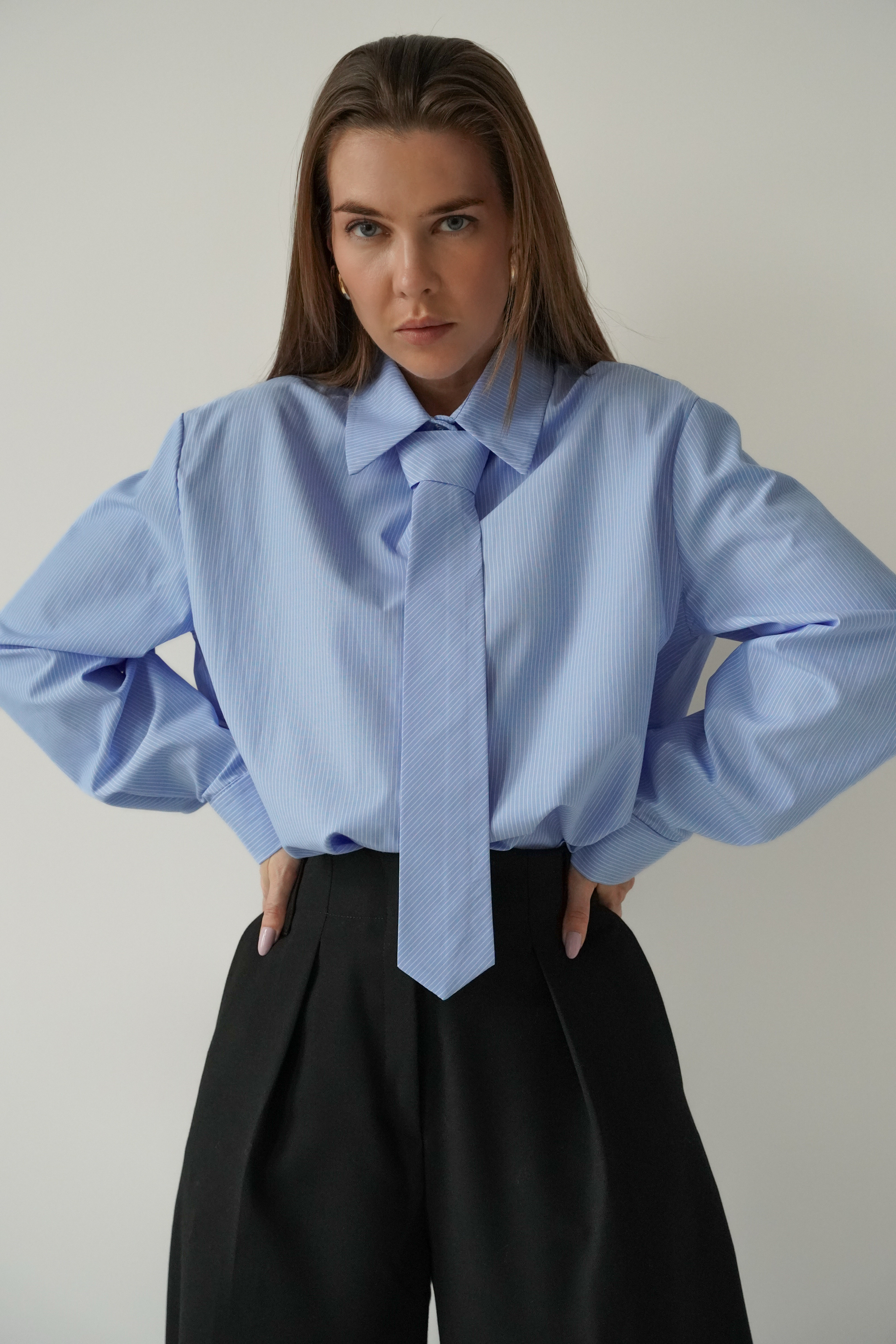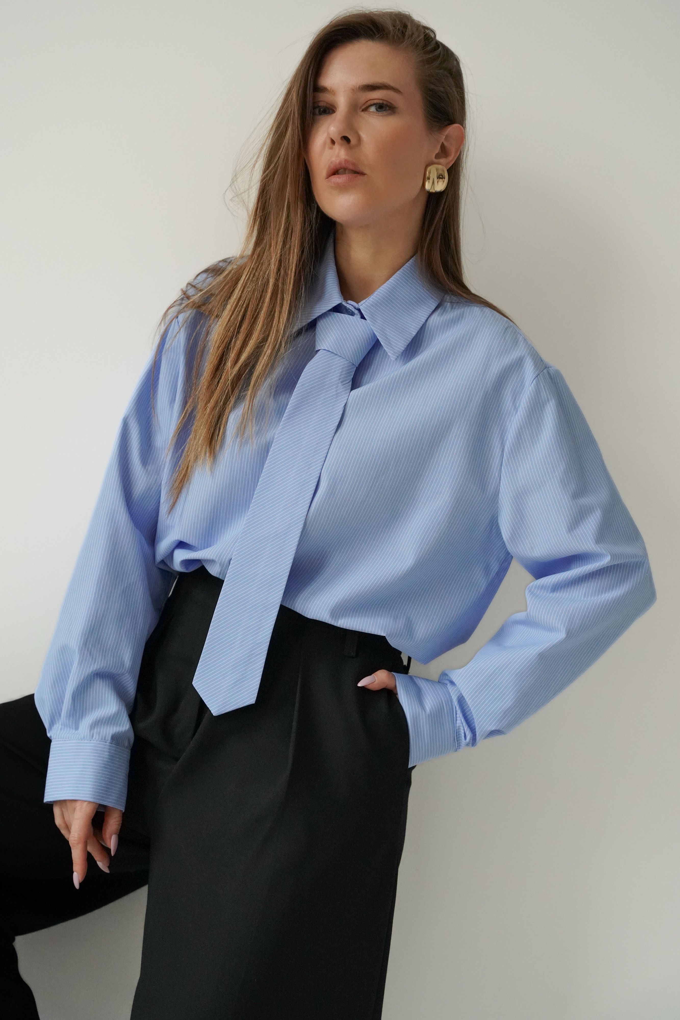 ICON TIE SHIRT to klasyczna koszula z kołnierzykiem, mankietami i zapięciem na guziki, wykonana ze 100% szlachetnej bawełny. Charakterystyczny krawat z tego samego materiału nadaje jej nowoczesny, lekko męski i biurowy charakter. Model zaprojektowany jako ponadczasowa baza do stylizacji od biura po wieczorne wyjścia.