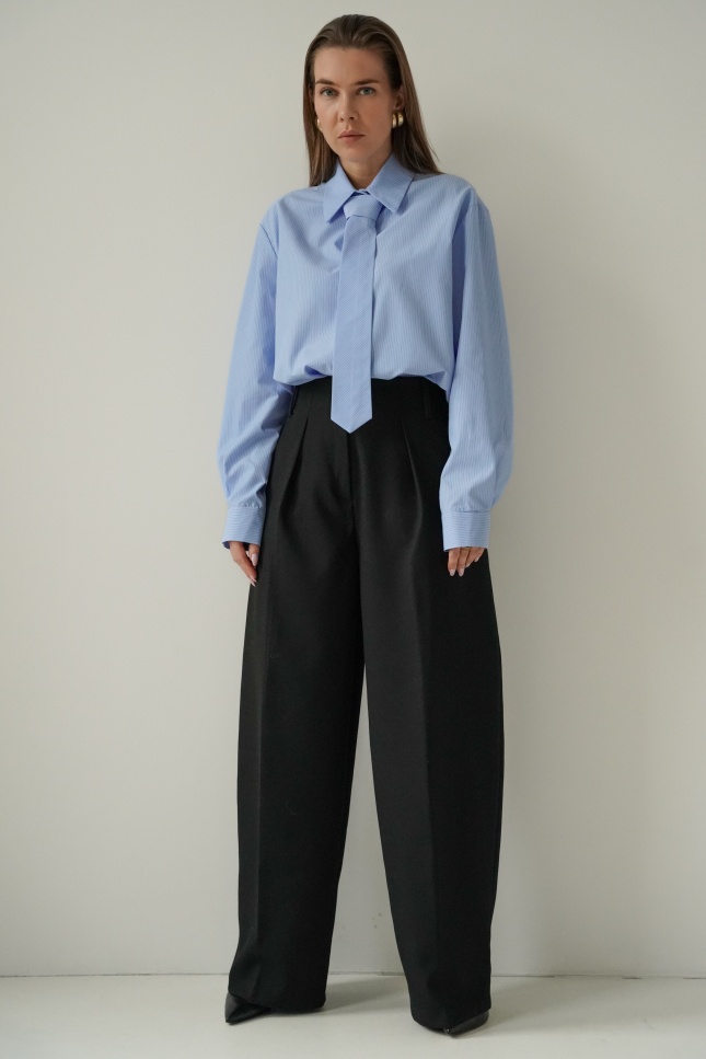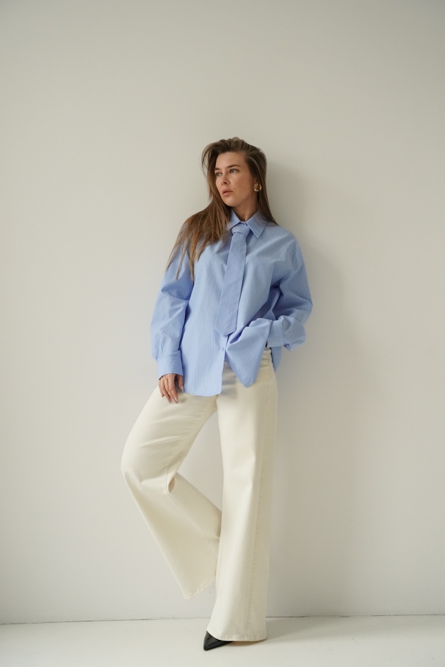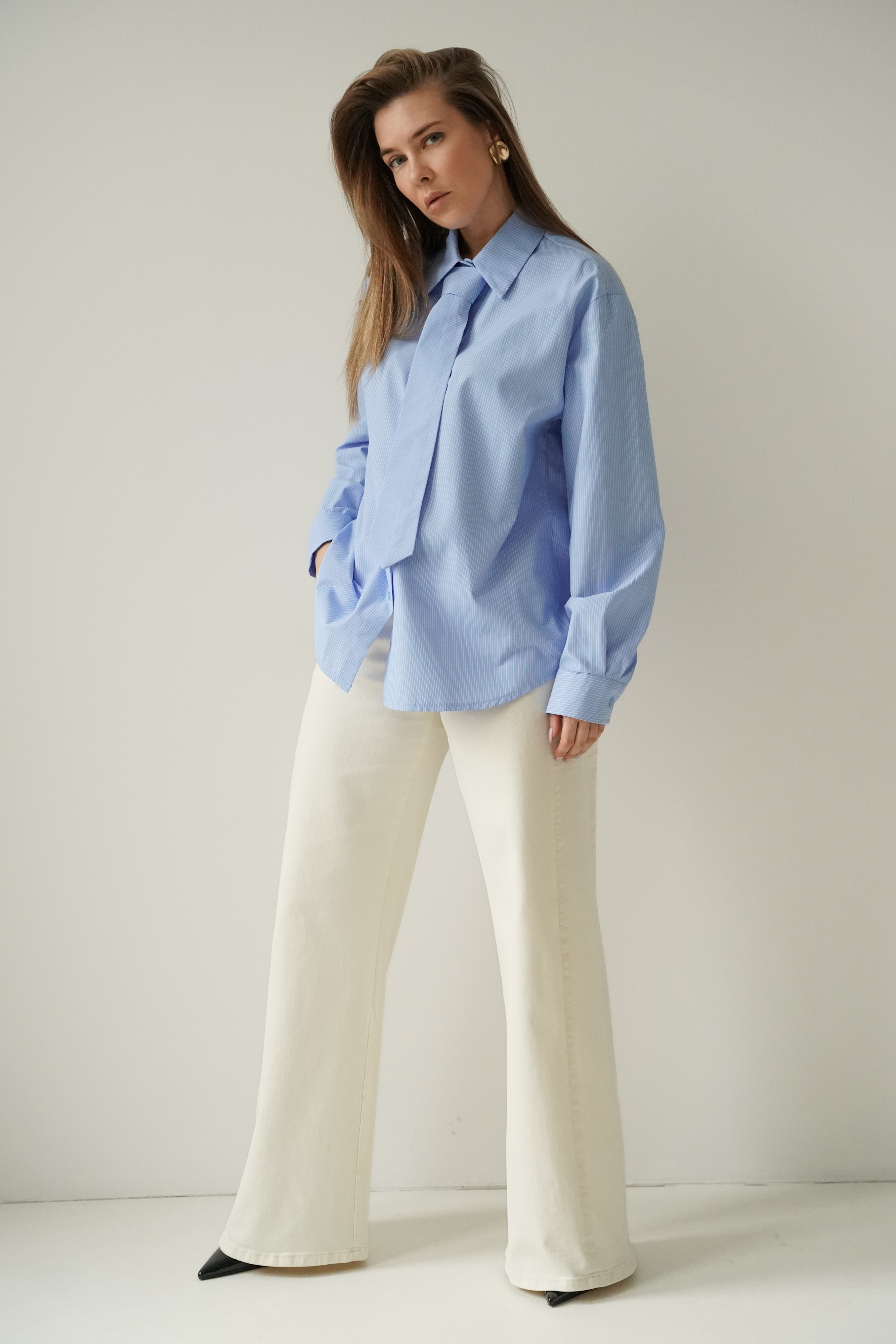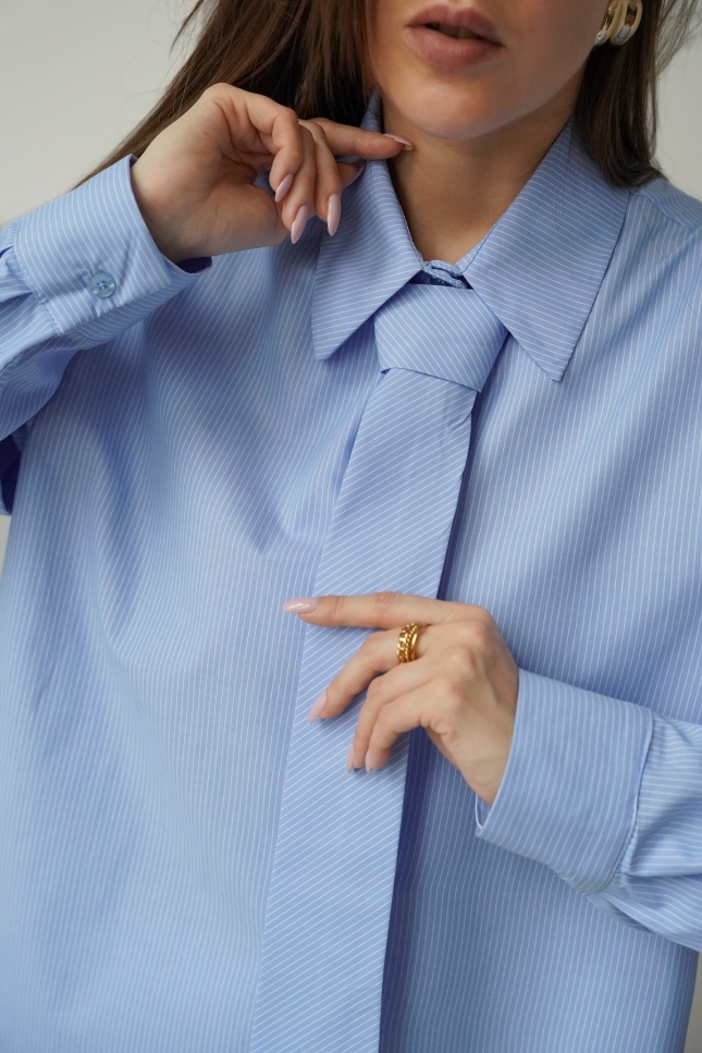 ICON TIE SHIRT to klasyczna koszula z kołnierzykiem, mankietami i zapięciem na guziki, wykonana ze 100% szlachetnej bawełny. Charakterystyczny krawat z tego samego materiału nadaje jej nowoczesny, lekko męski i biurowy charakter. Model zaprojektowany jako ponadczasowa baza do stylizacji od biura po wieczorne wyjścia.