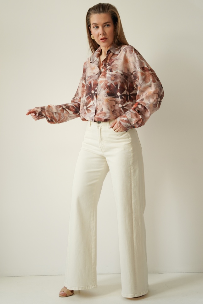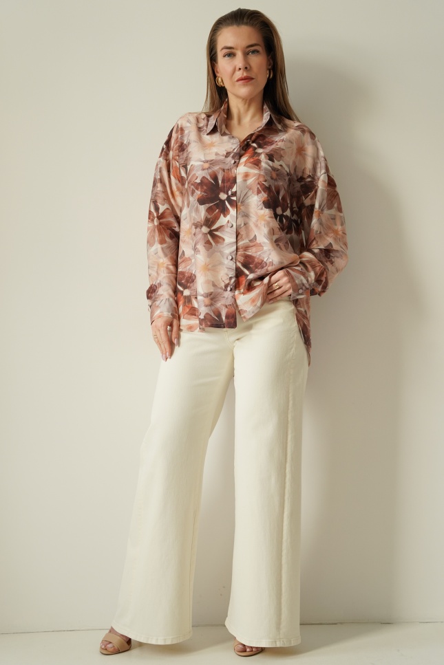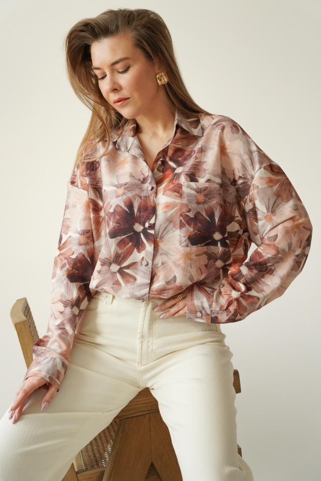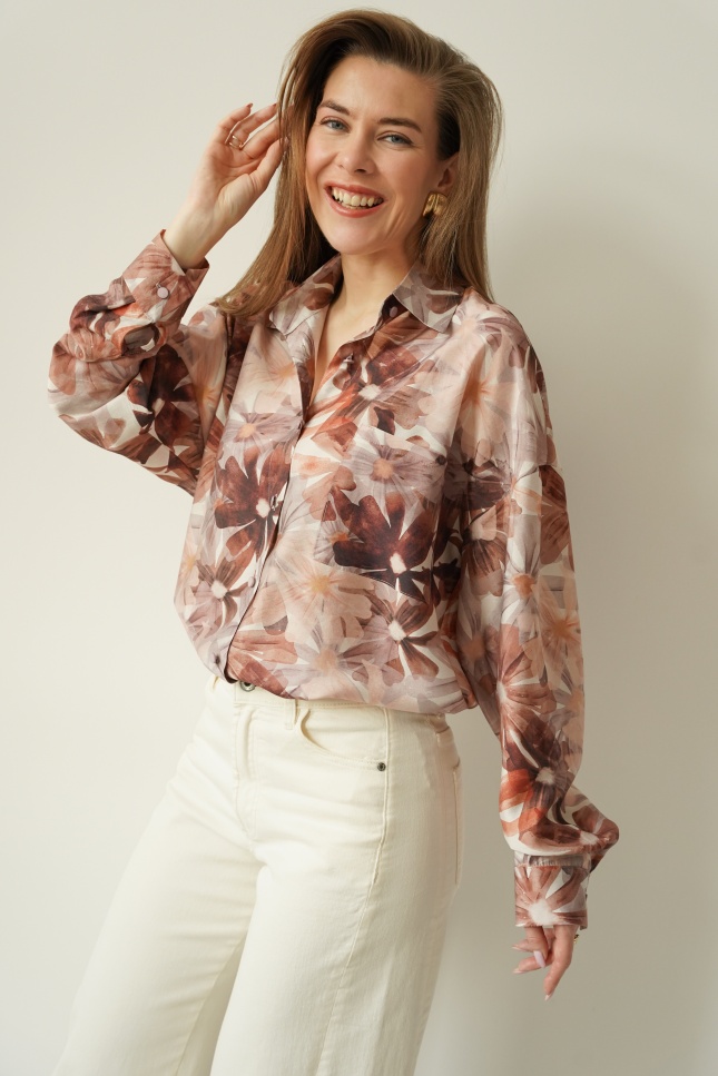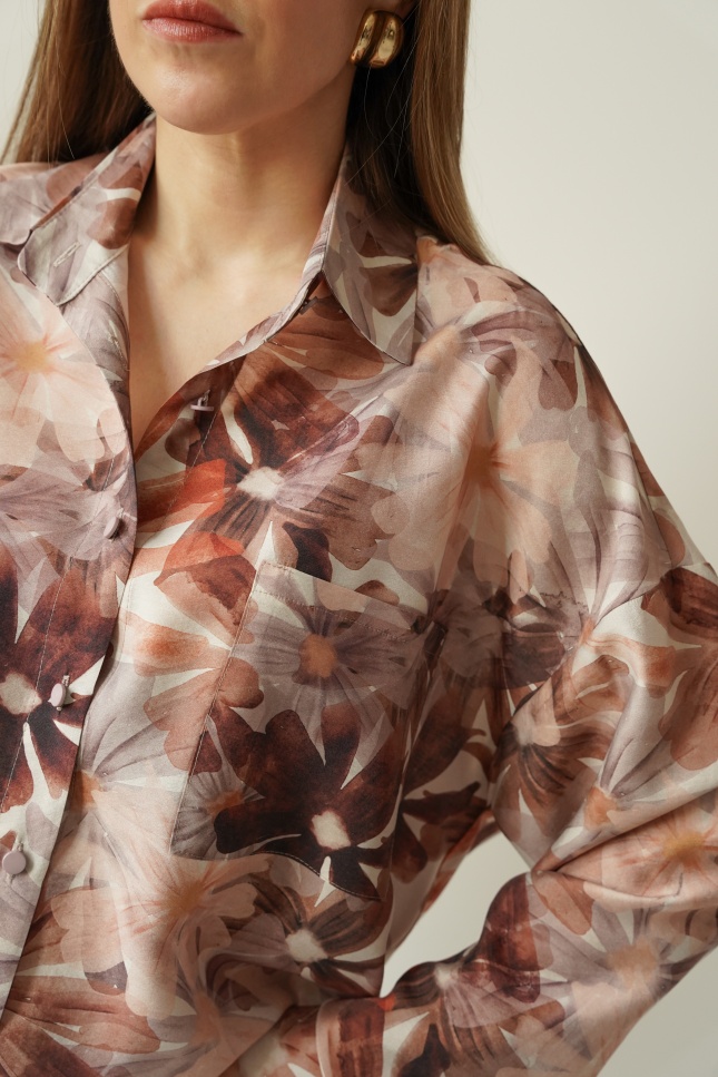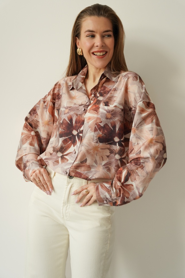 Elegancka koszula w kwiatowy wzór z dodatkiem jedwabiu Florais beige garden