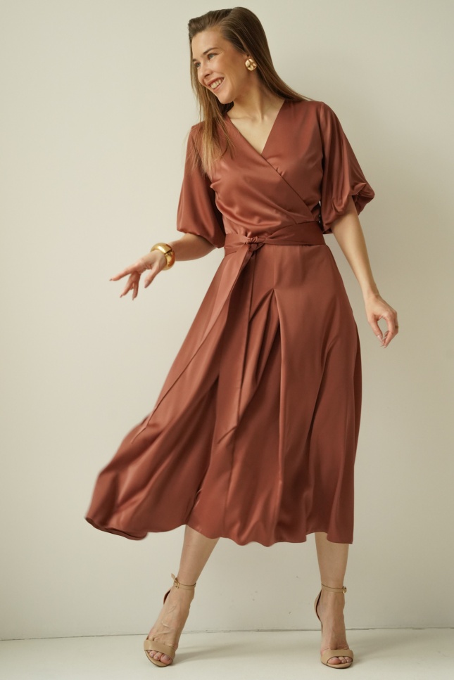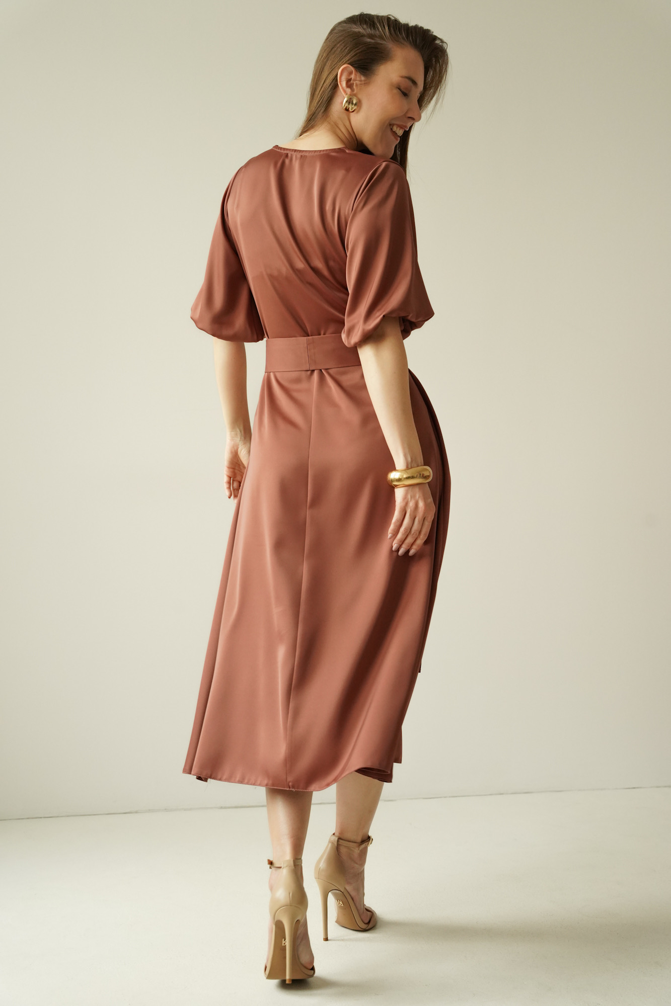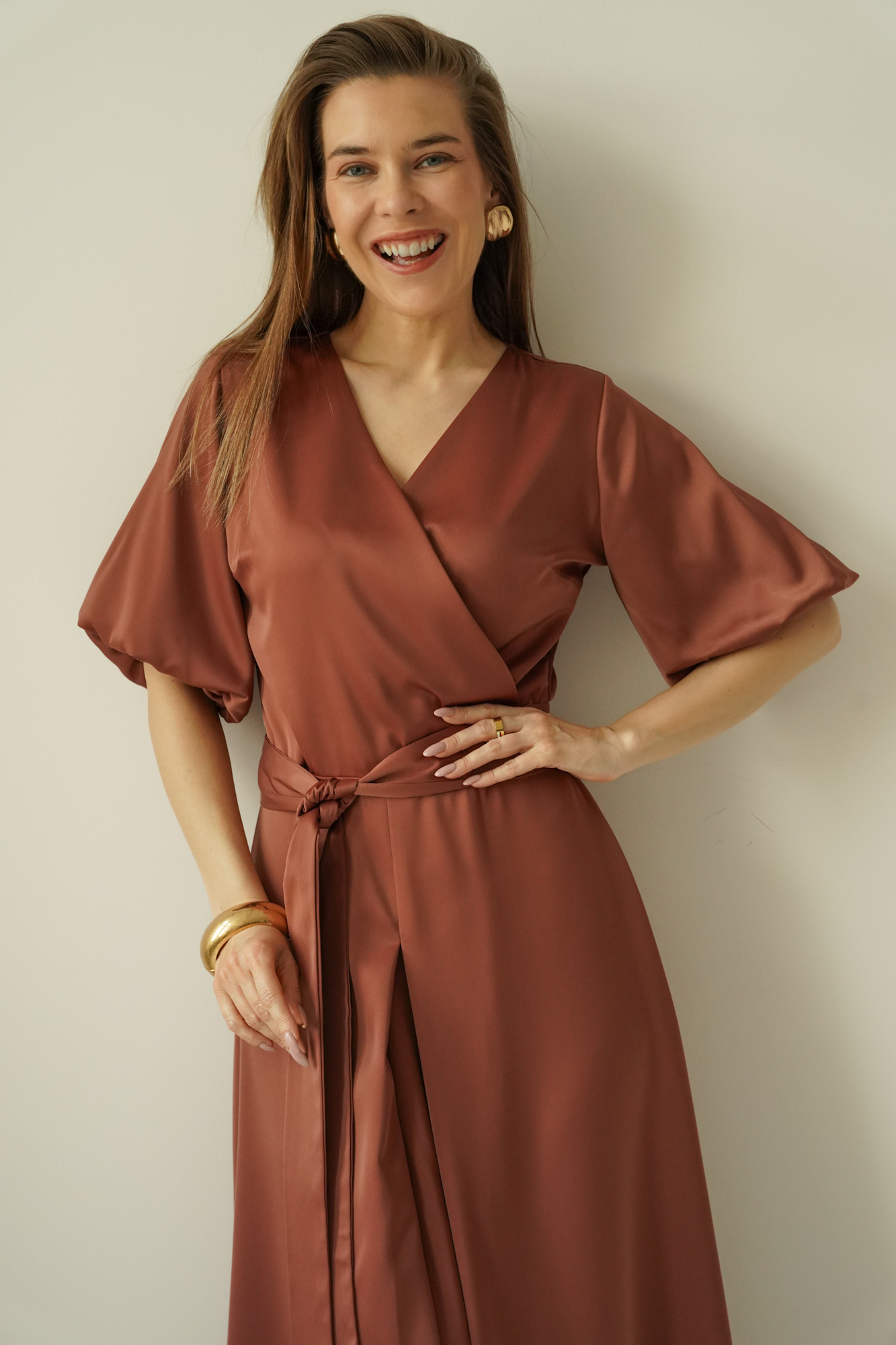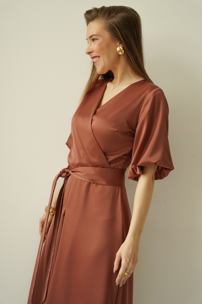 Elegancka sukienka z kopertowym dekoltem Amelia brandy