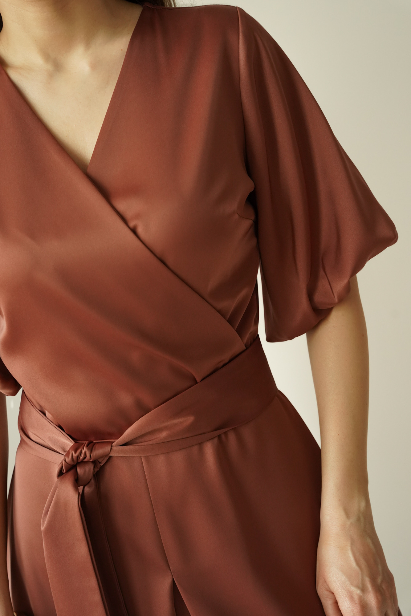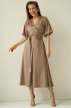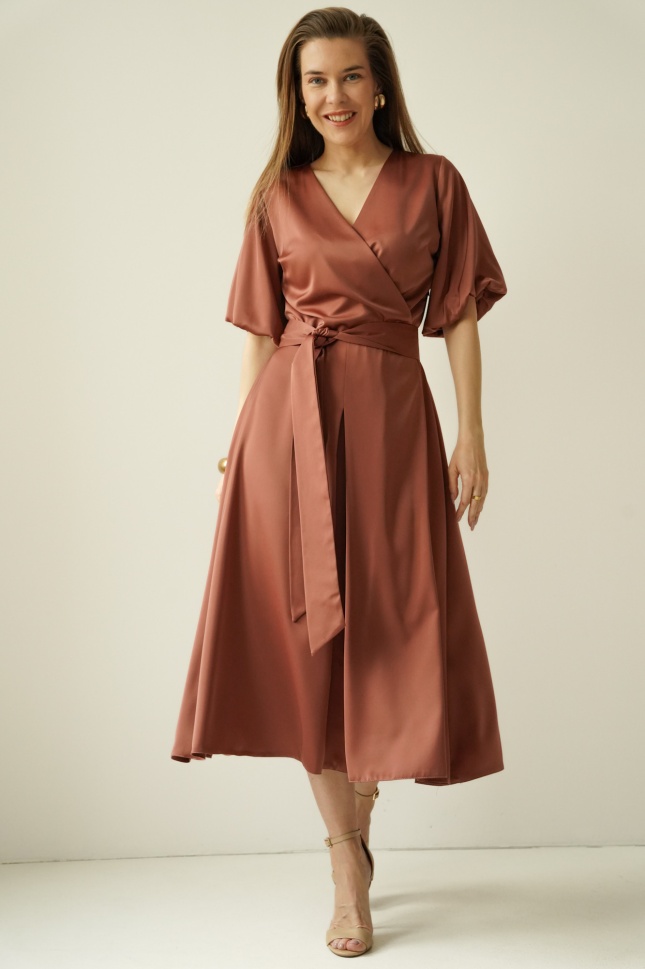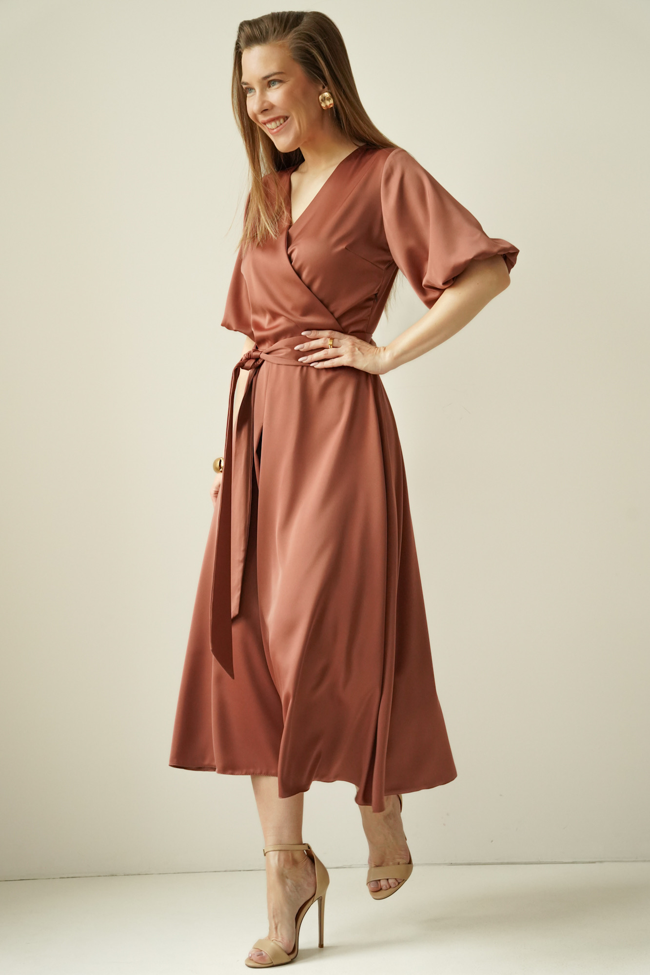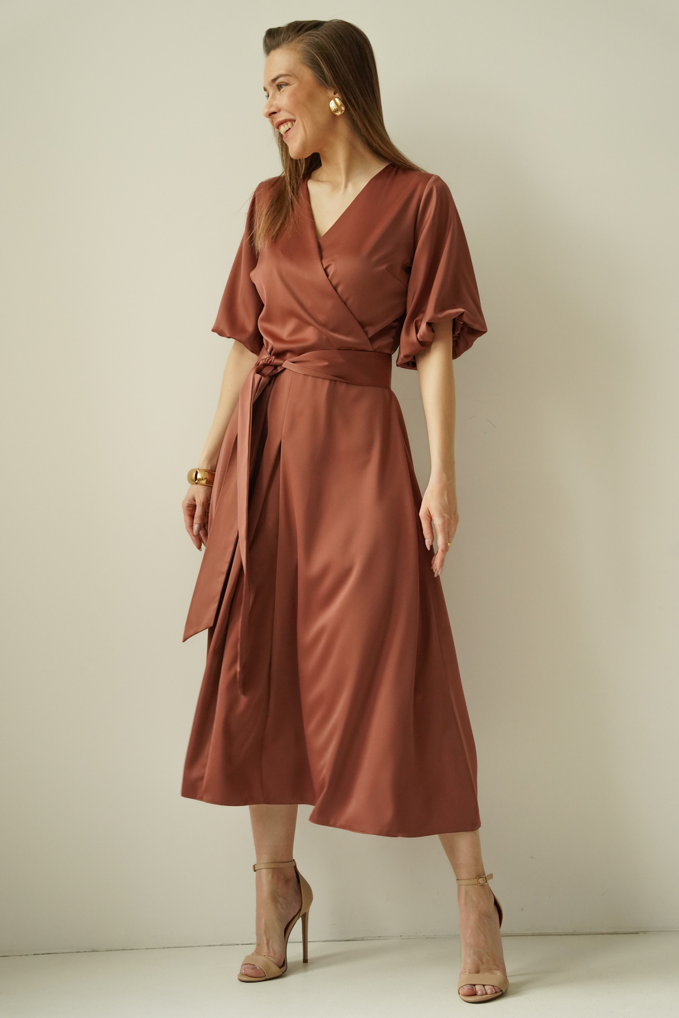 Elegancka sukienka z kopertowym dekoltem Amelia brandy