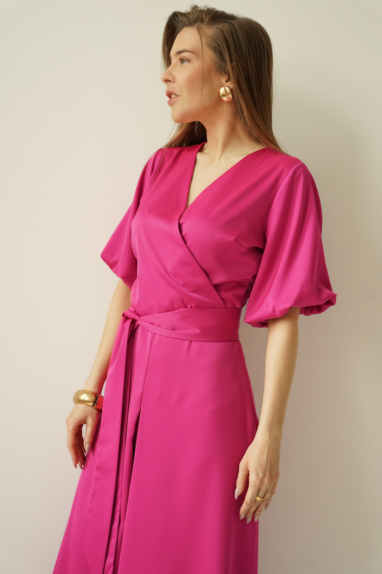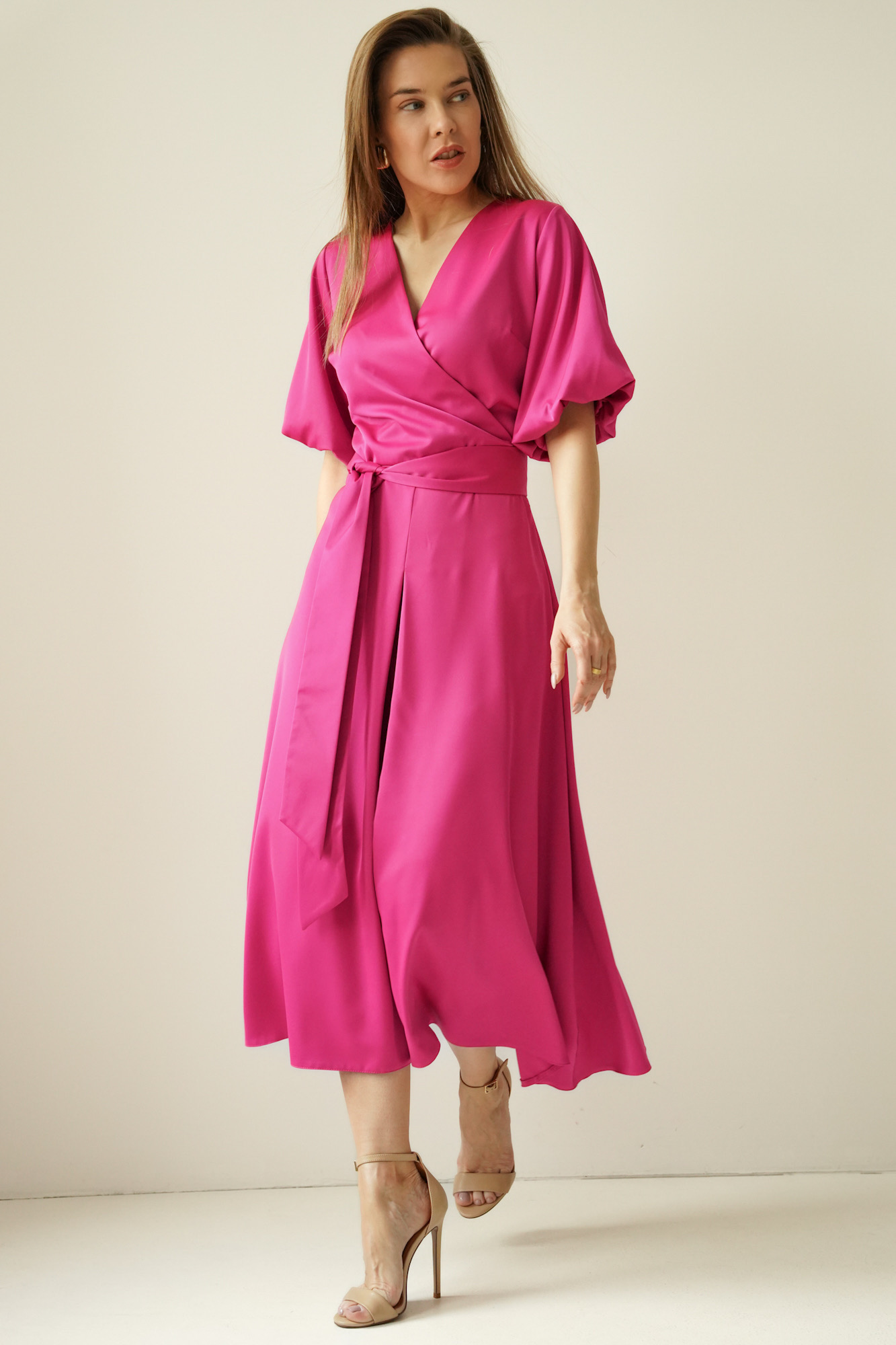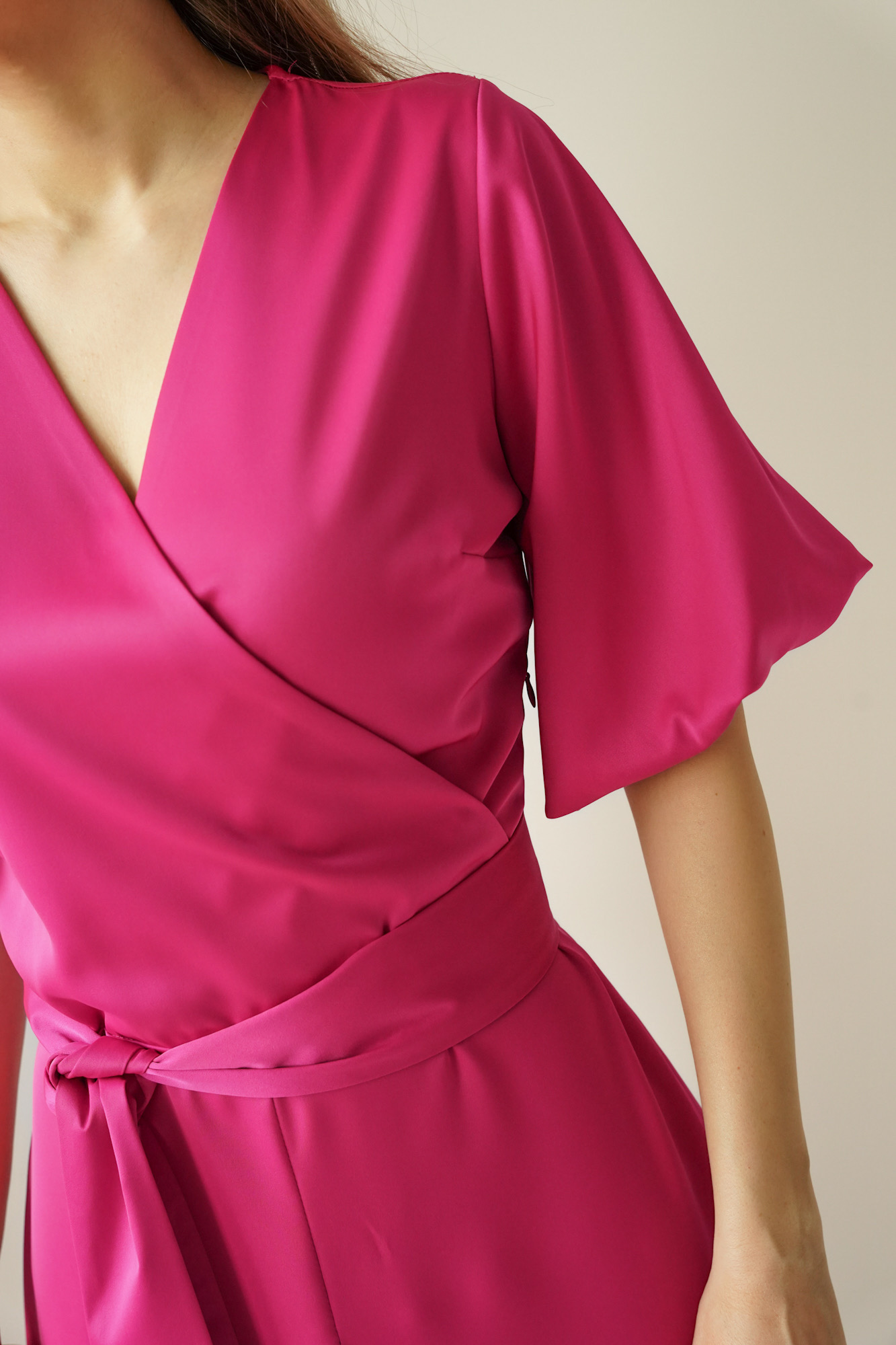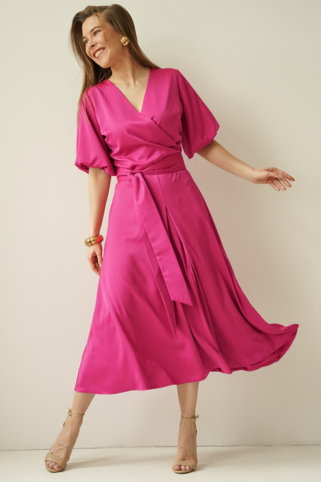 Elegancka sukienka z kopertowym dekoltem Amelia fuksja