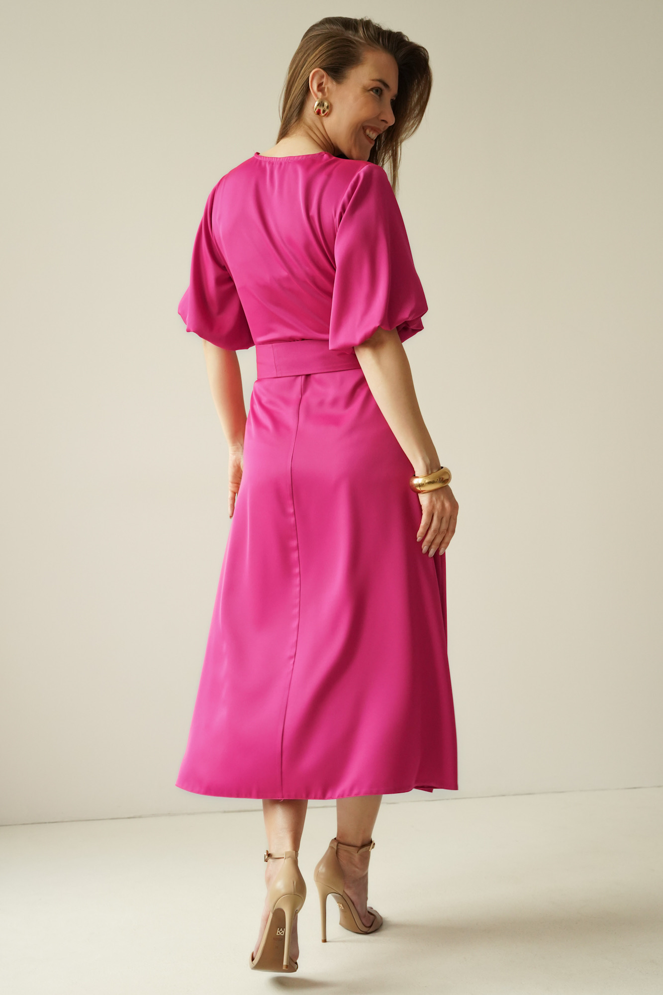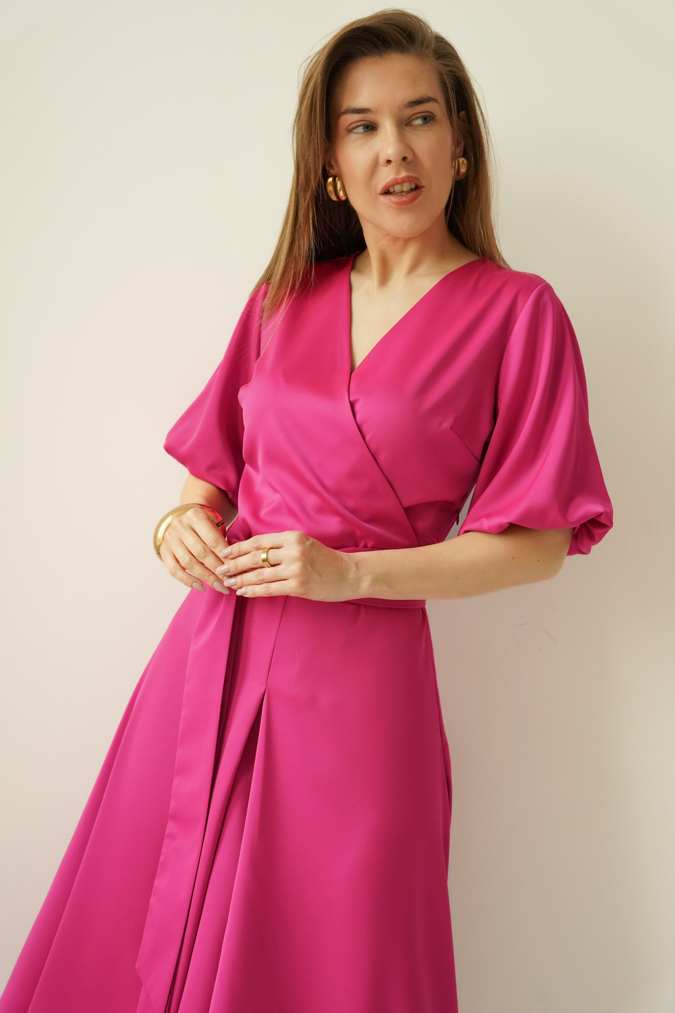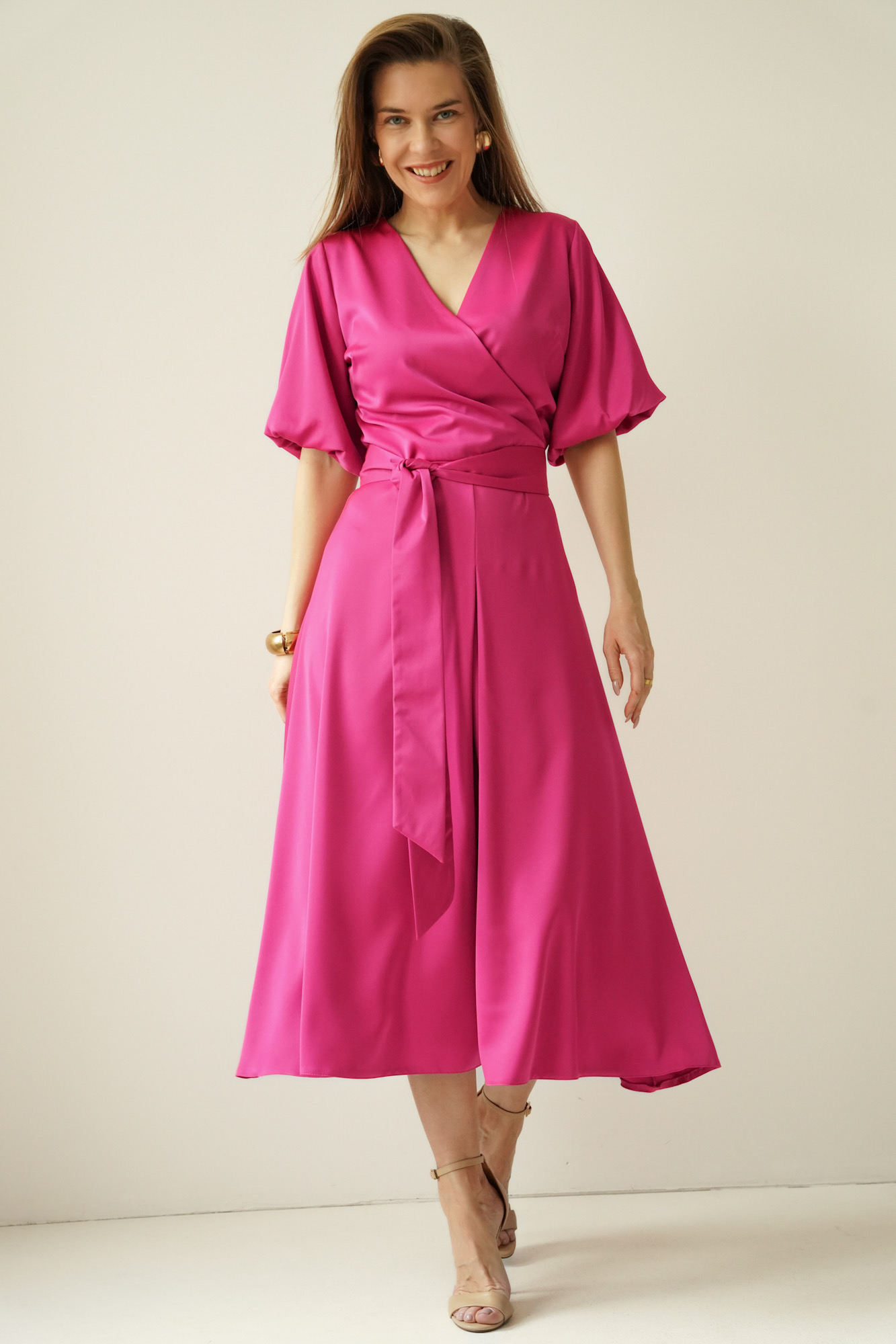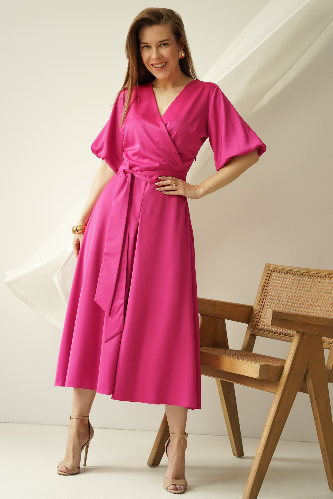 Elegancka sukienka z kopertowym dekoltem Amelia fuksja