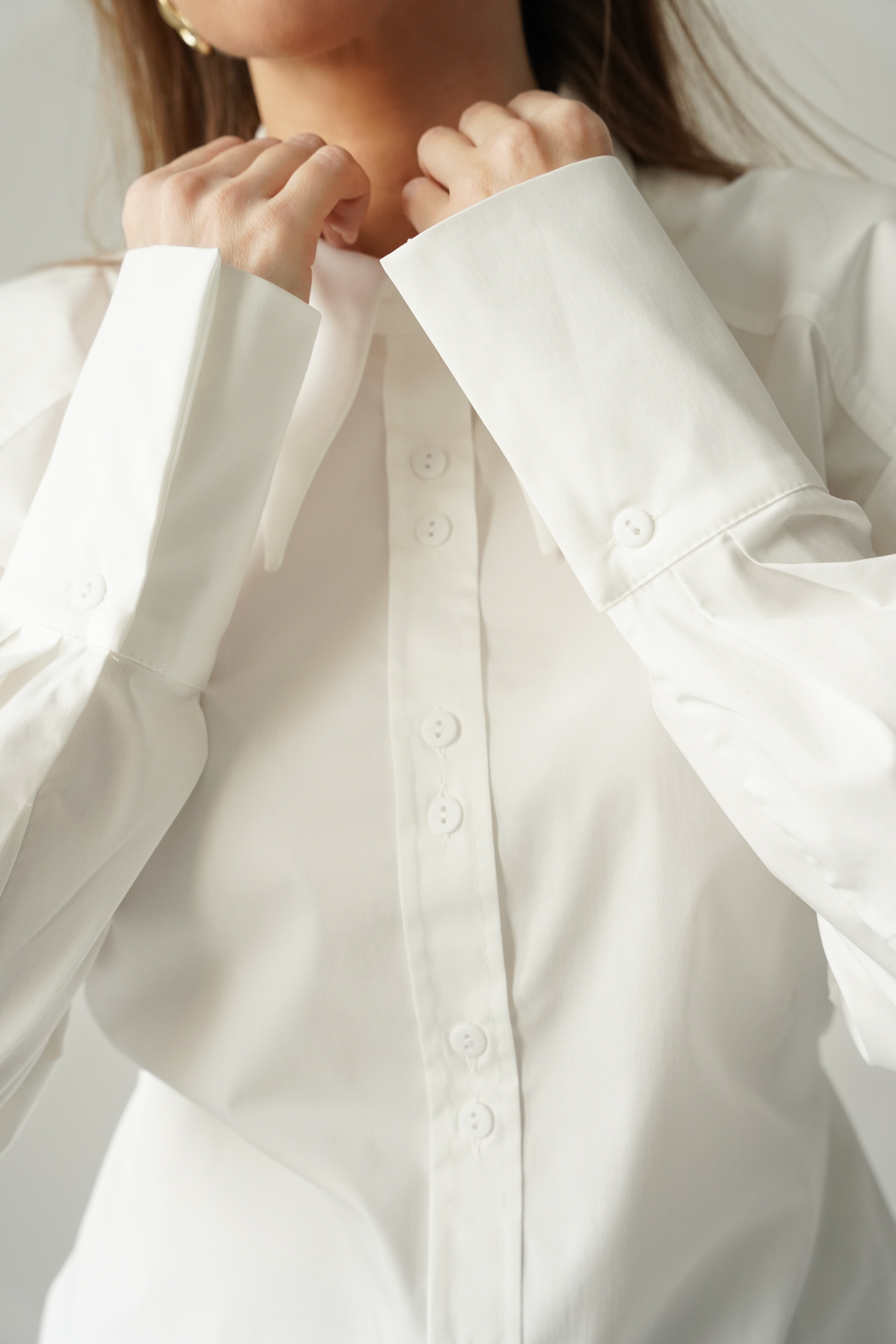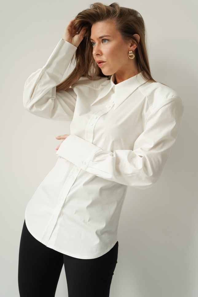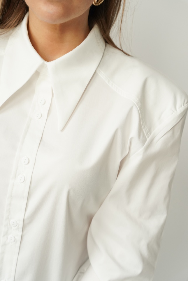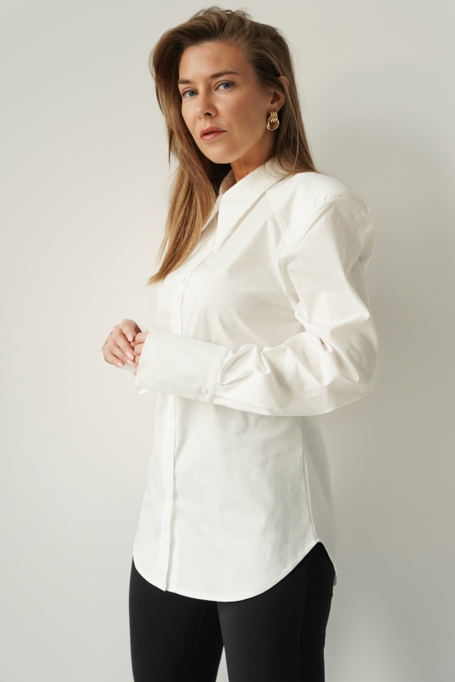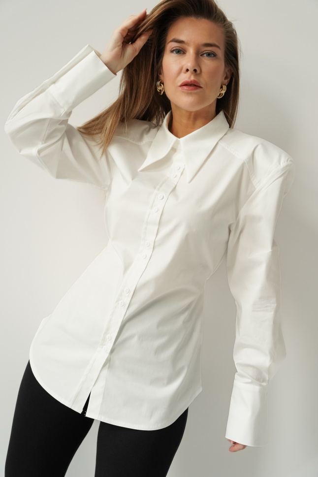 Elegancka, biała koszula „Allegra”, wykonana z miękkiej mieszanki bawełny i wiskozy. Lekko dopasowany, dłuższy fason z taliowaniem i dekoracyjnym paseczkiem, który podkreśla linię talii. Poduszki w ramionach tworzą nowoczesną, wysmukloną sylwetkę. Klasyczny kołnierzyk, mankiety i guziki dopełniają minimalistycznego, premium charakteru.