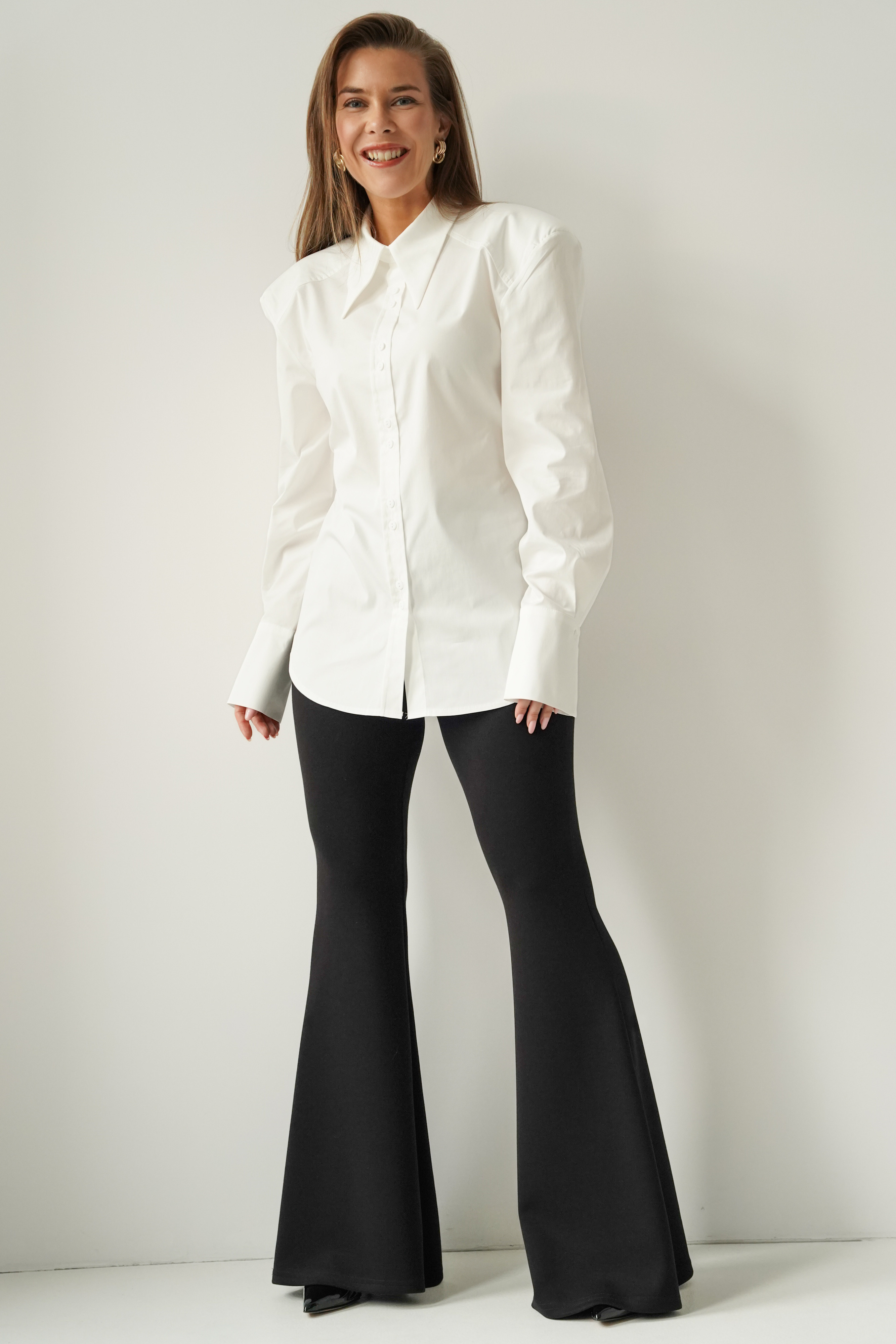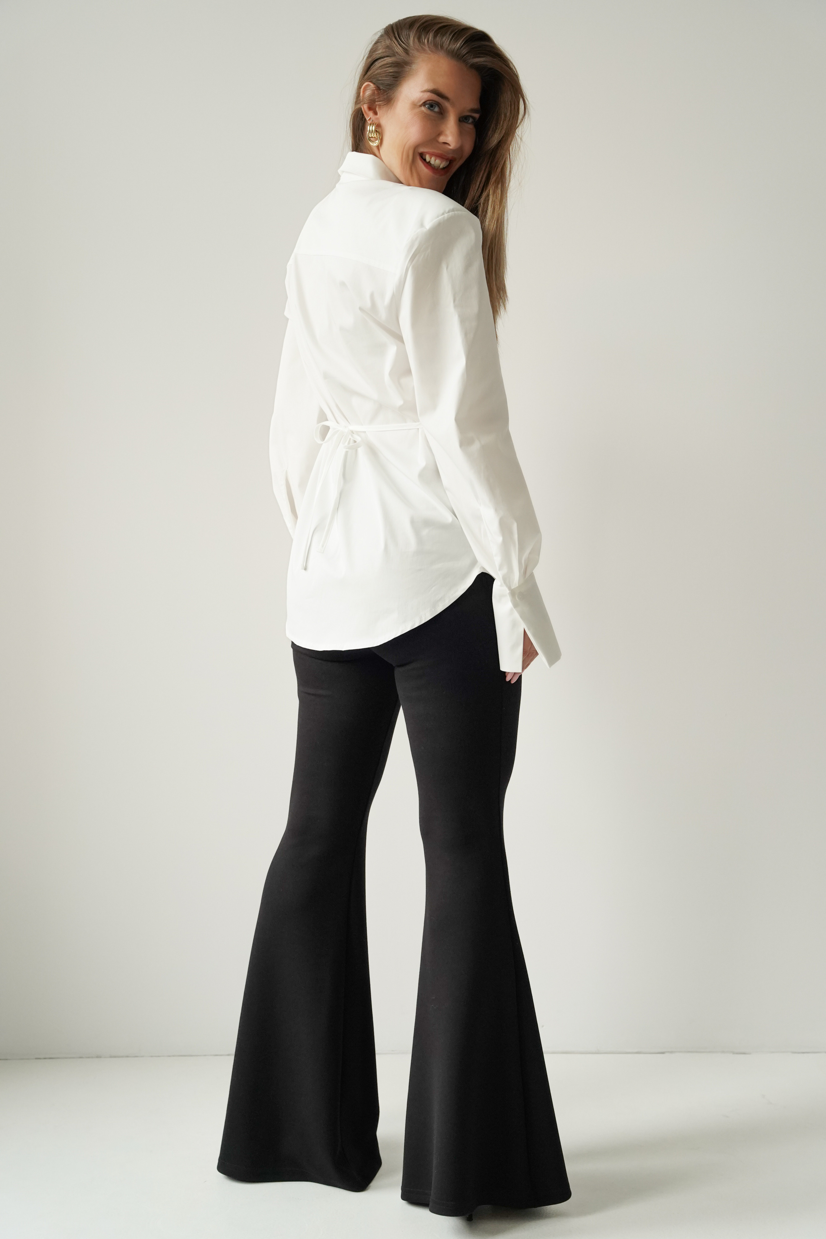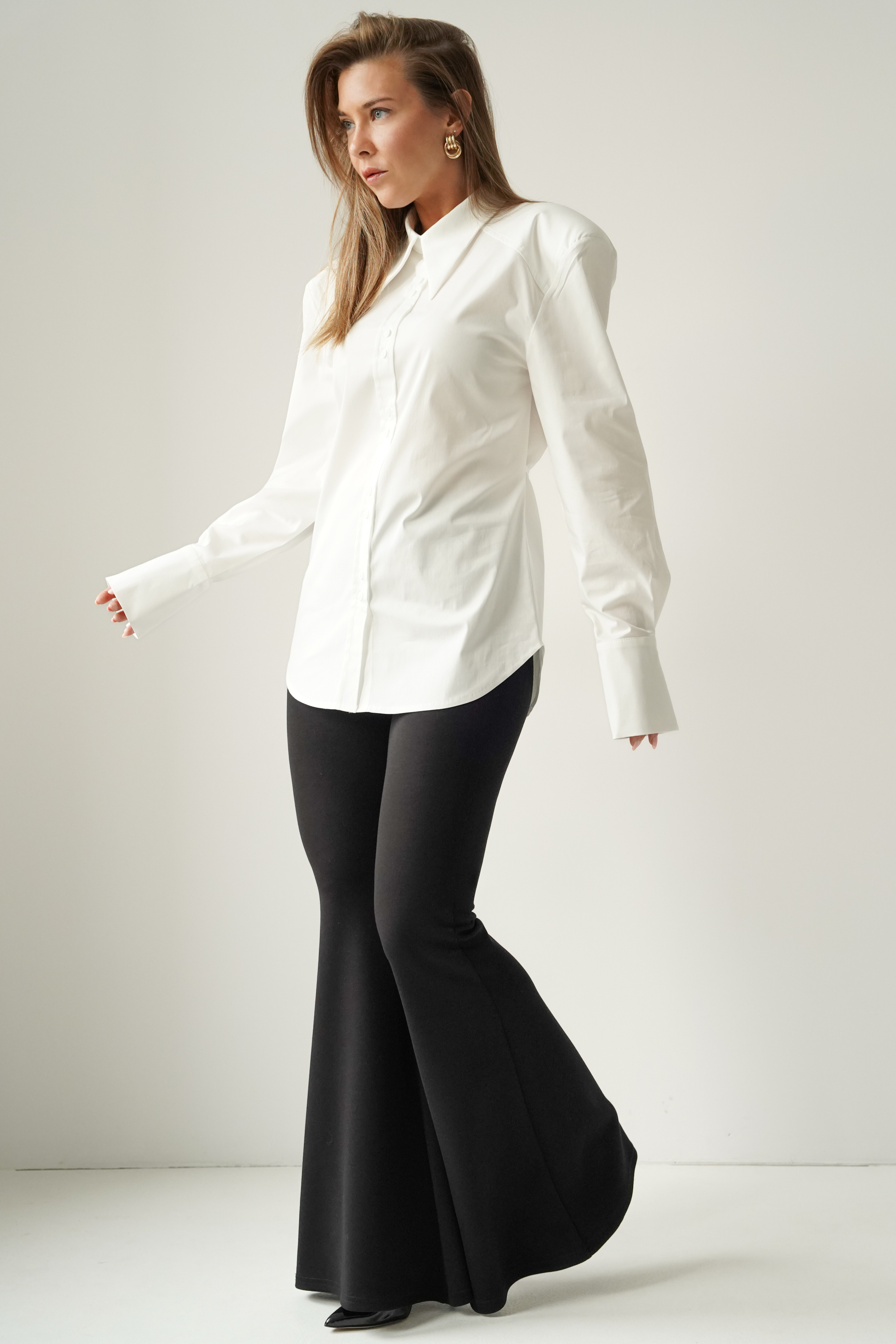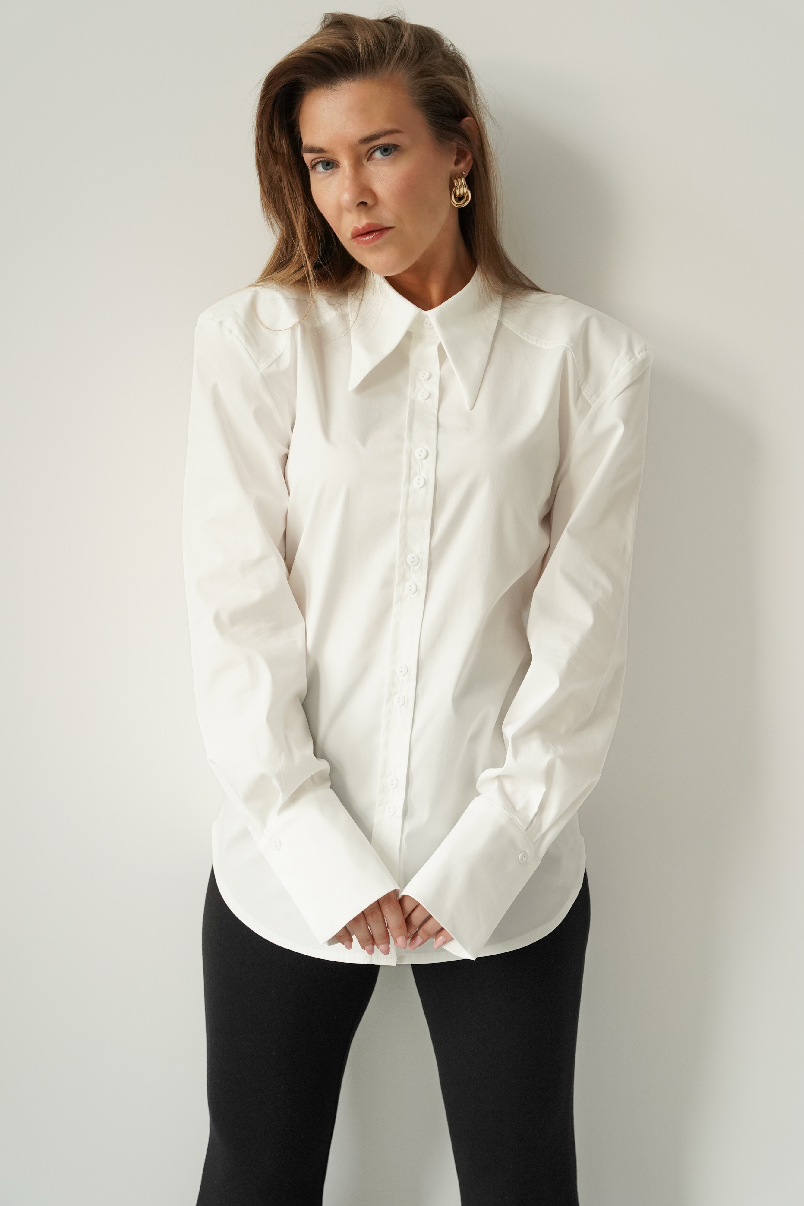 Elegancka, biała koszula „Allegra”, wykonana z miękkiej mieszanki bawełny i wiskozy. Lekko dopasowany, dłuższy fason z taliowaniem i dekoracyjnym paseczkiem, który podkreśla linię talii. Poduszki w ramionach tworzą nowoczesną, wysmukloną sylwetkę. Klasyczny kołnierzyk, mankiety i guziki dopełniają minimalistycznego, premium charakteru.