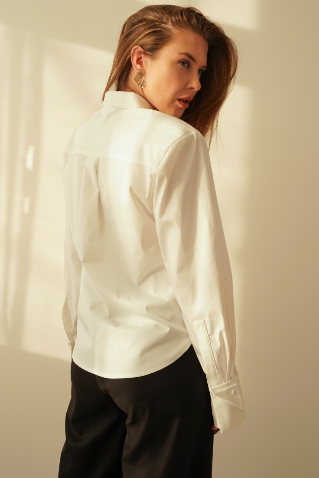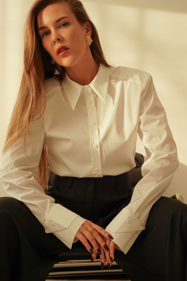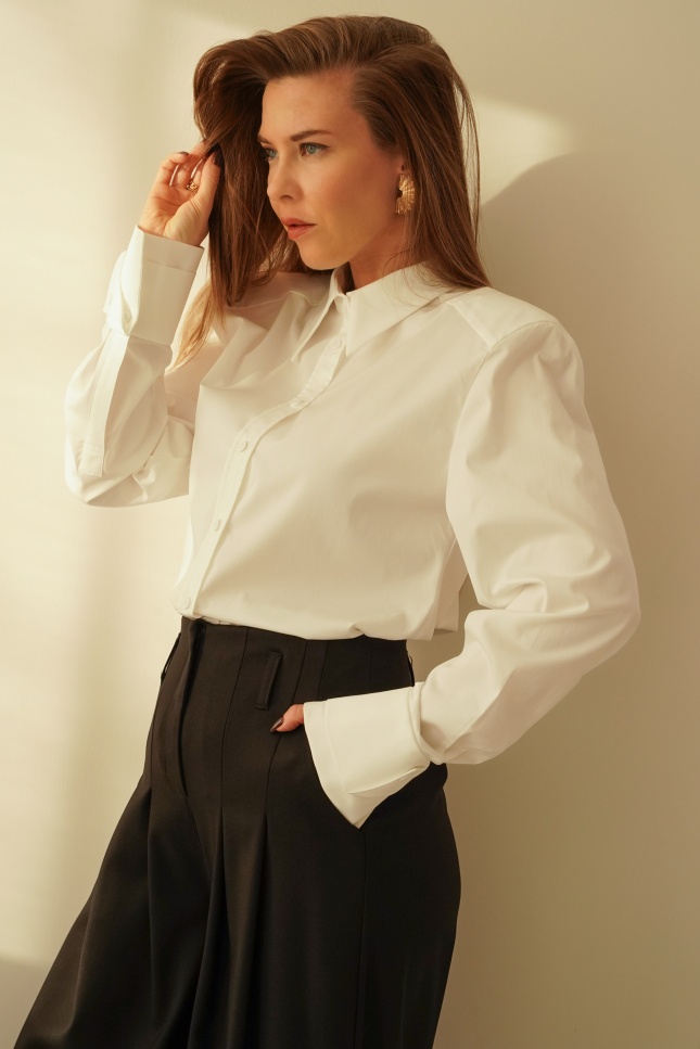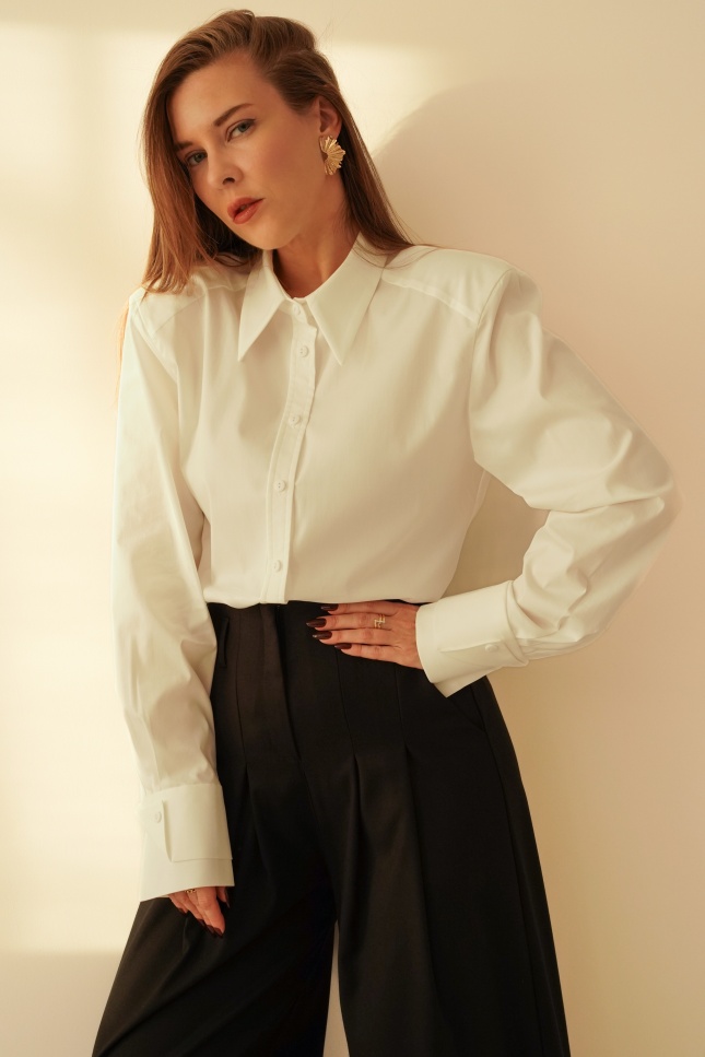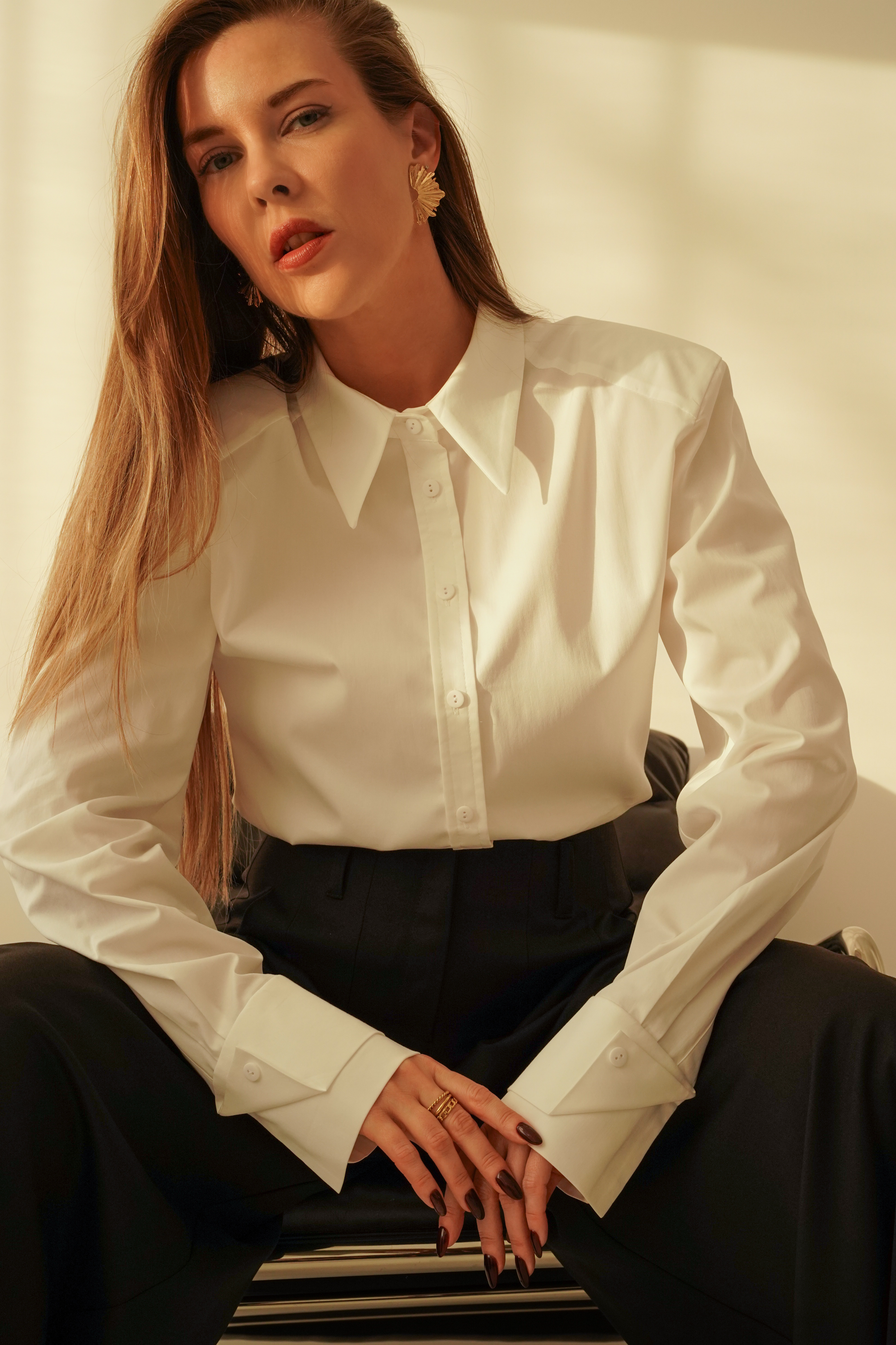 „Cynthia” – elegancka biała koszula o taliowanym fasonie, z subtelnie wzmocnioną linią ramion i unikatowymi podwójnymi mankietami. Nowoczesna interpretacja ponadczasowej klasyki, która podkreśla sylwetkę i dodaje minimalistycznej, couture’owej elegancji. Idealna do stylizacji w duchu quiet luxury.