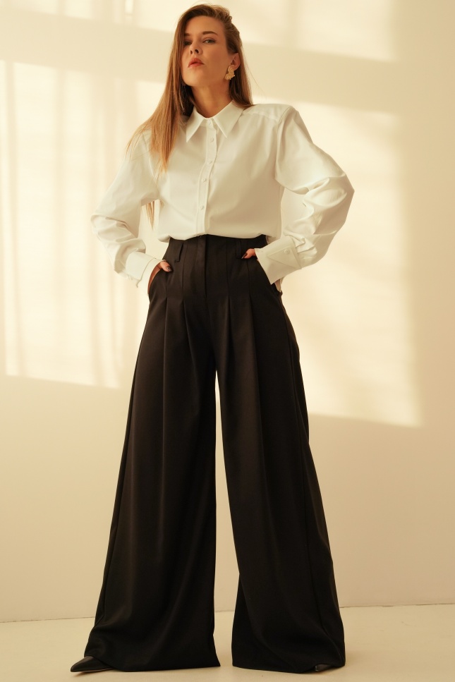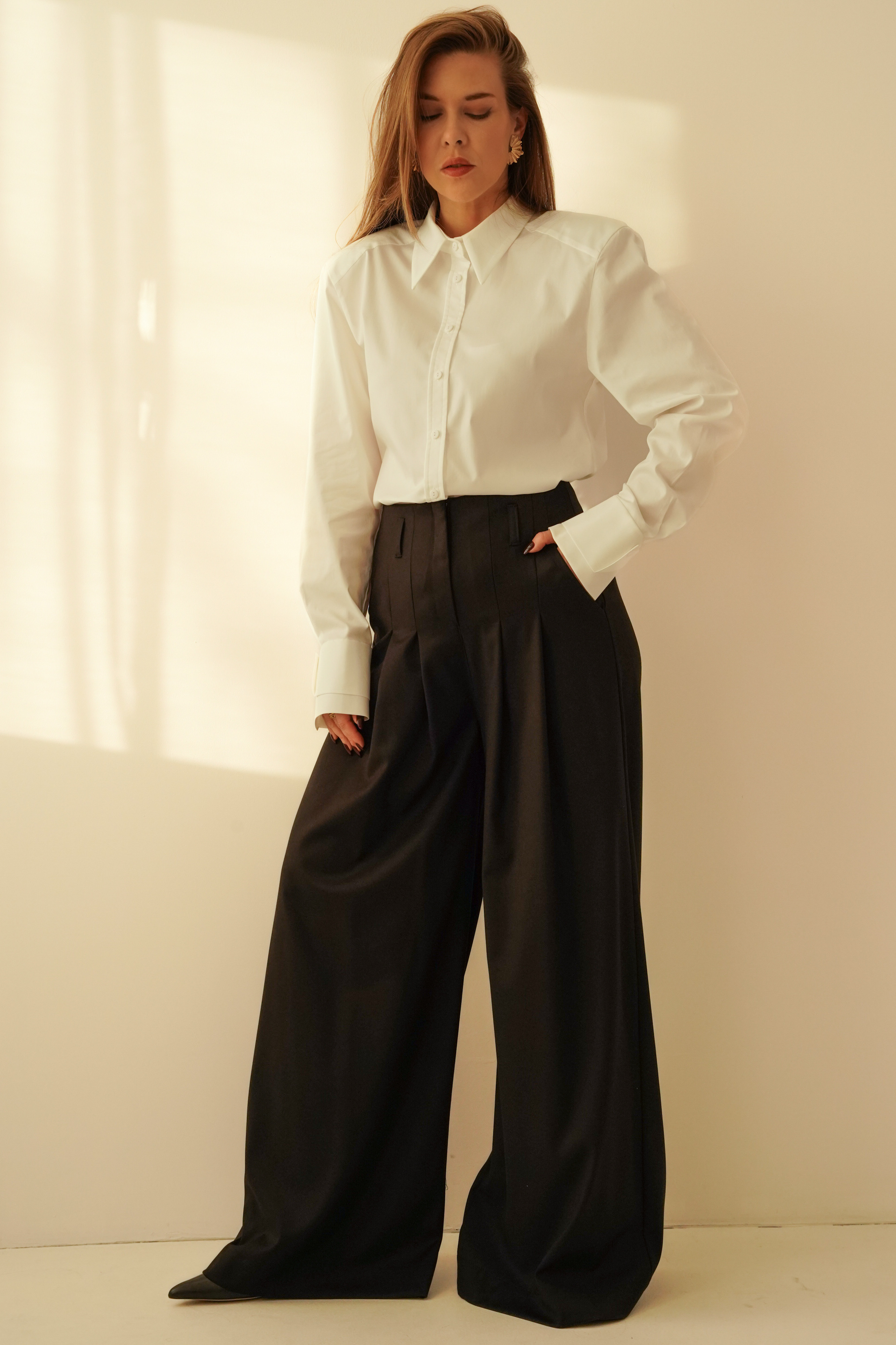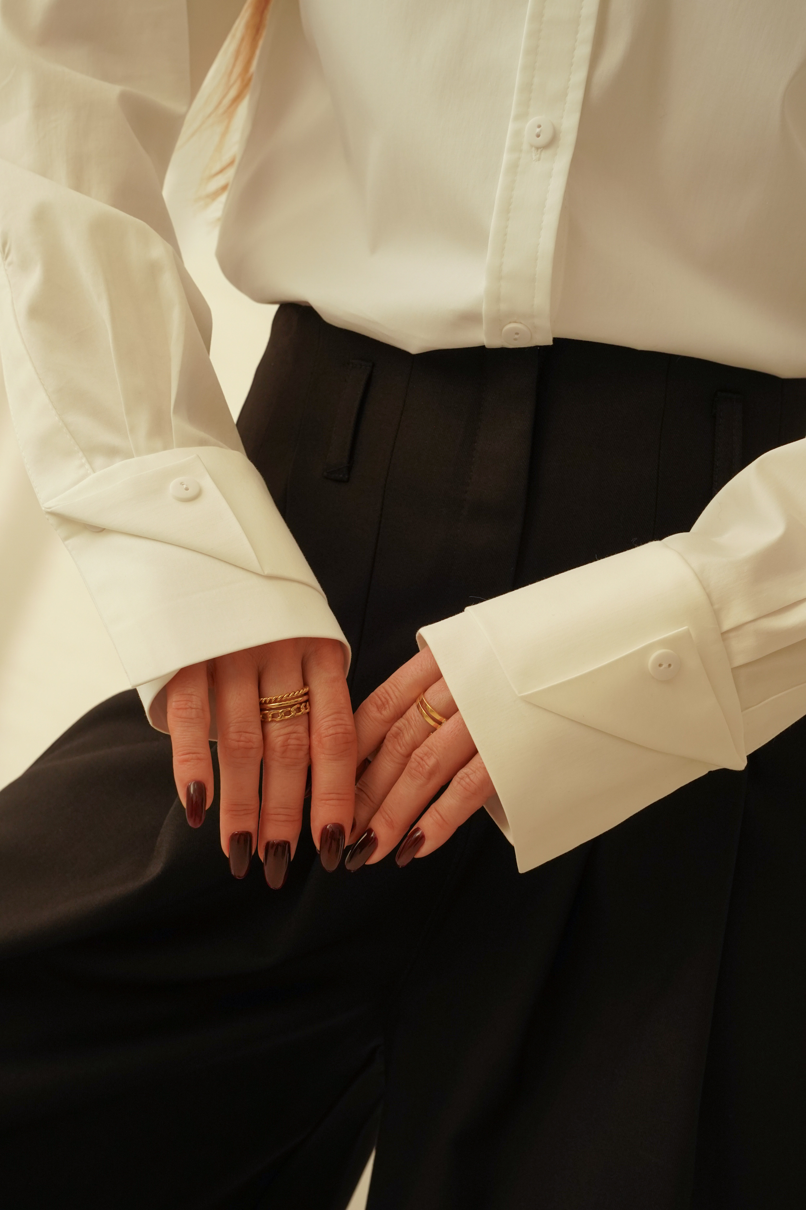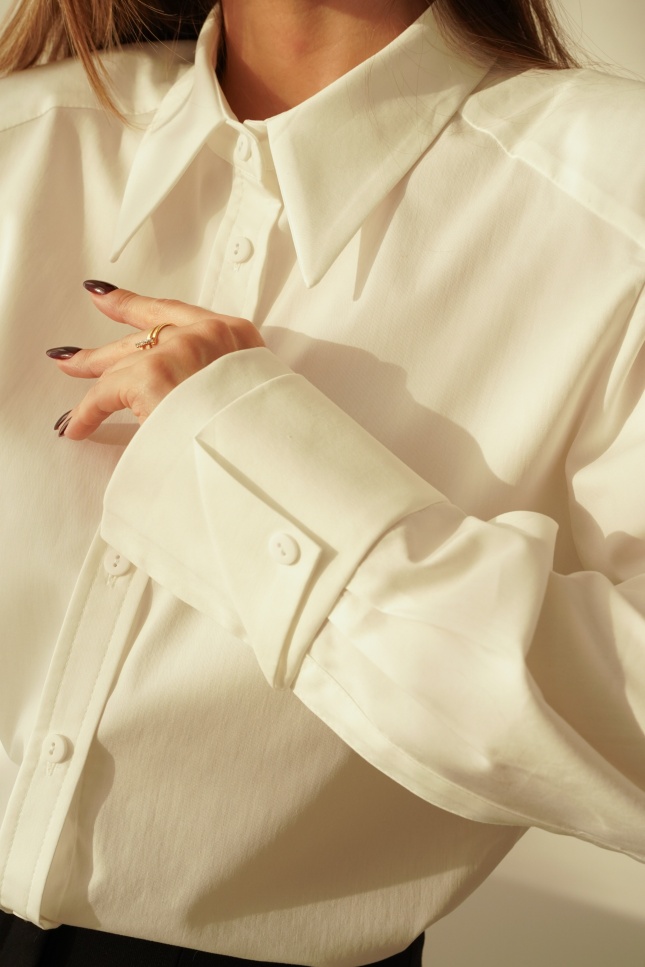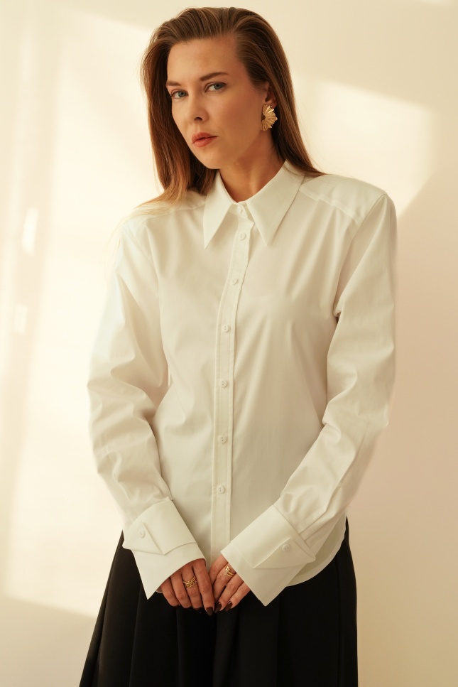 „Cynthia” – elegancka biała koszula o taliowanym fasonie, z subtelnie wzmocnioną linią ramion i unikatowymi podwójnymi mankietami. Nowoczesna interpretacja ponadczasowej klasyki, która podkreśla sylwetkę i dodaje minimalistycznej, couture’owej elegancji. Idealna do stylizacji w duchu quiet luxury.