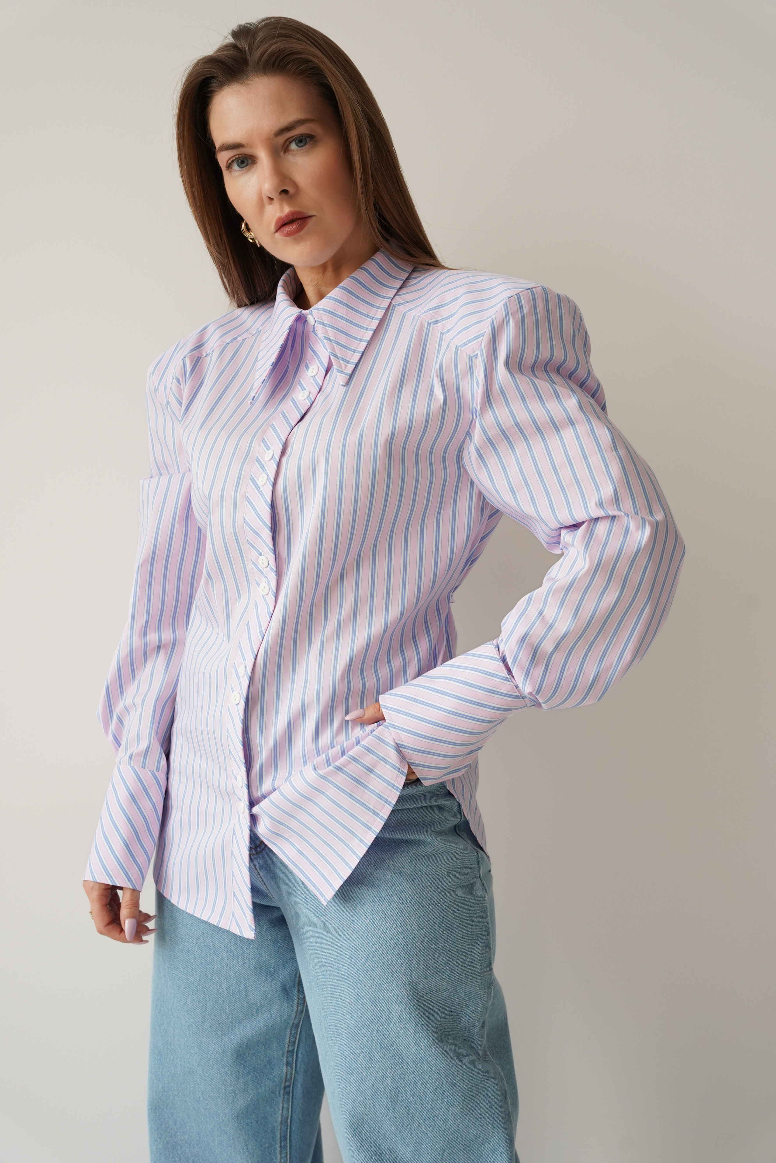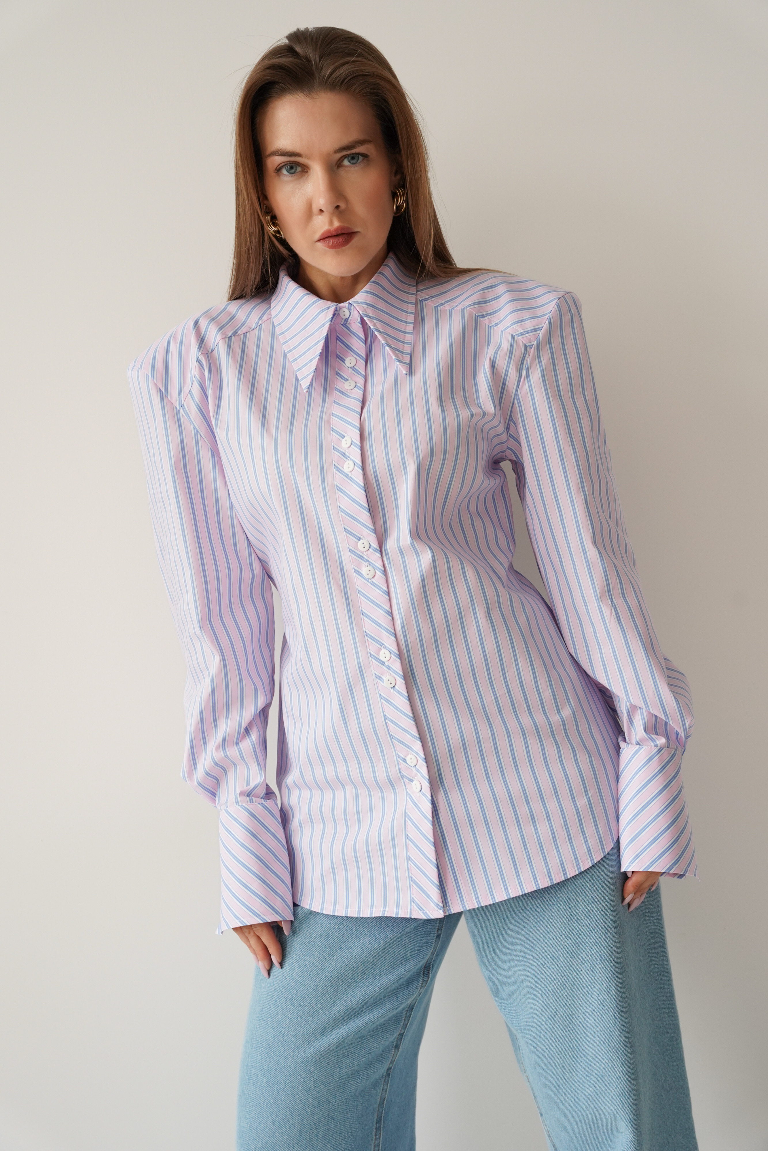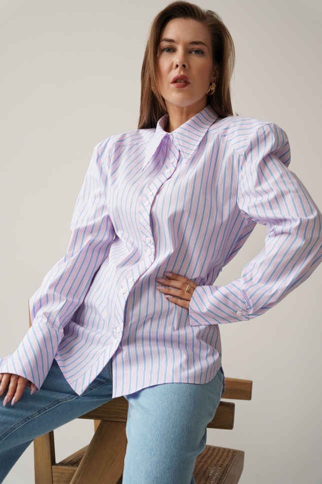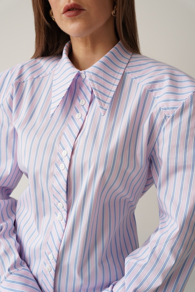 Elegancka koszula „Allegra”, wykonana z miękkiej mieszanki bawełny i wiskozy. Lekko dopasowany, dłuższy fason z taliowaniem i dekoracyjnym paseczkiem, który podkreśla linię talii. Poduszki w ramionach tworzą nowoczesną, wysmukloną sylwetkę. Klasyczny kołnierzyk, mankiety i guziki dopełniają minimalistycznego, premium charakteru.