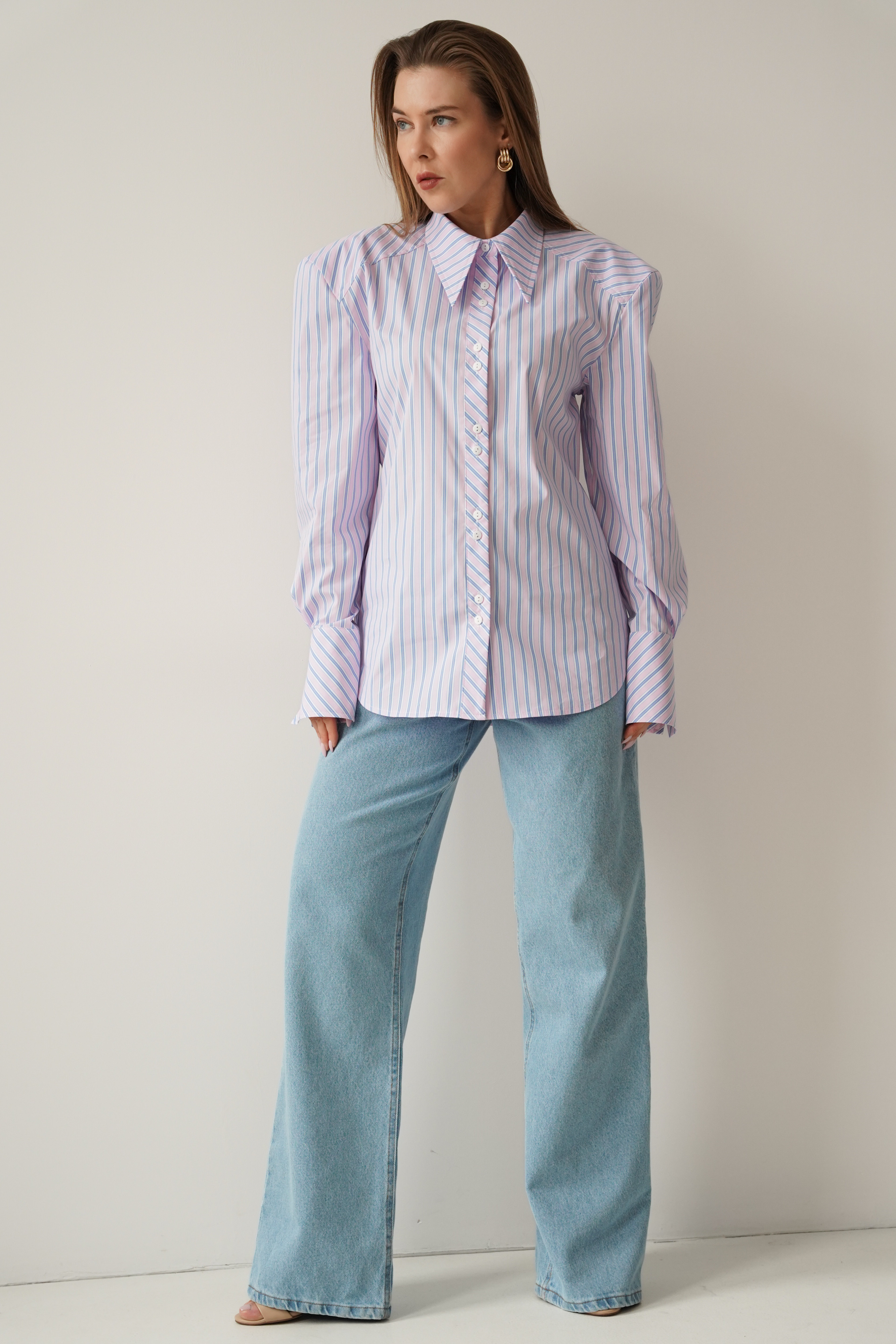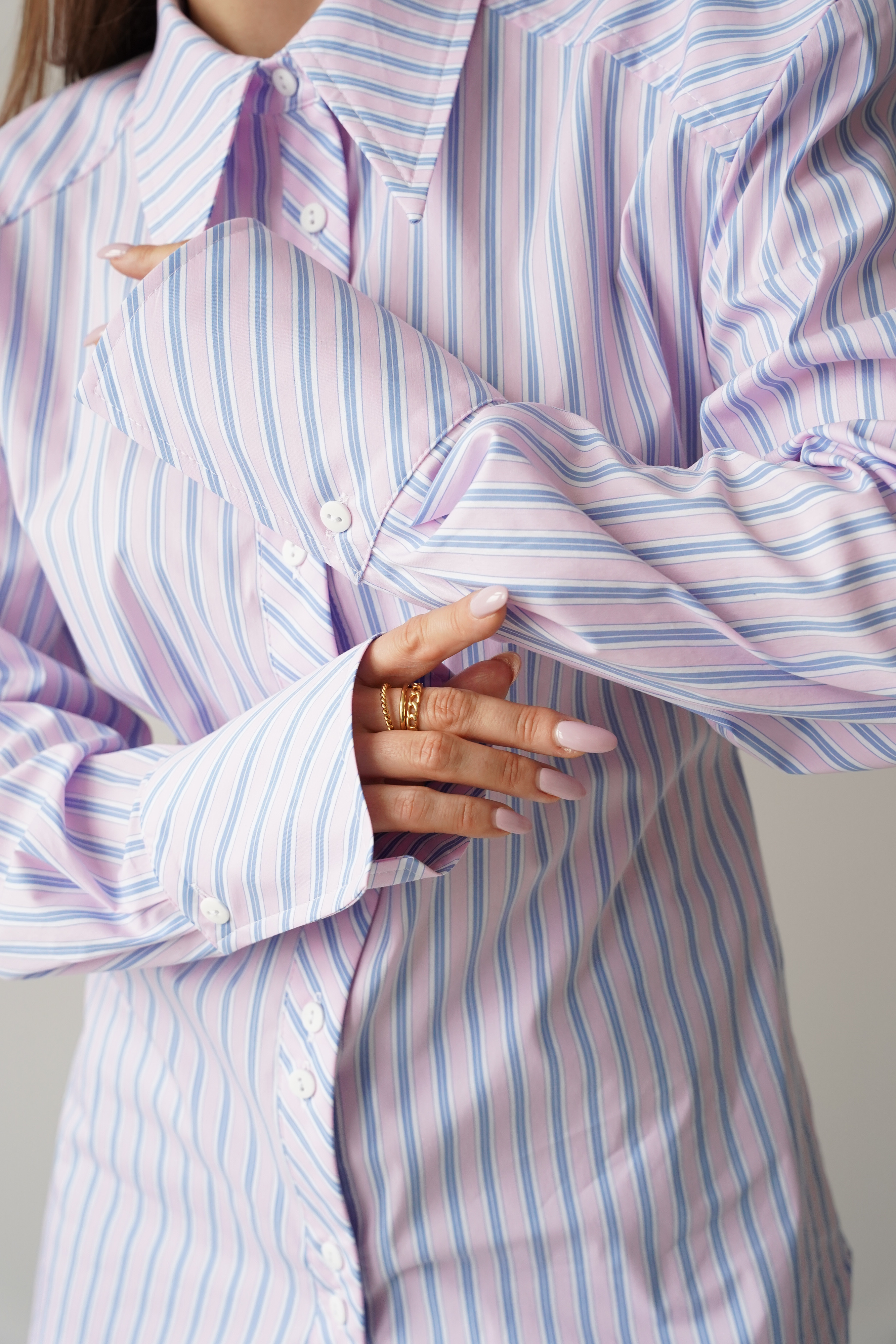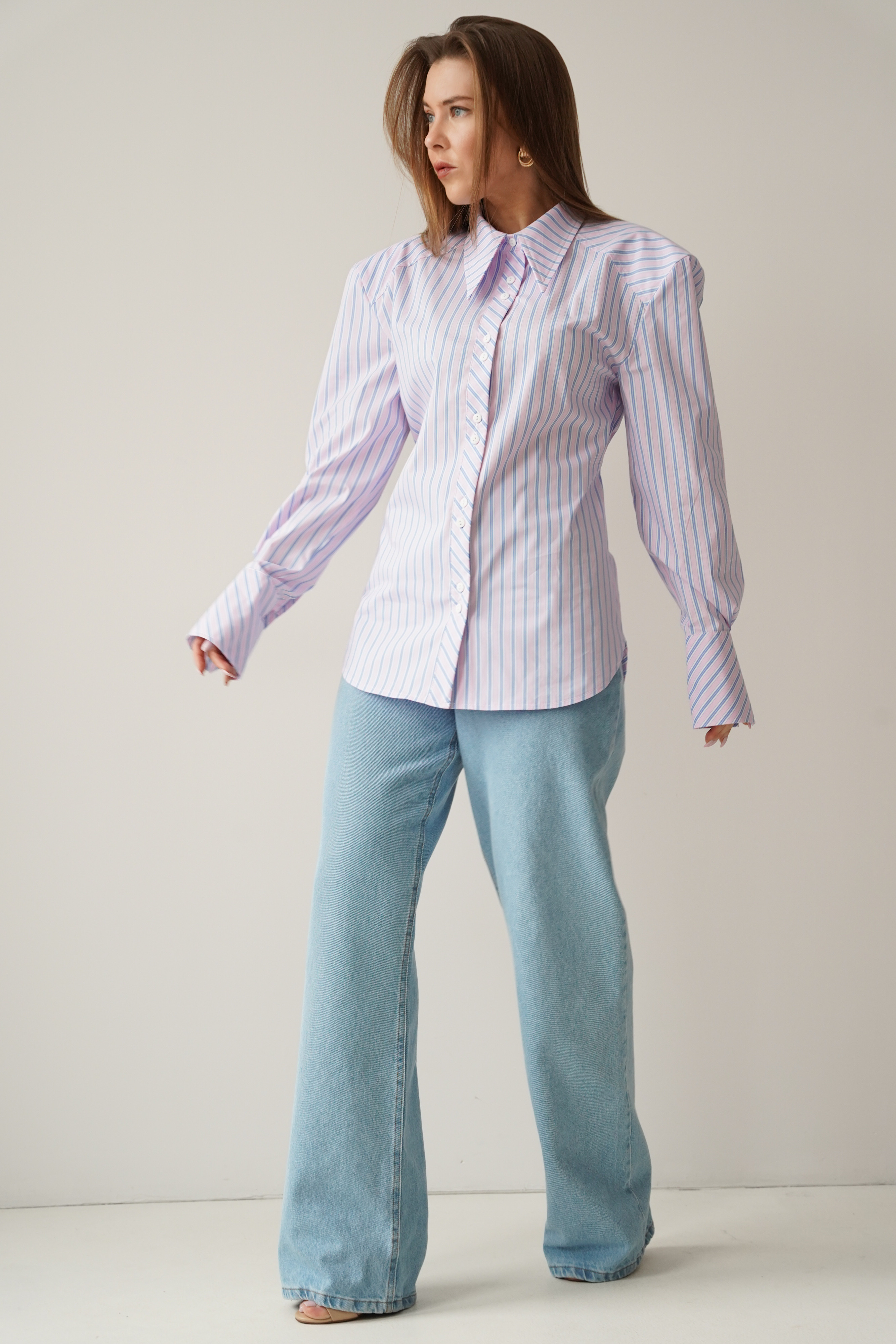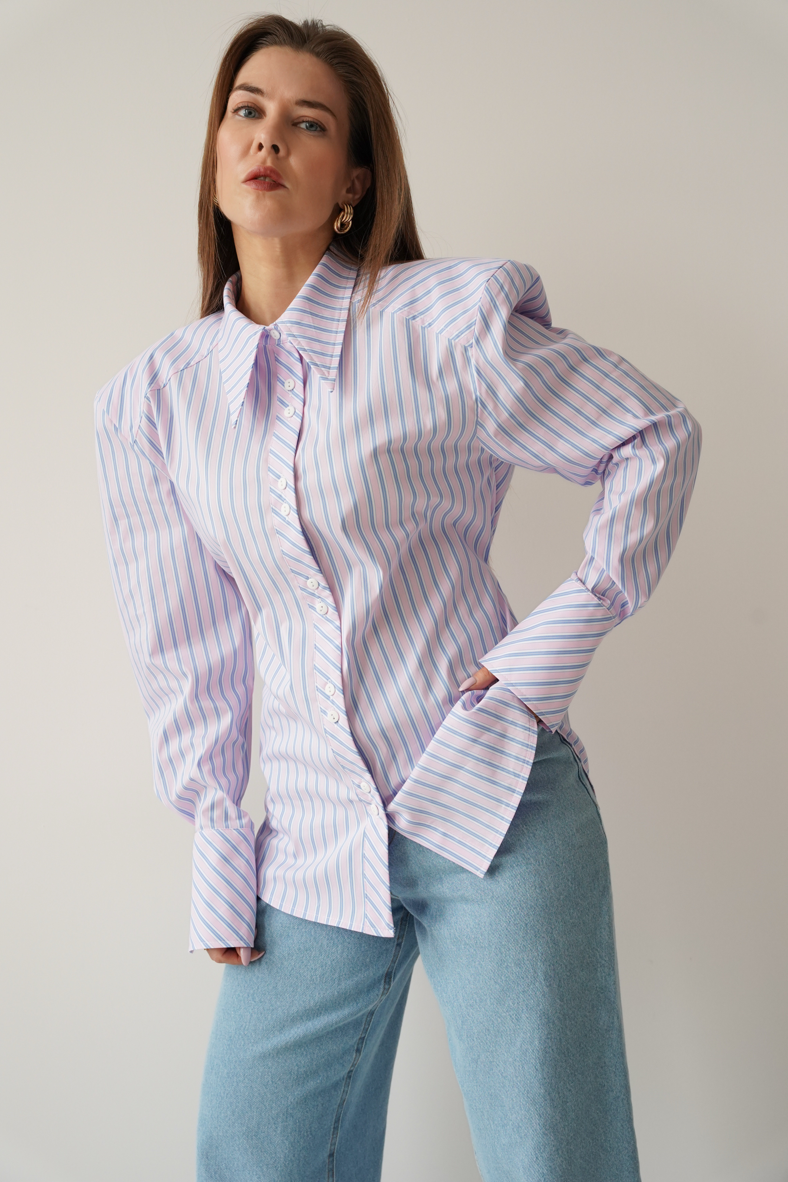 Elegancka koszula „Allegra”, wykonana z miękkiej mieszanki bawełny i wiskozy. Lekko dopasowany, dłuższy fason z taliowaniem i dekoracyjnym paseczkiem, który podkreśla linię talii. Poduszki w ramionach tworzą nowoczesną, wysmukloną sylwetkę. Klasyczny kołnierzyk, mankiety i guziki dopełniają minimalistycznego, premium charakteru.