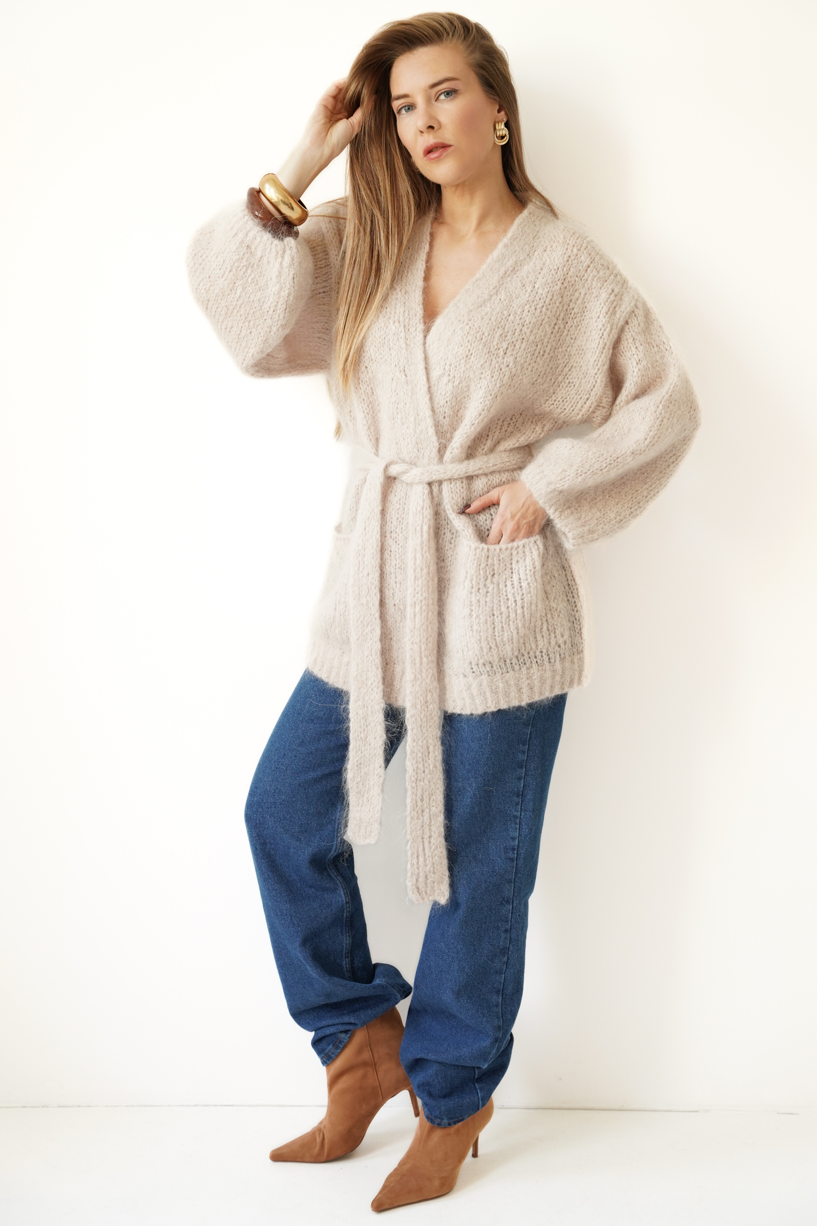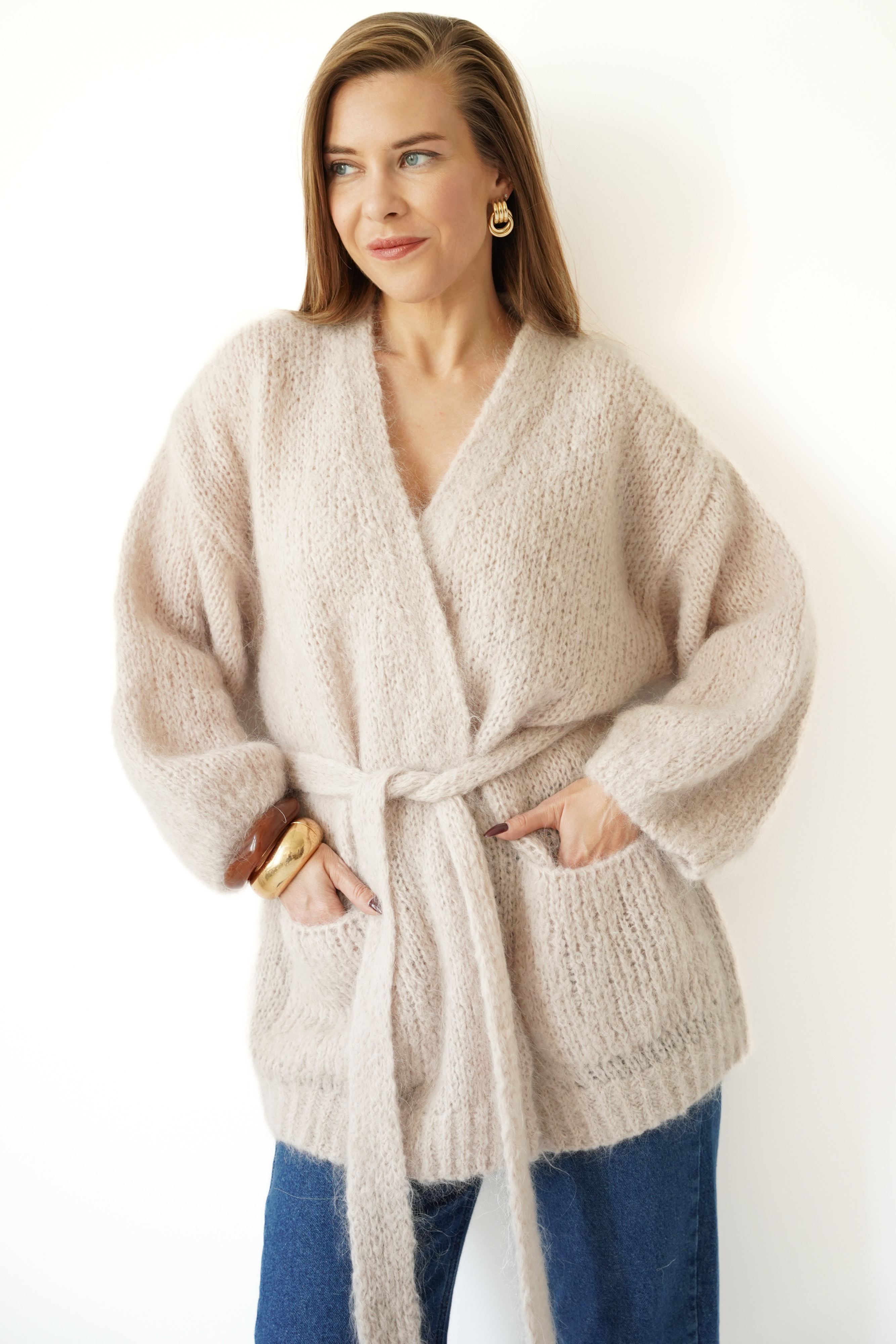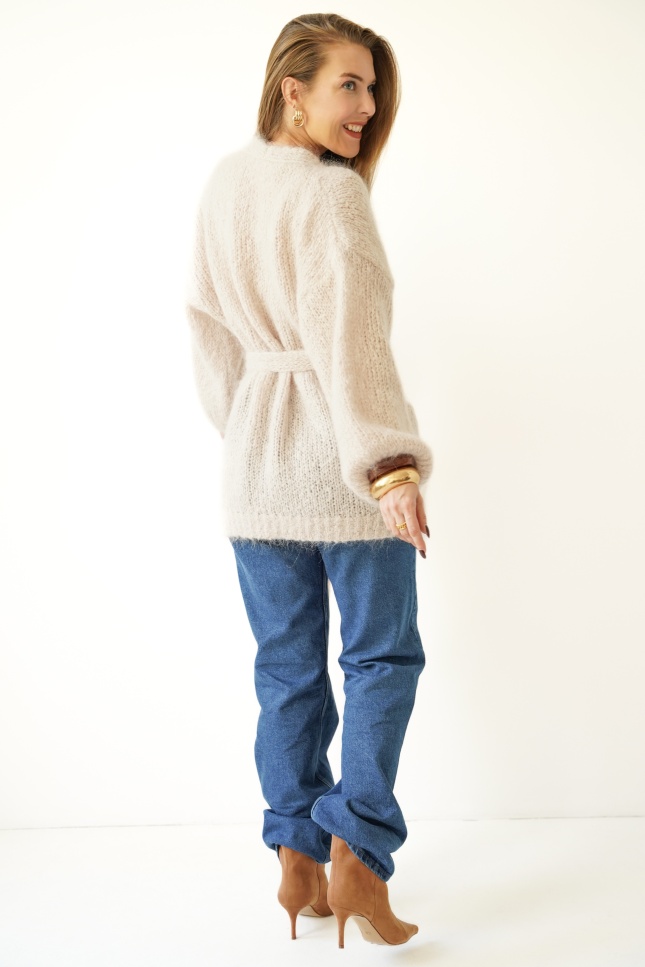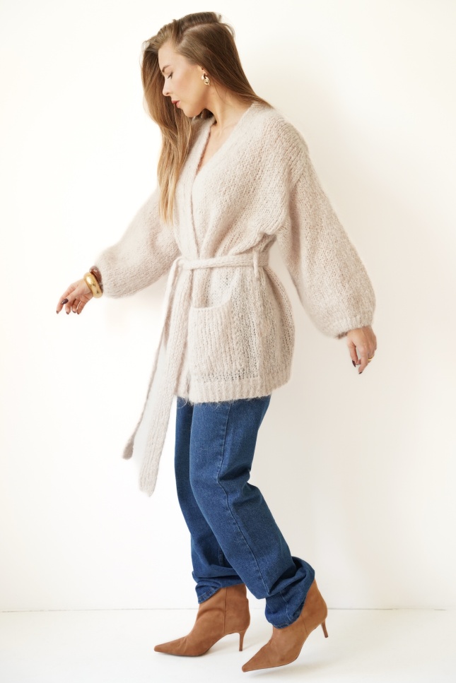 Elegancki, ponadczasowy kardigan z paskiem do wiązania w talii, który podkreśla sylwetkę i dodaje stylizacji kobiecego charakteru. Wykonany z naturalnej przędzy z moherem, kid moherem i wełną – zachwyca miękkością, puszystą fakturą i lekkością noszenia. Dwie praktyczne kieszenie i ściągacze przy rękawach dopełniają całość w duchu funkcjonalnej elegancji.