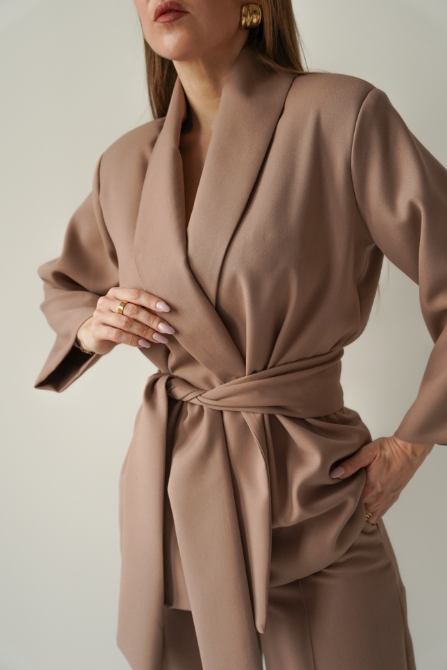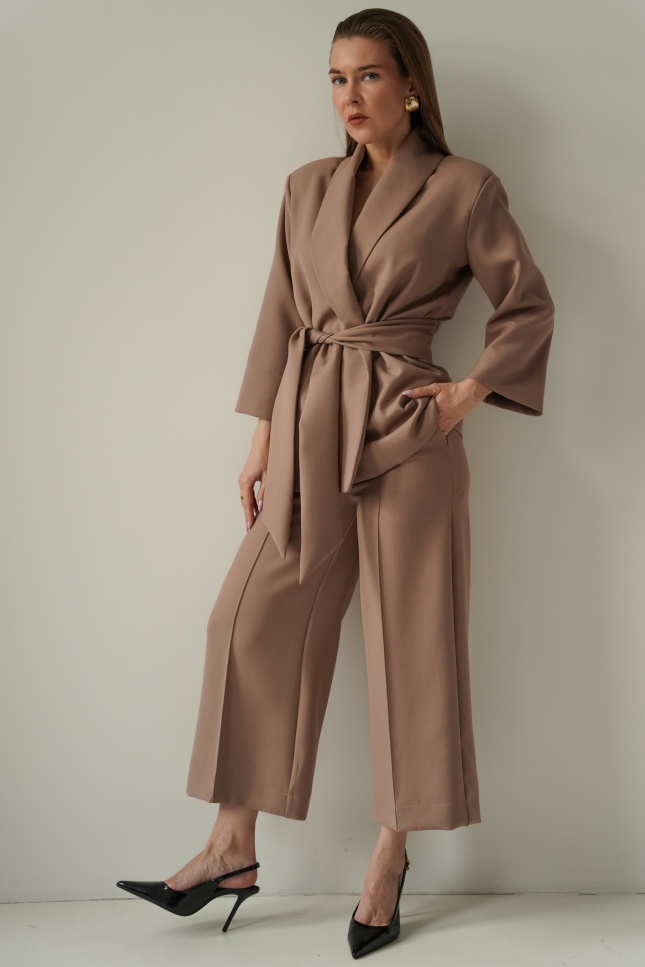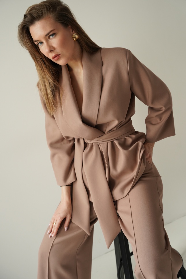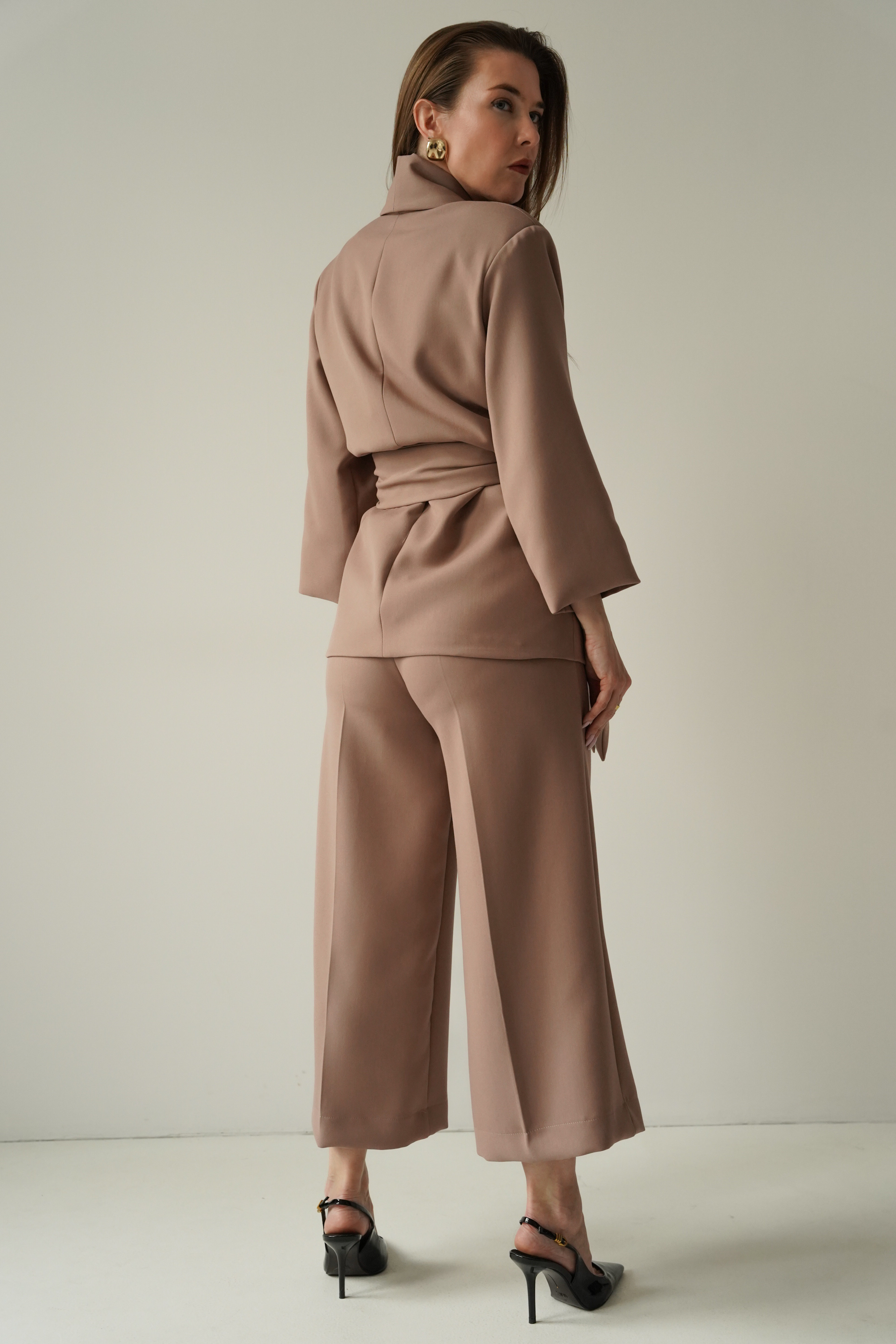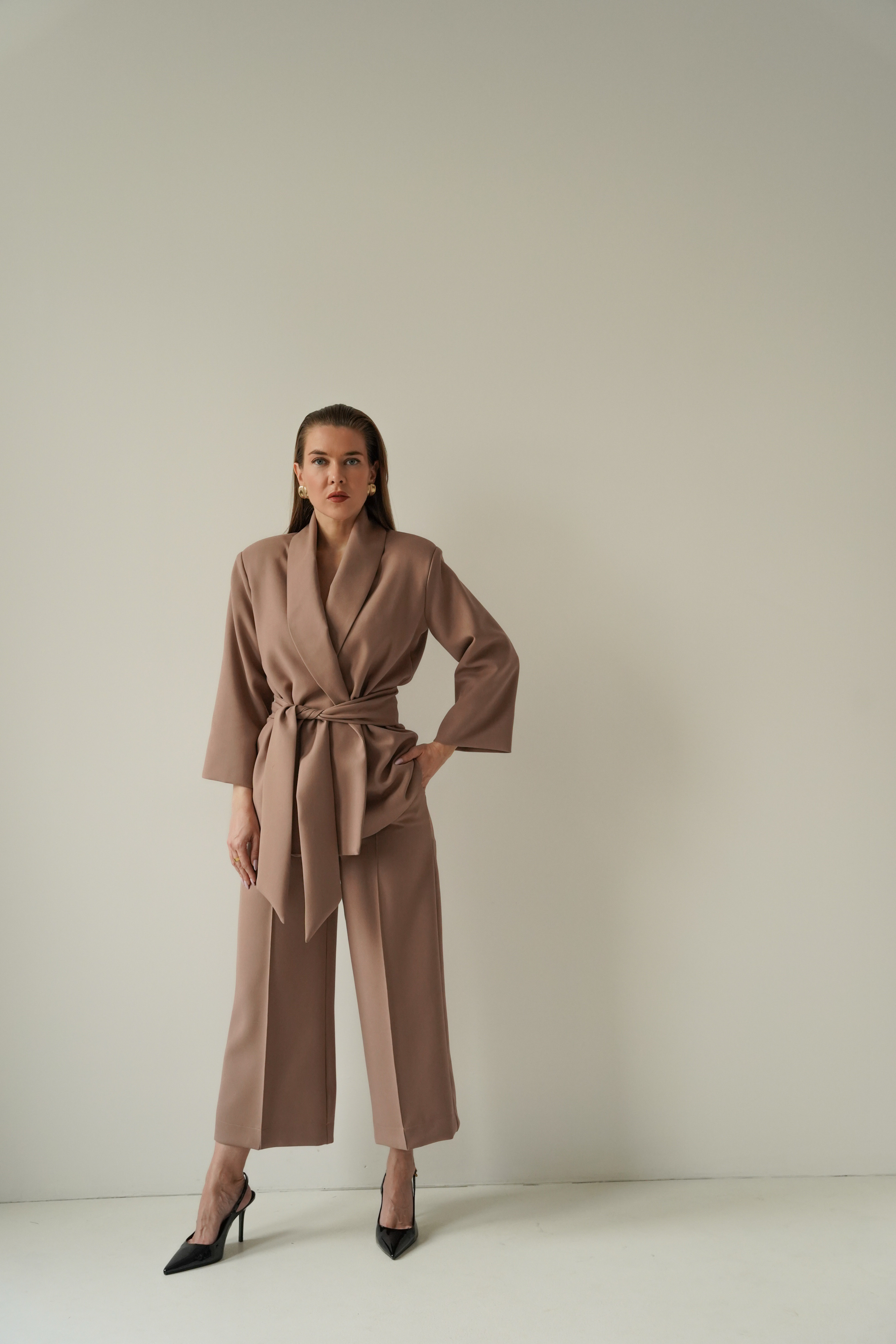 Elegancki, kobiecy komplet składający się z marynarki-narzutki wiązanej paskiem oraz spodni typu culotte z kantem. Uszyty z wysokiej jakości tkaniny garniturowej z 72% wiskozy. Stylowy balans między elegancją a casualem. Idealny na co dzień, do pracy i na wieczór.