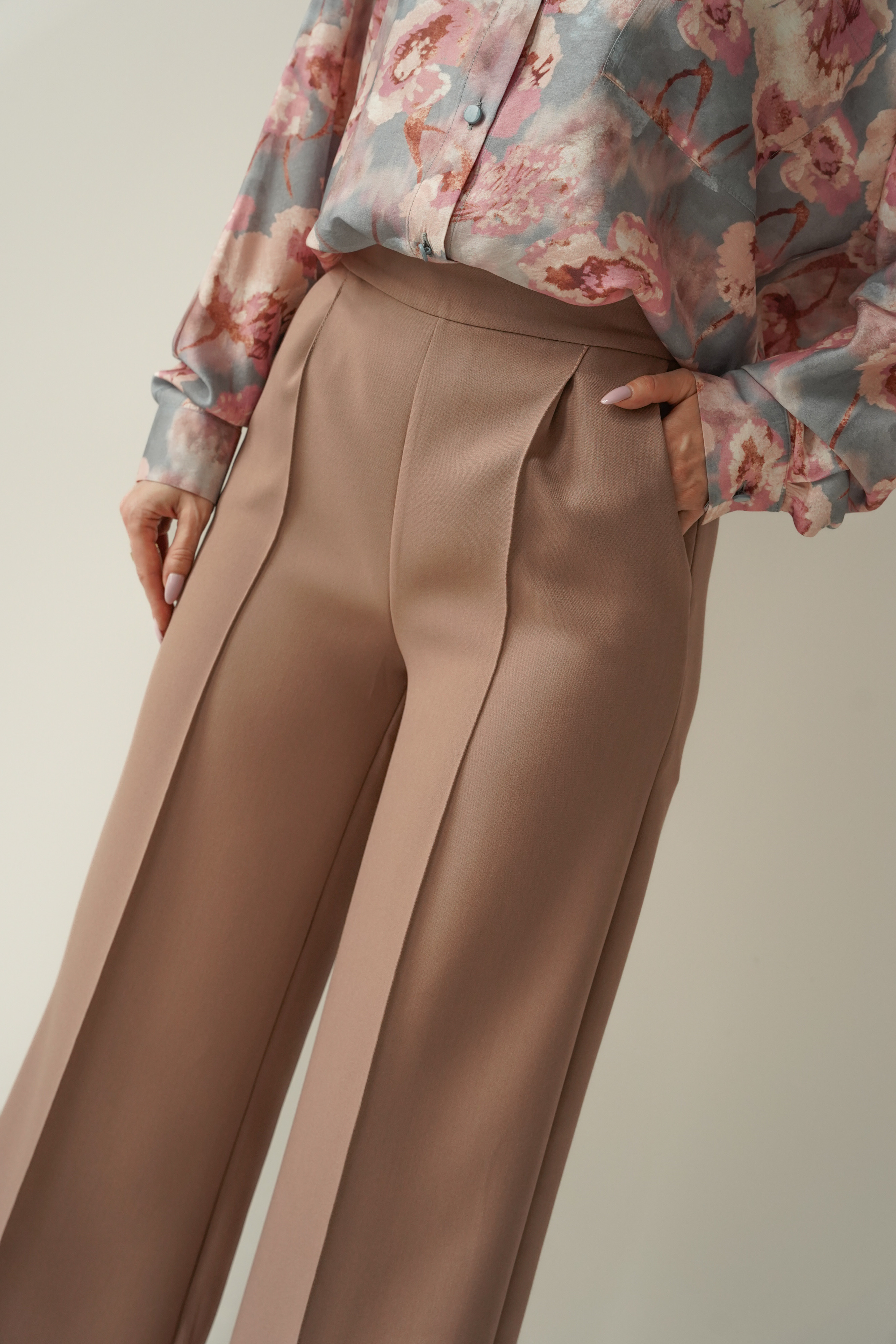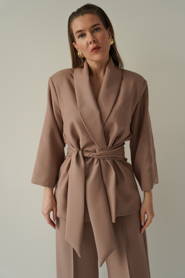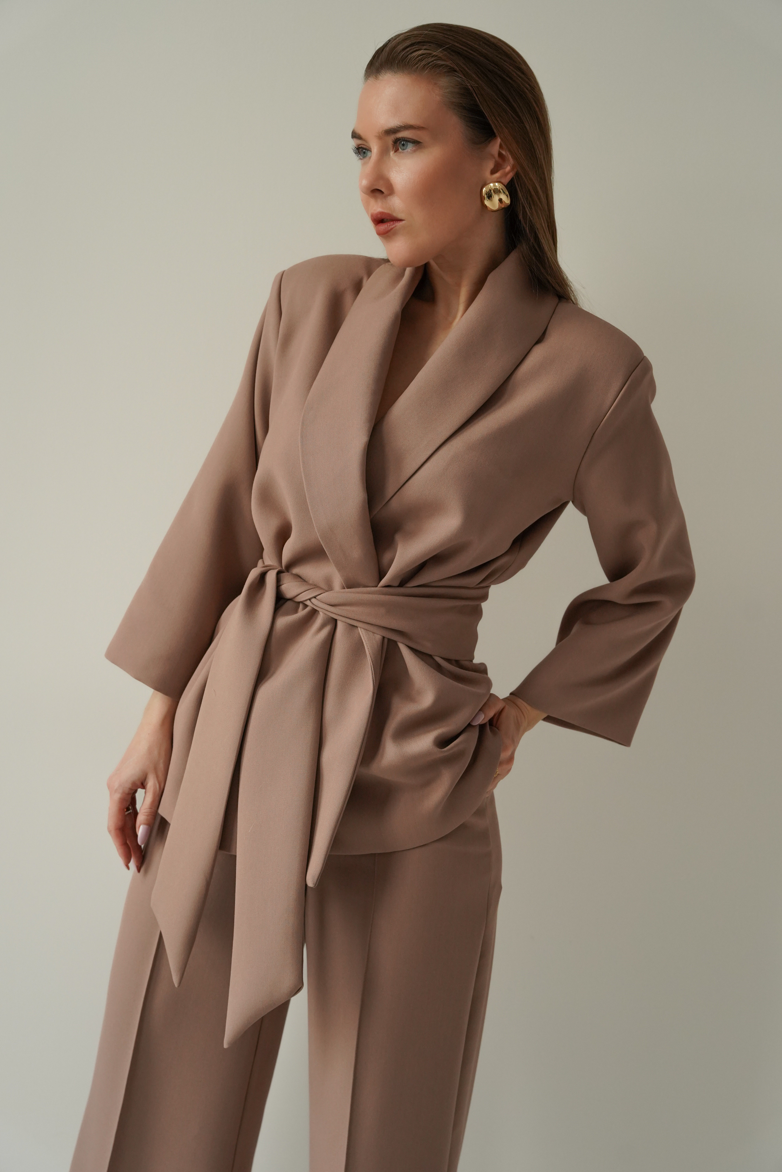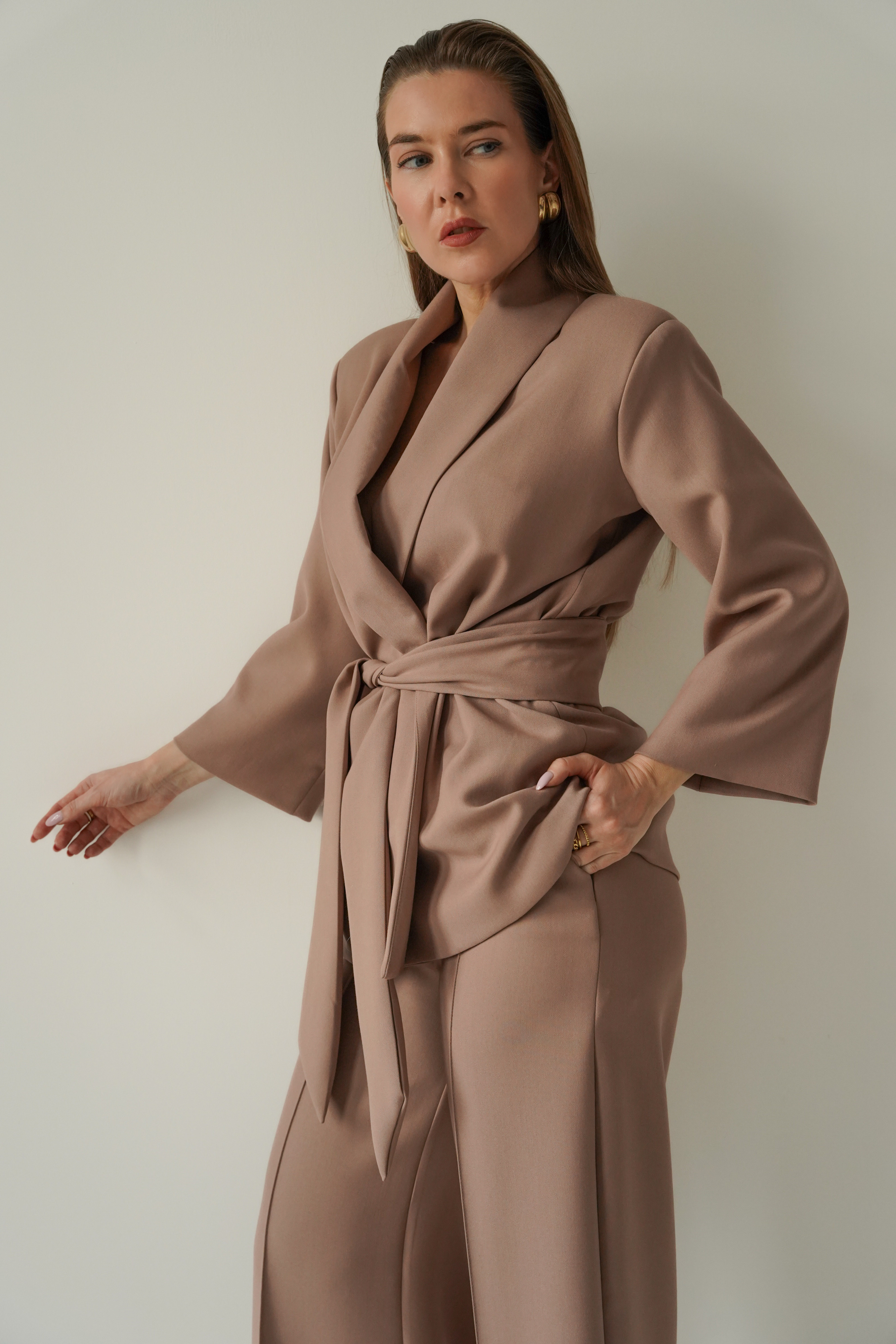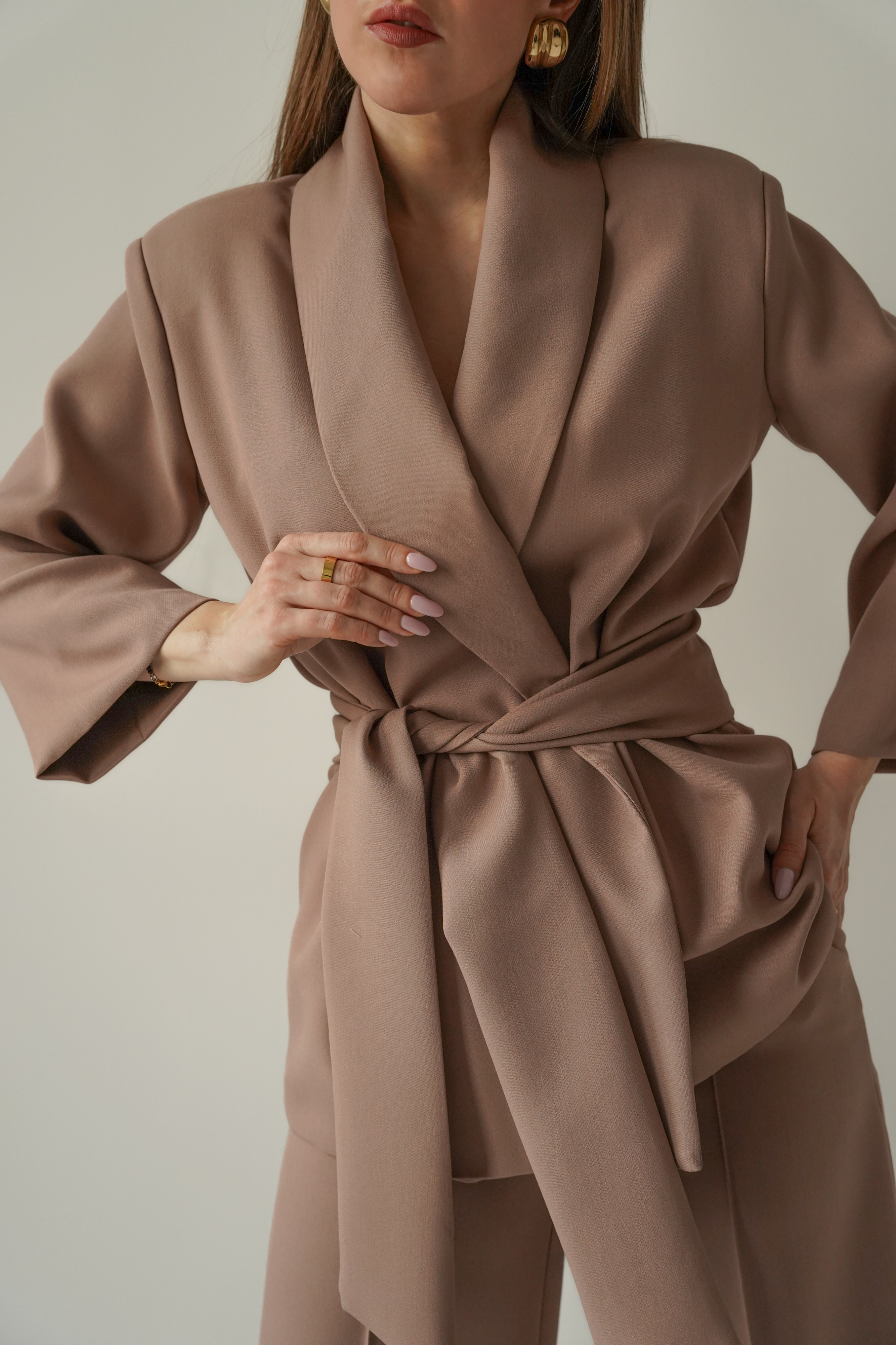 Elegancki, kobiecy komplet składający się z marynarki-narzutki wiązanej paskiem oraz spodni typu culotte z kantem. Uszyty z wysokiej jakości tkaniny garniturowej z 72% wiskozy. Stylowy balans między elegancją a casualem. Idealny na co dzień, do pracy i na wieczór.