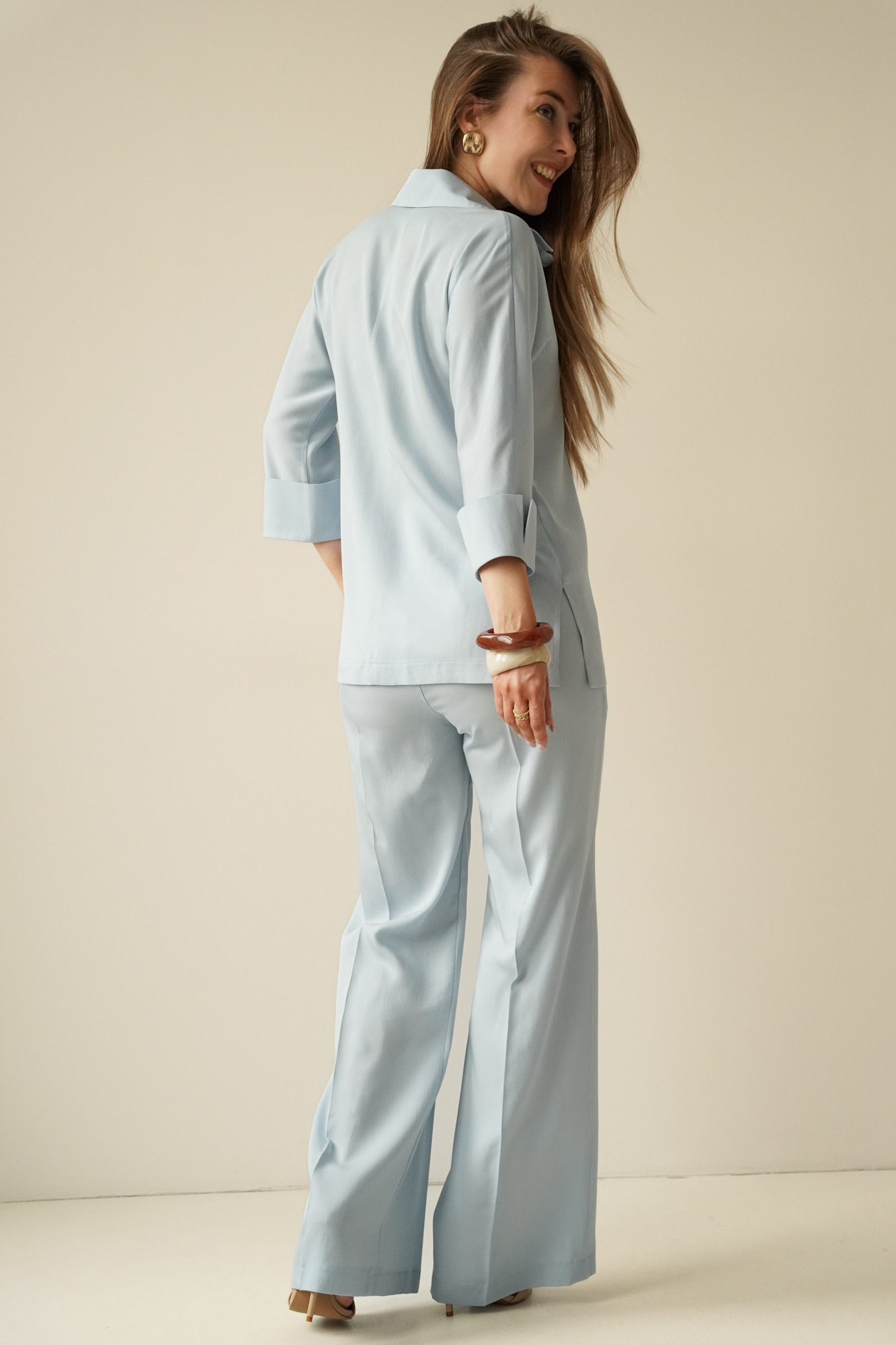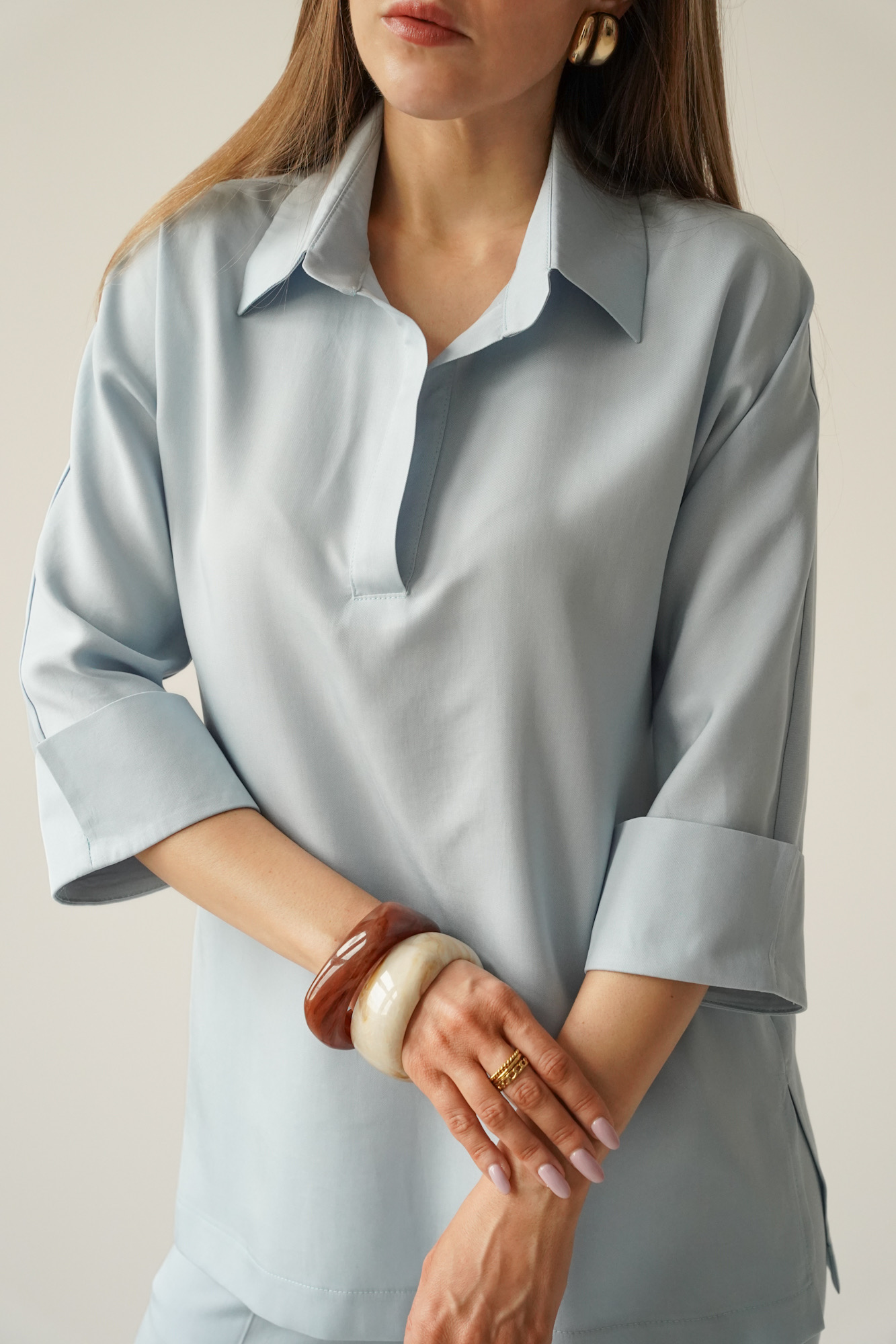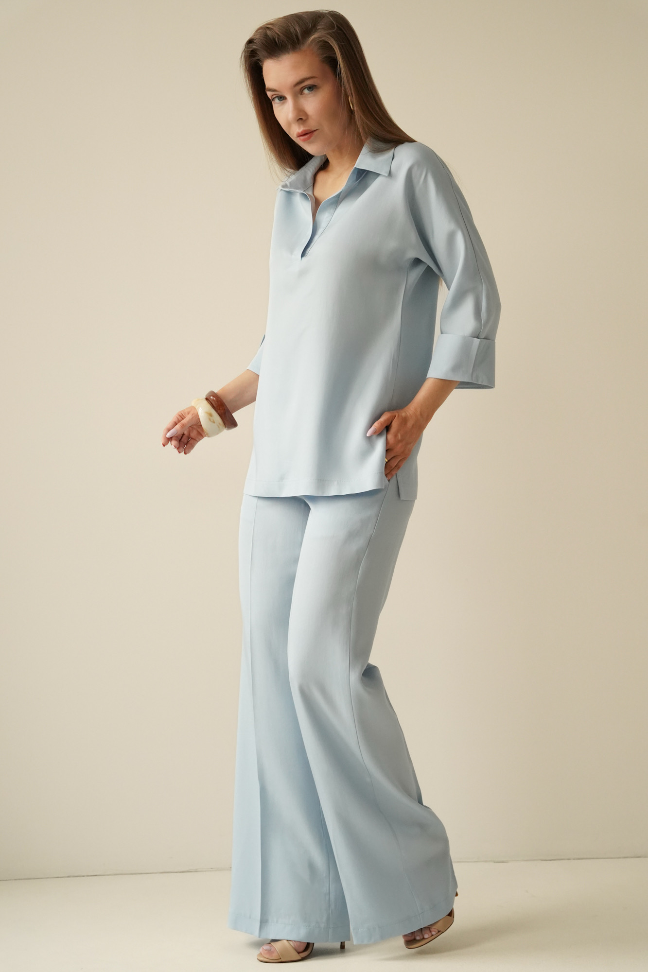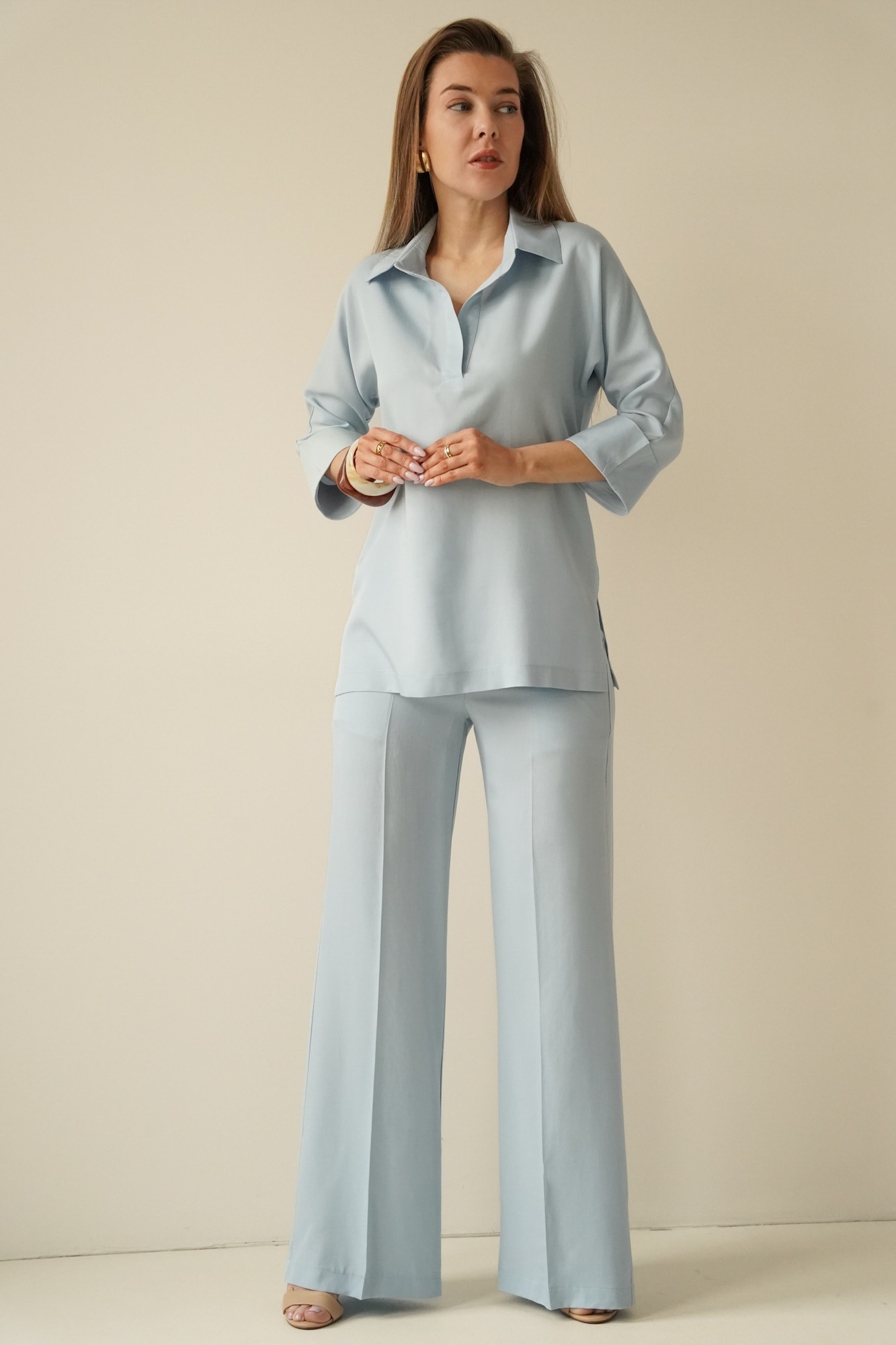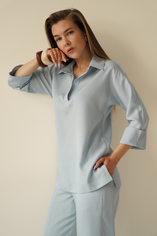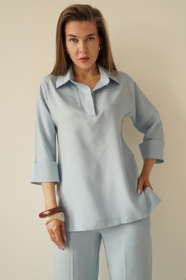 ATELIER to minimalistyczny, elegancki komplet składający się z wydłużonej koszuli typu polo z rękawem ¾ oraz spodni na kant z kieszeniami.