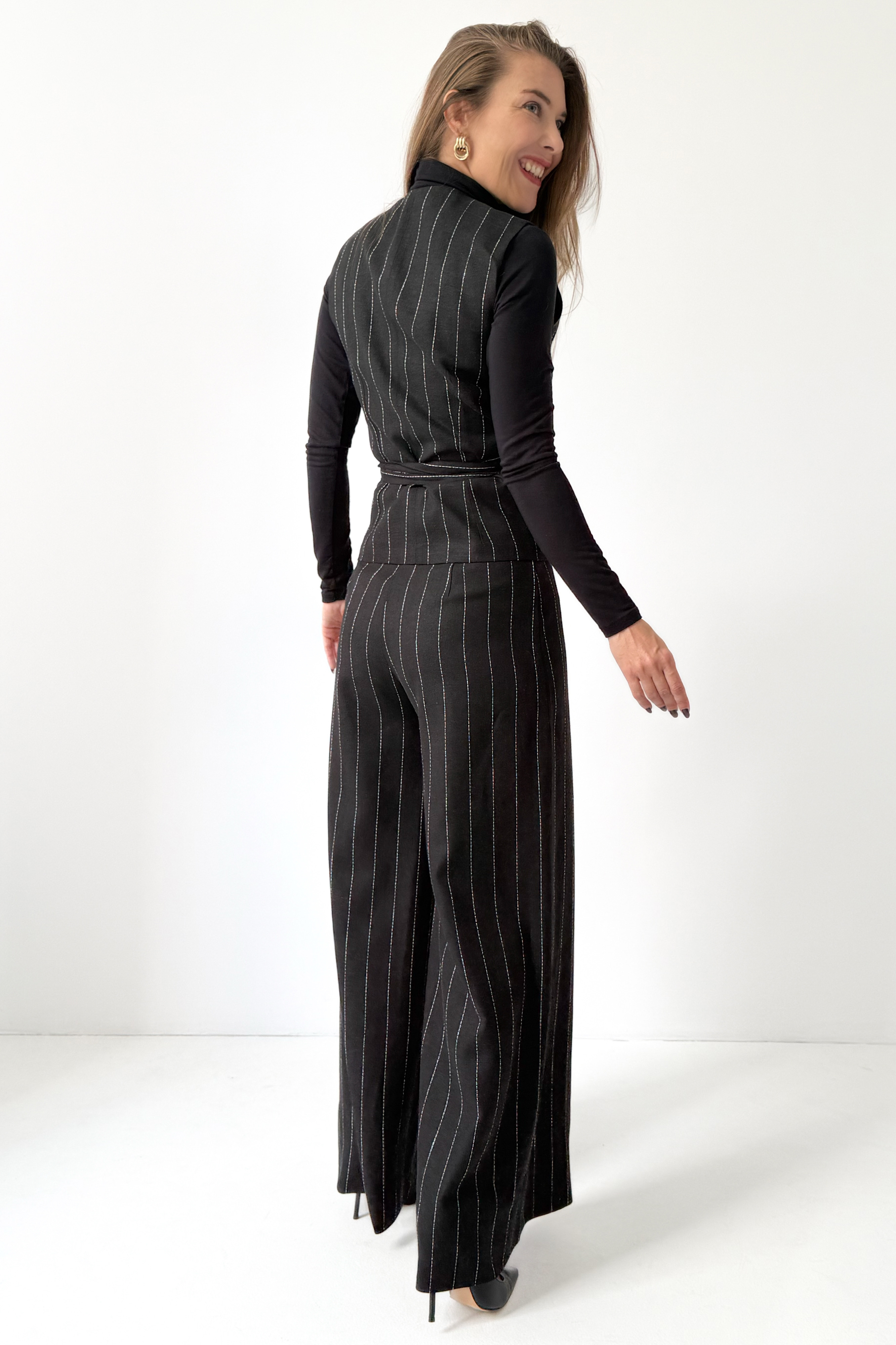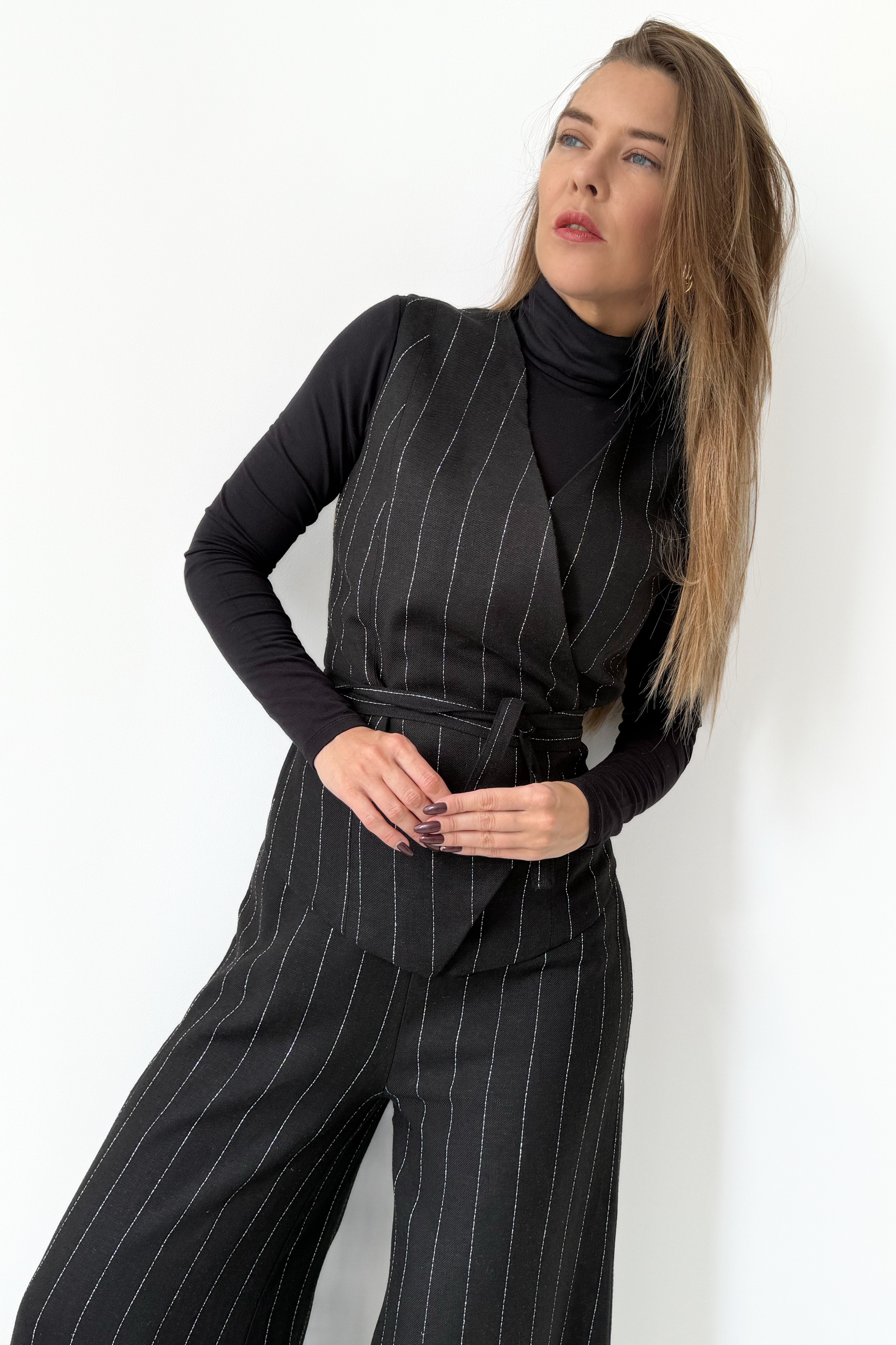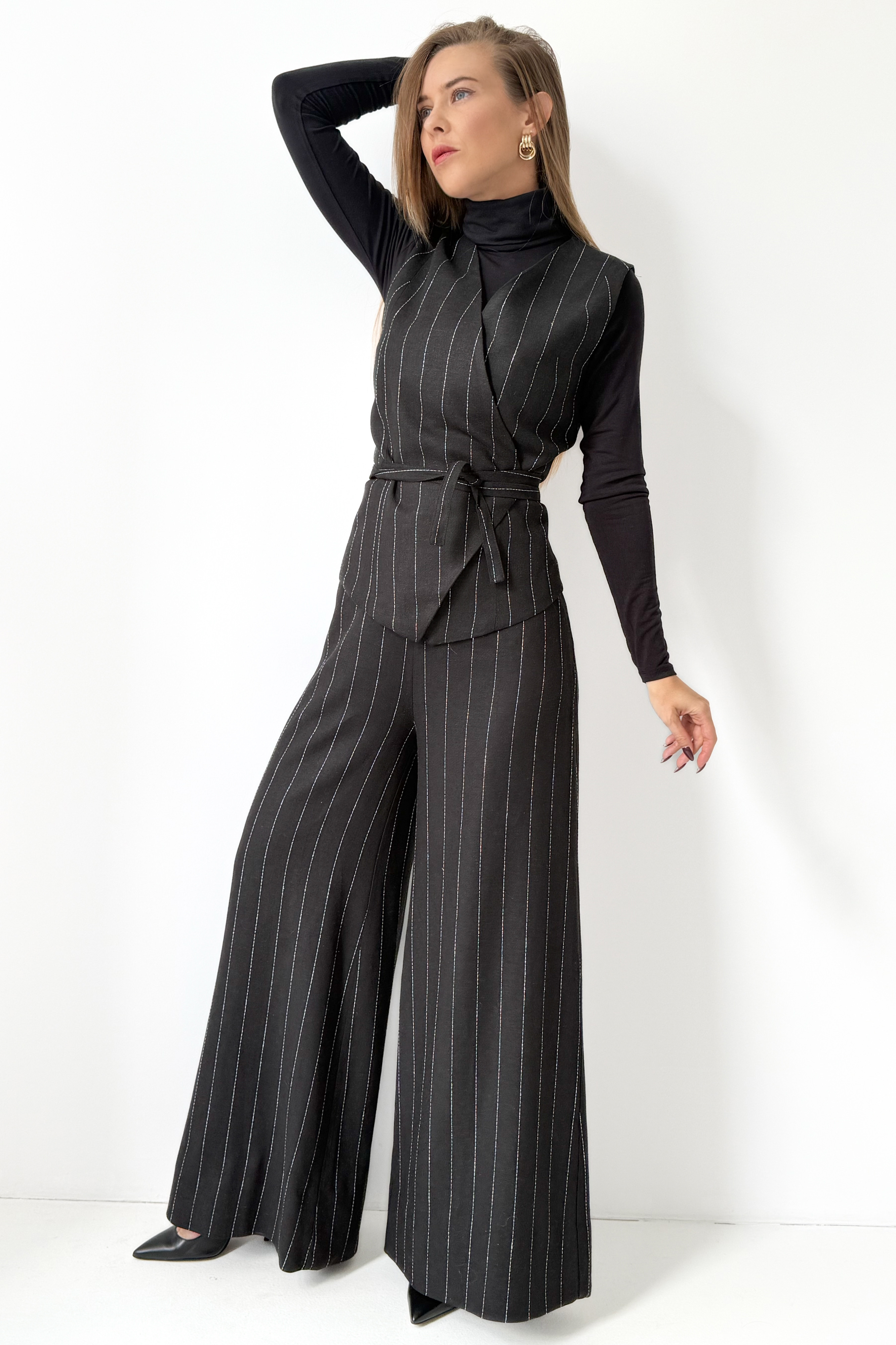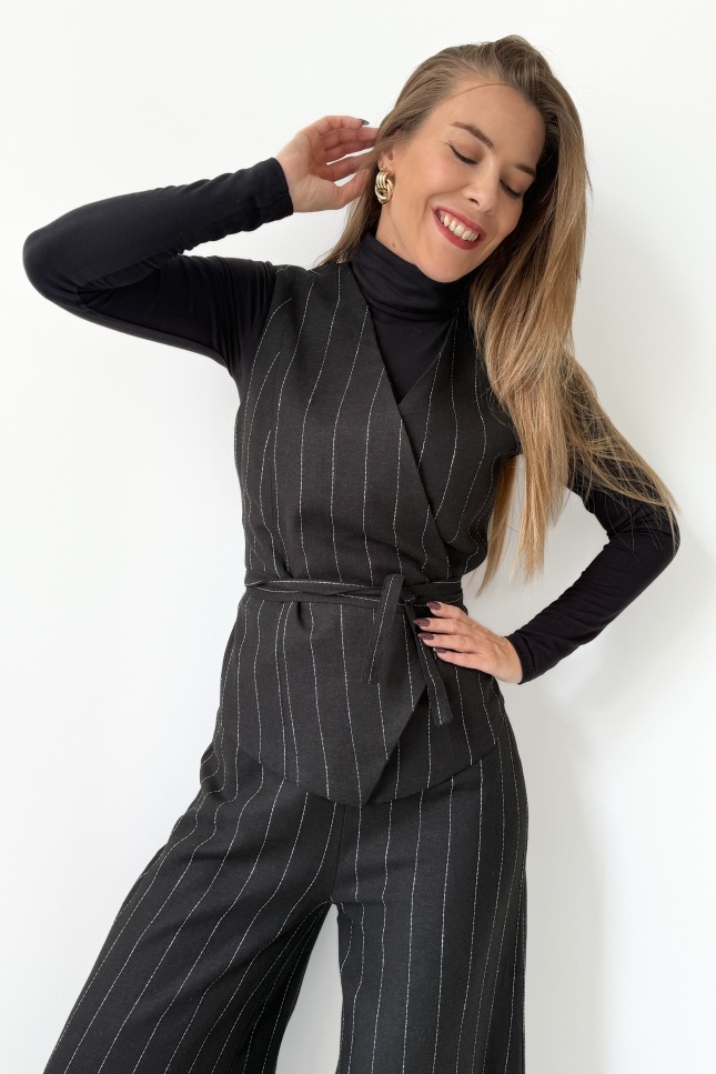 Taliowana kamizelka z paskiem do wiązania w talii pięknie modeluje sylwetkę i tworzy efekt gorsetowego dopasowania, podkreślając kobiecość bez rezygnacji z mocy wyrazu. Spodnie typu palazzo z szeroką, lejącą się nogawką wprowadzają do całości lekkość i nonszalancję, jednocześnie zachowując formalny sznyt.