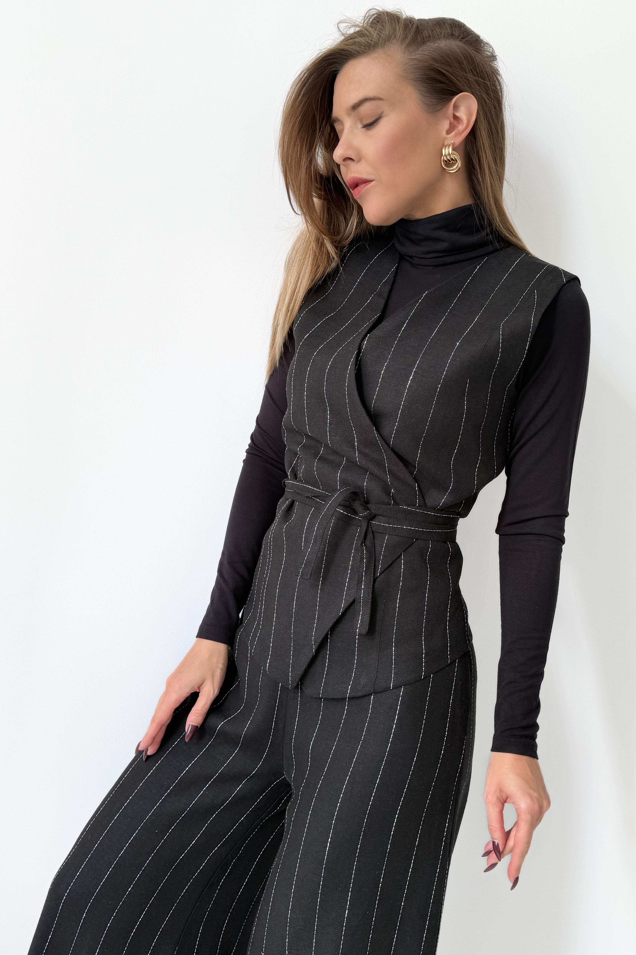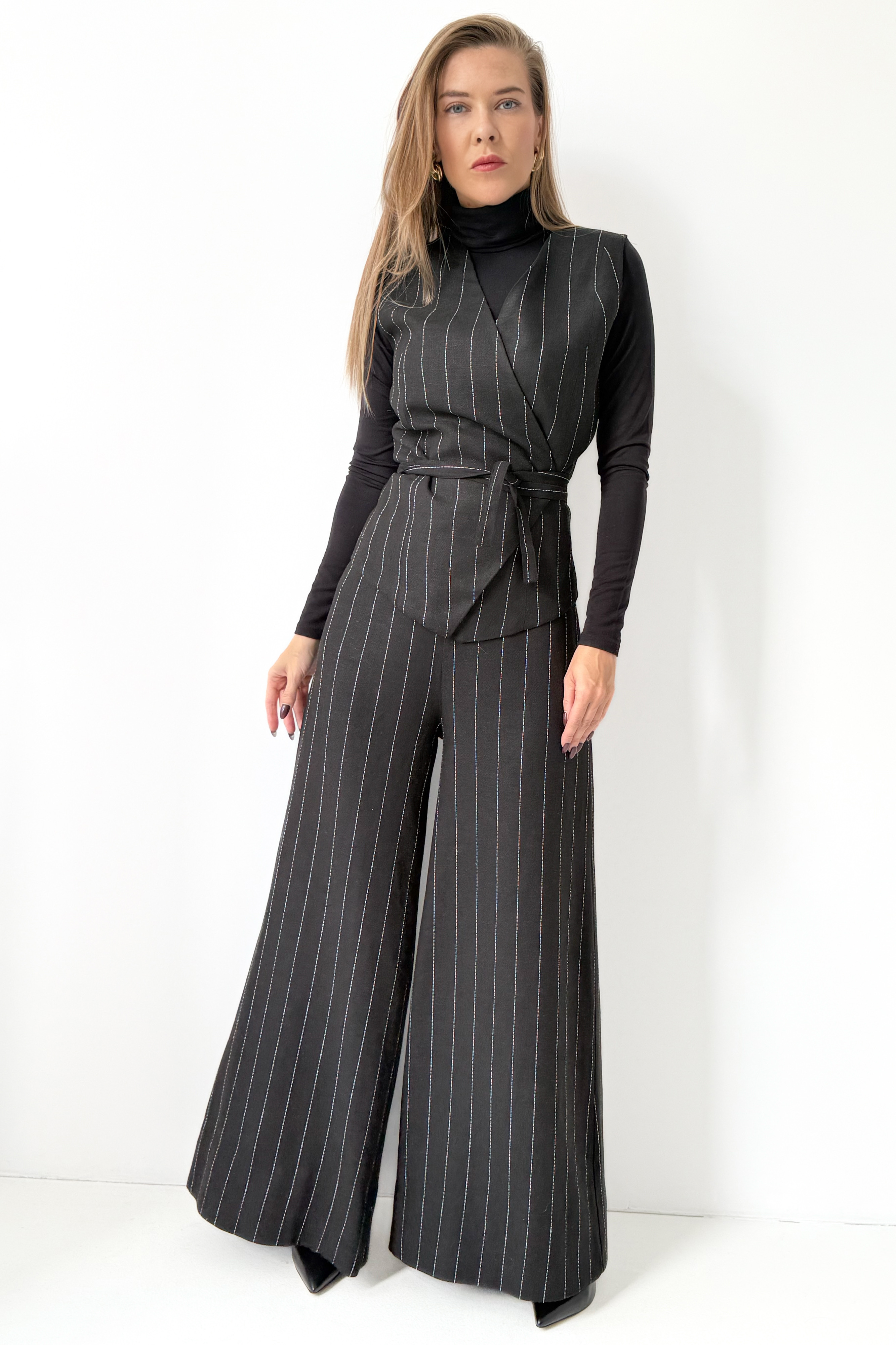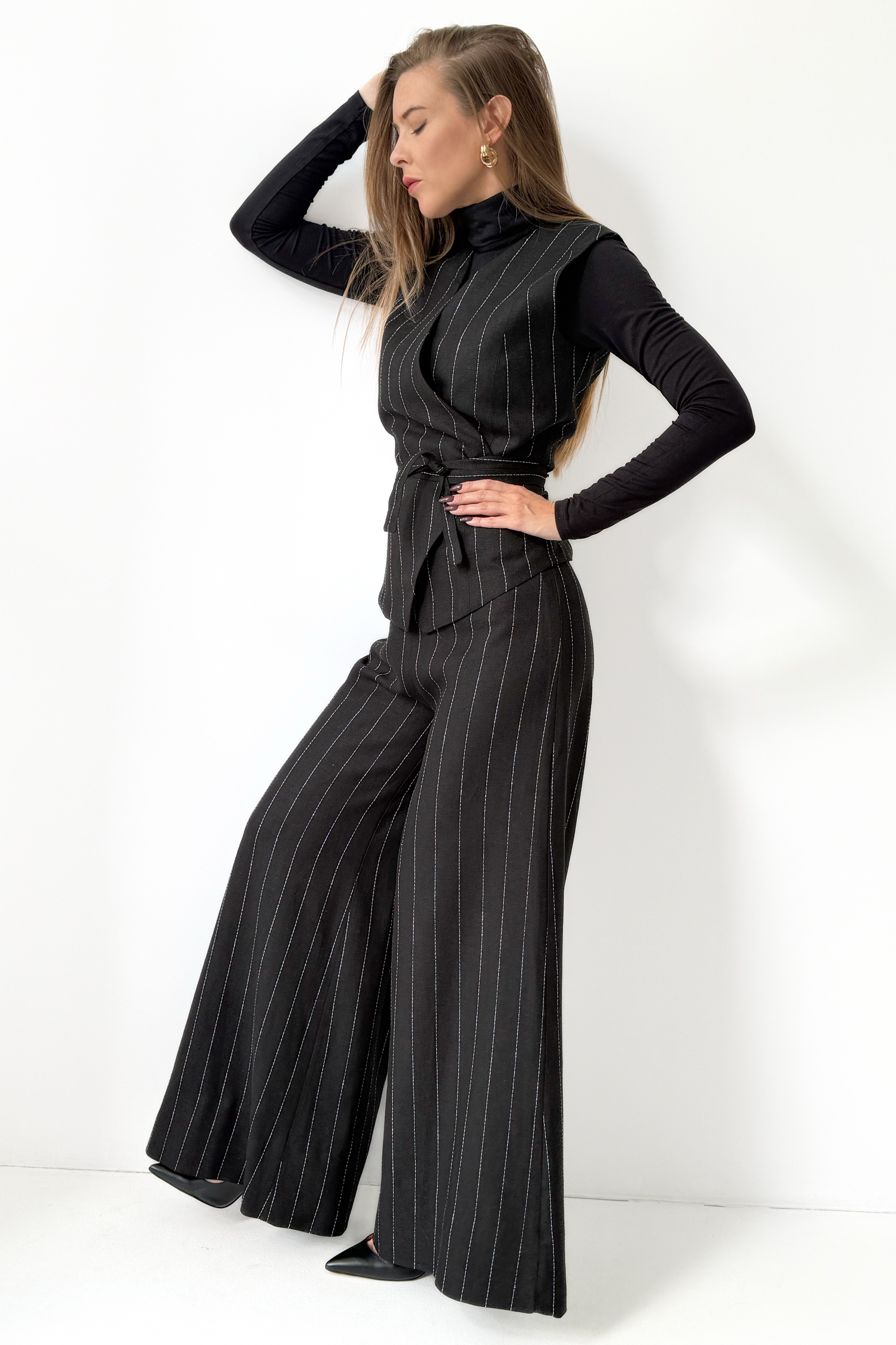 Taliowana kamizelka z paskiem do wiązania w talii pięknie modeluje sylwetkę i tworzy efekt gorsetowego dopasowania, podkreślając kobiecość bez rezygnacji z mocy wyrazu. Spodnie typu palazzo z szeroką, lejącą się nogawką wprowadzają do całości lekkość i nonszalancję, jednocześnie zachowując formalny sznyt.