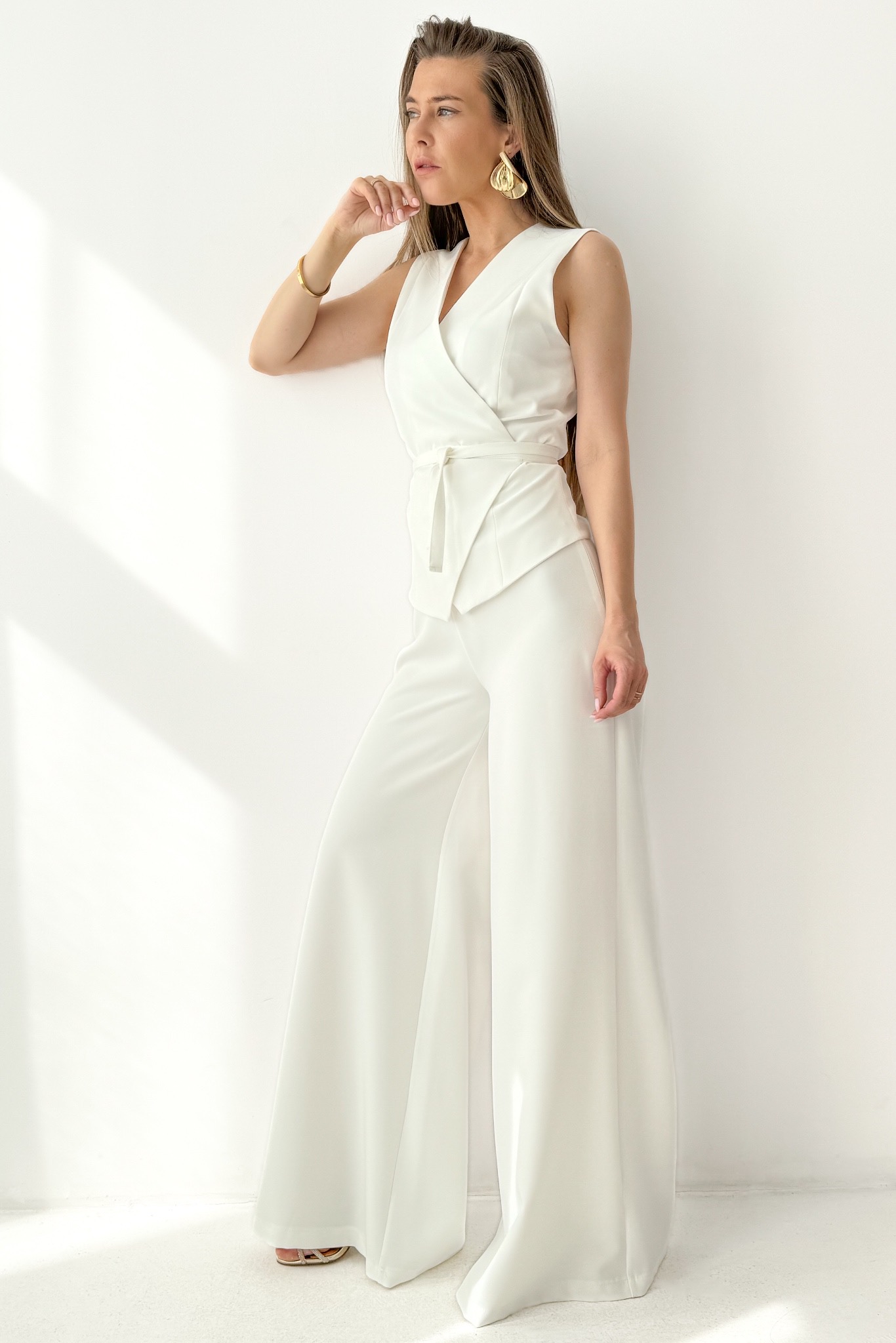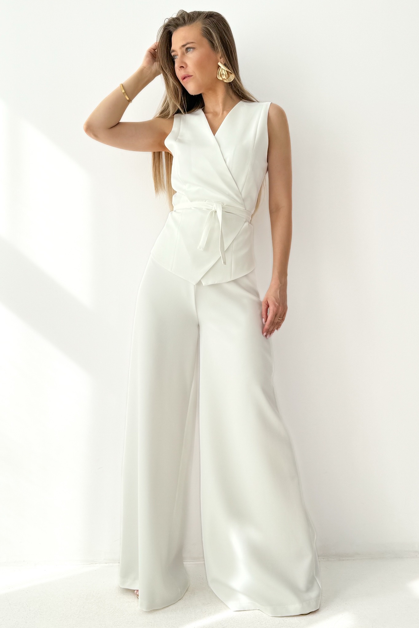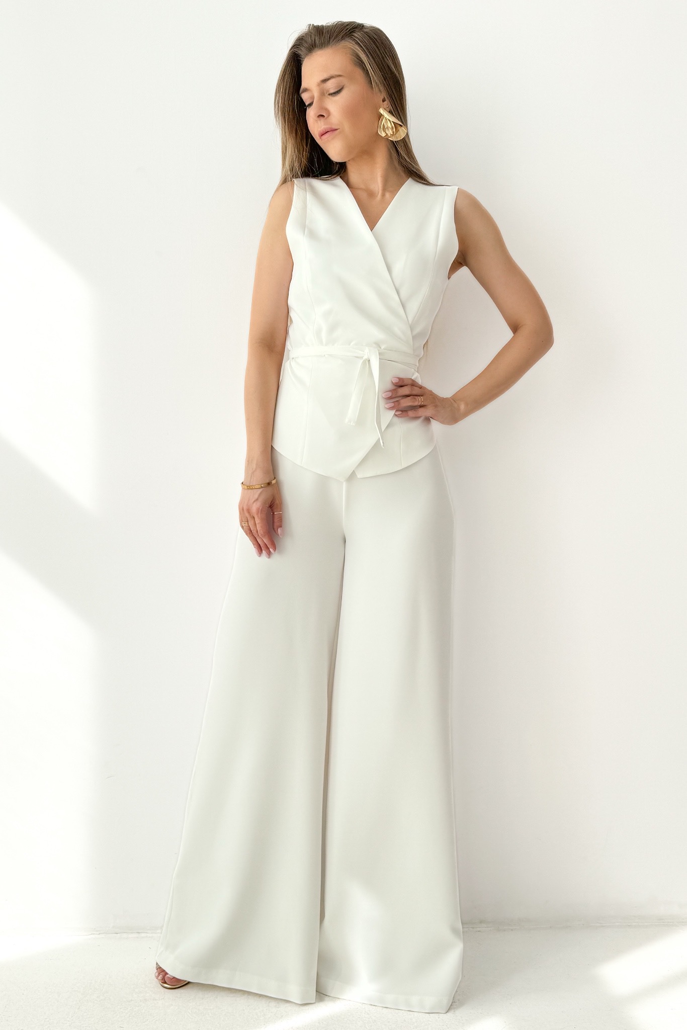 Komplet „Coco Elegance”  łączy w sobie elegancję, kobiecość oraz współczesną klasę. Kopertowo zakładana kamizelka z finezyjnym wiązaniem w talii pięknie podkreśla sylwetkę, subtelnie akcentując kobiece kształty. Spodnie typu palazzo z wysokim stanem oraz prostymi, szerokimi nogawkami wysmuklają figurę, tworząc harmonijną i szykowną całość.
