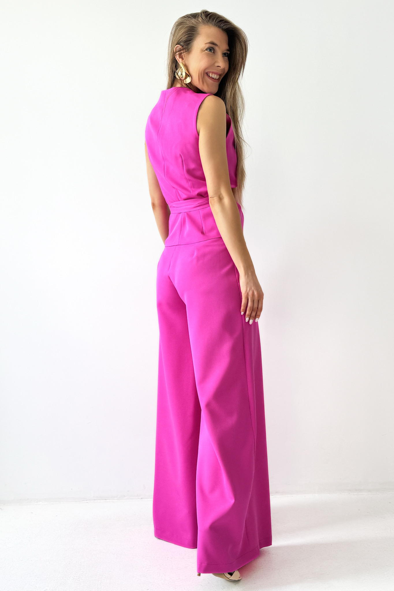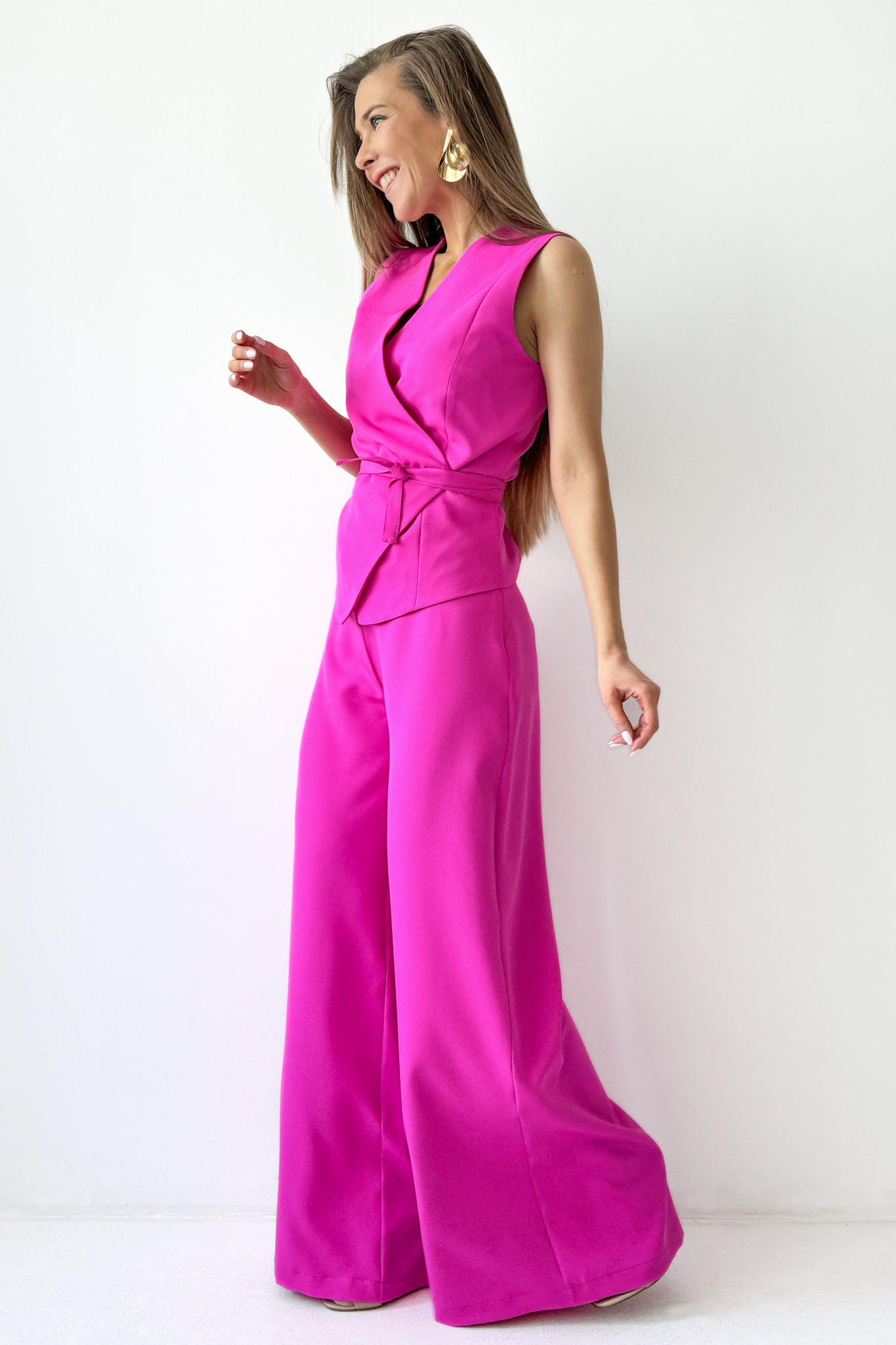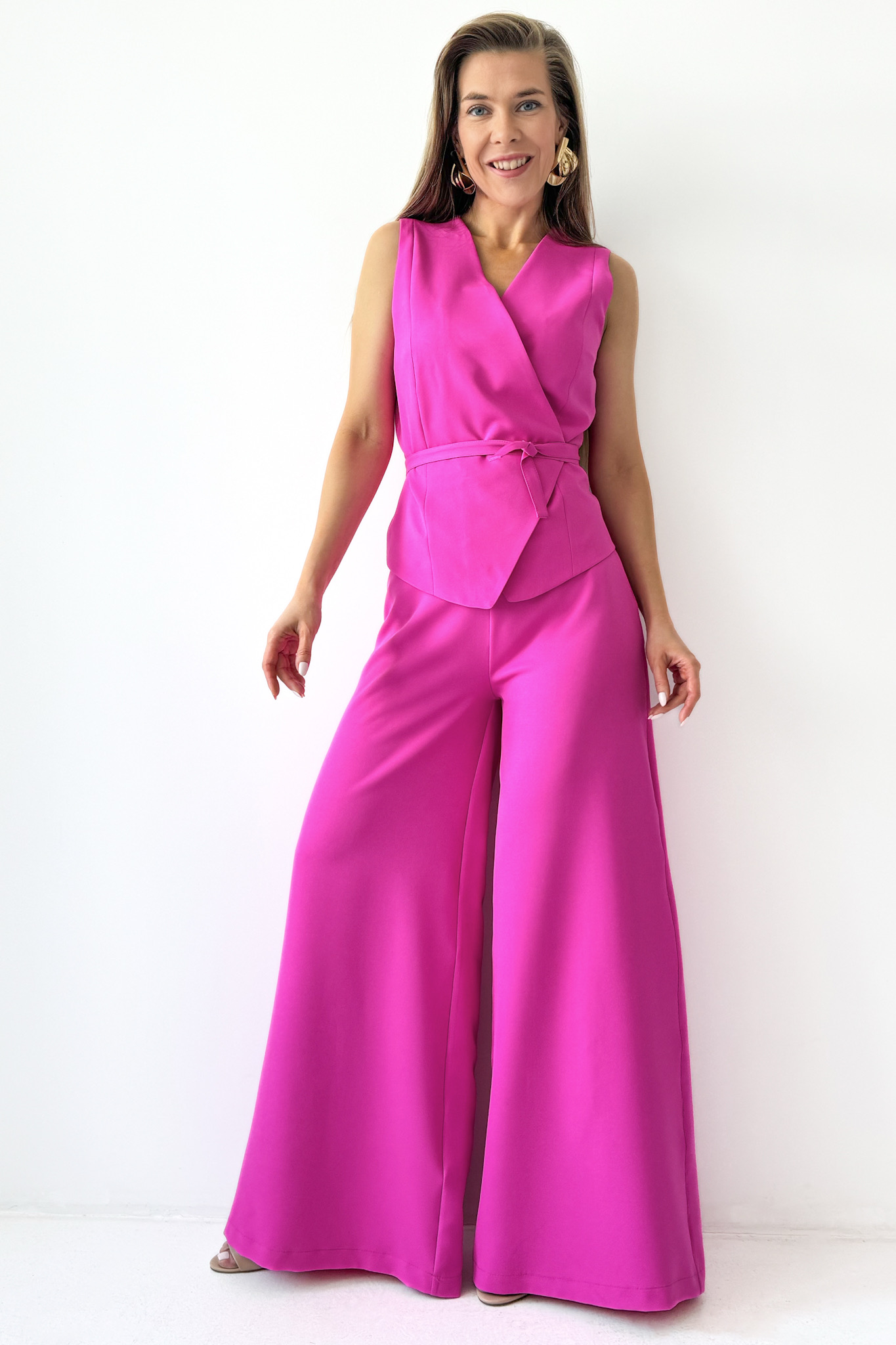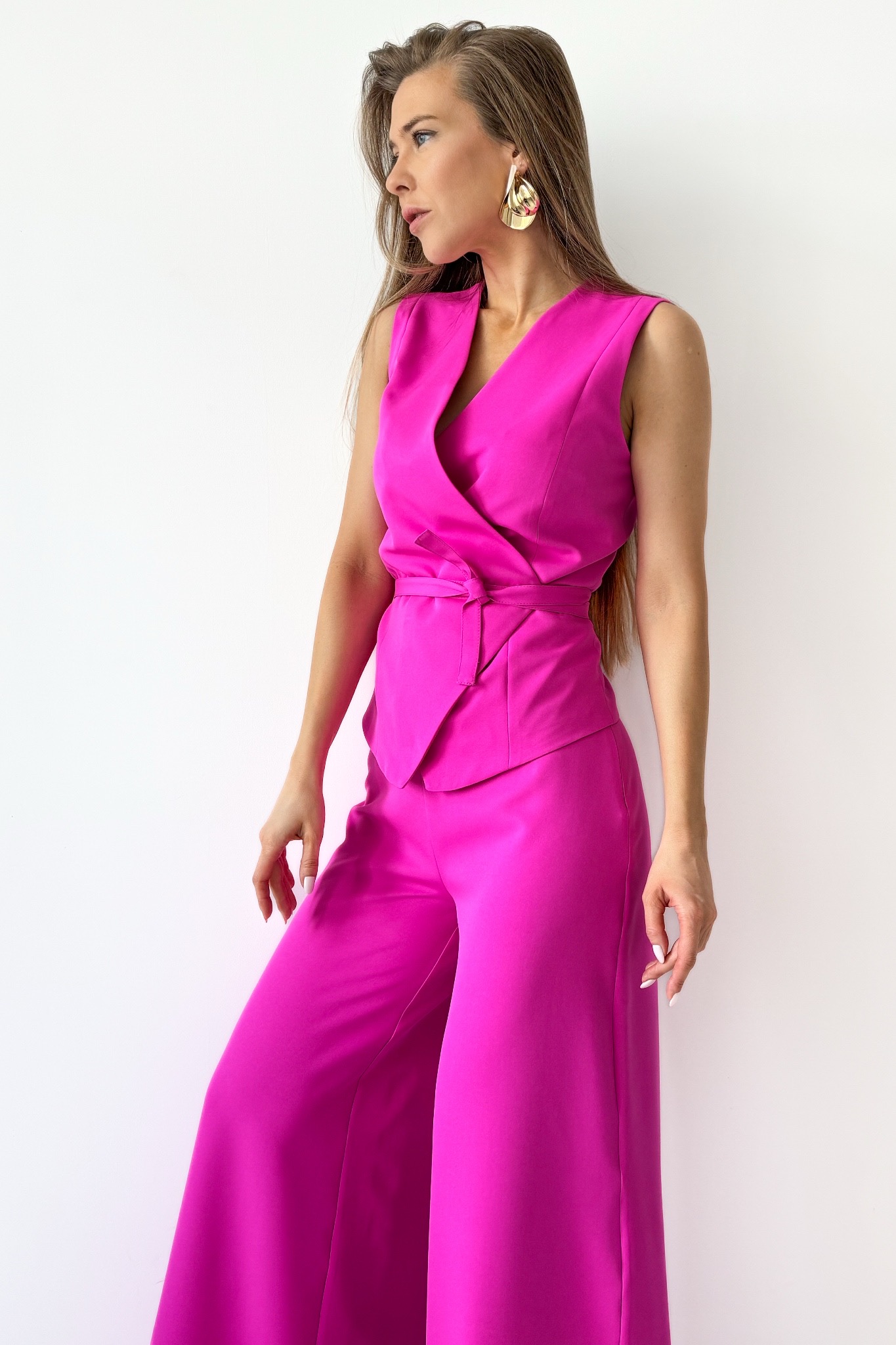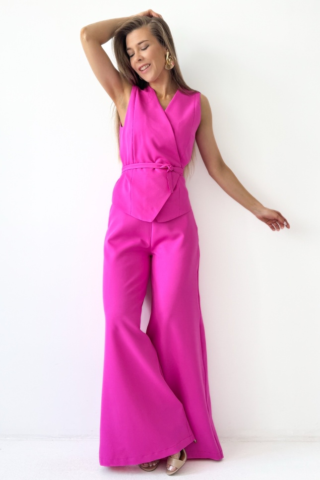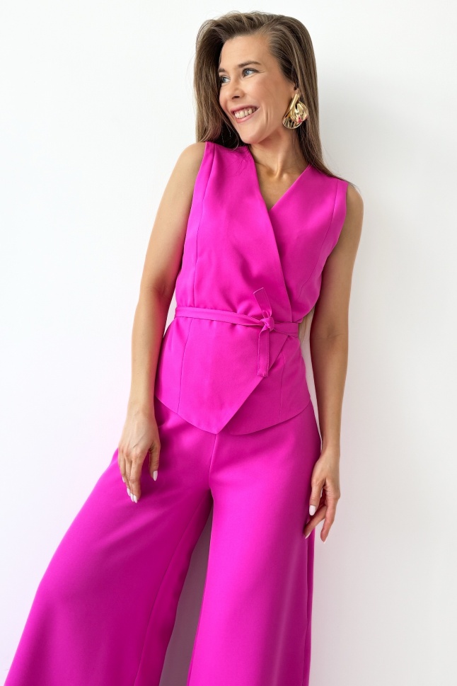 Elegancki komplet z wiązaną kamizelką i spodniami palazzo Coco fuksja