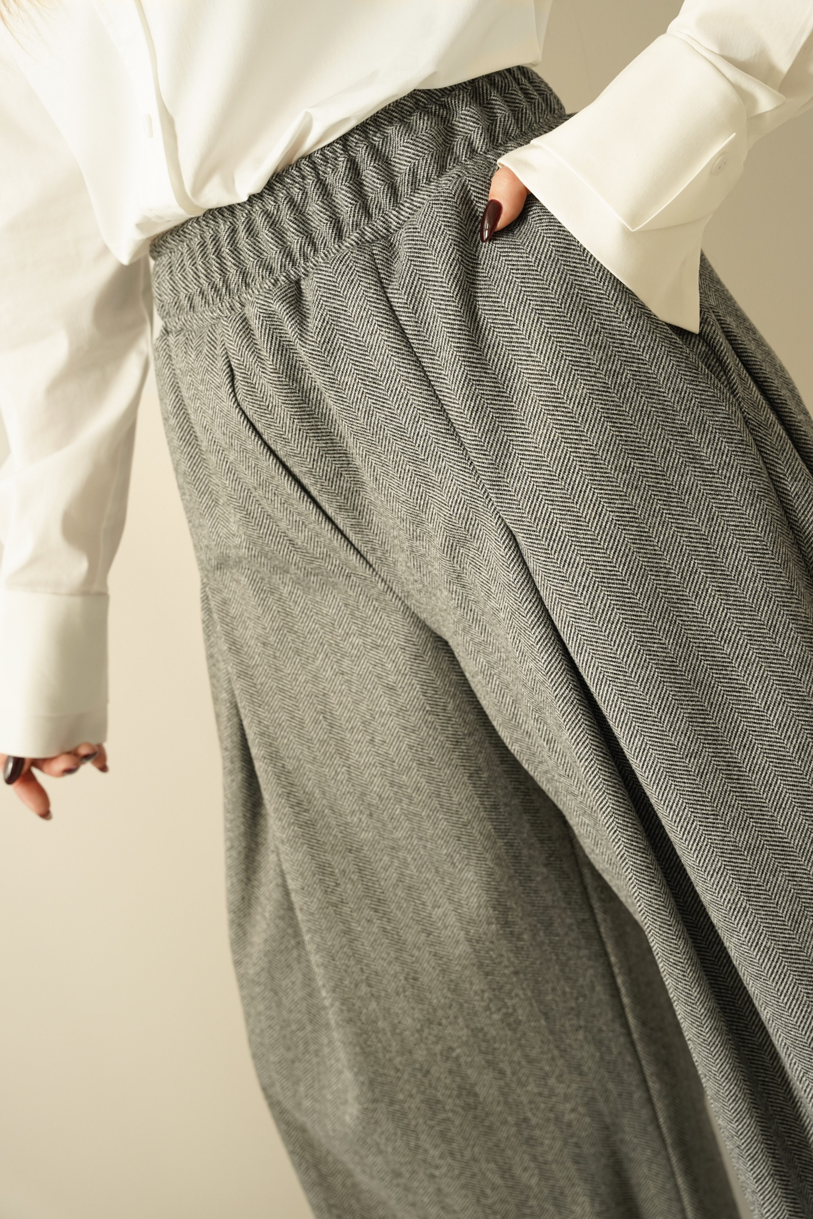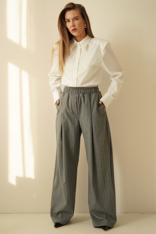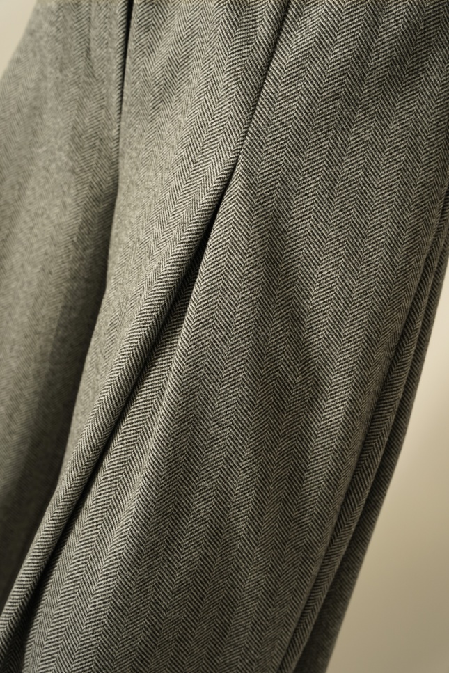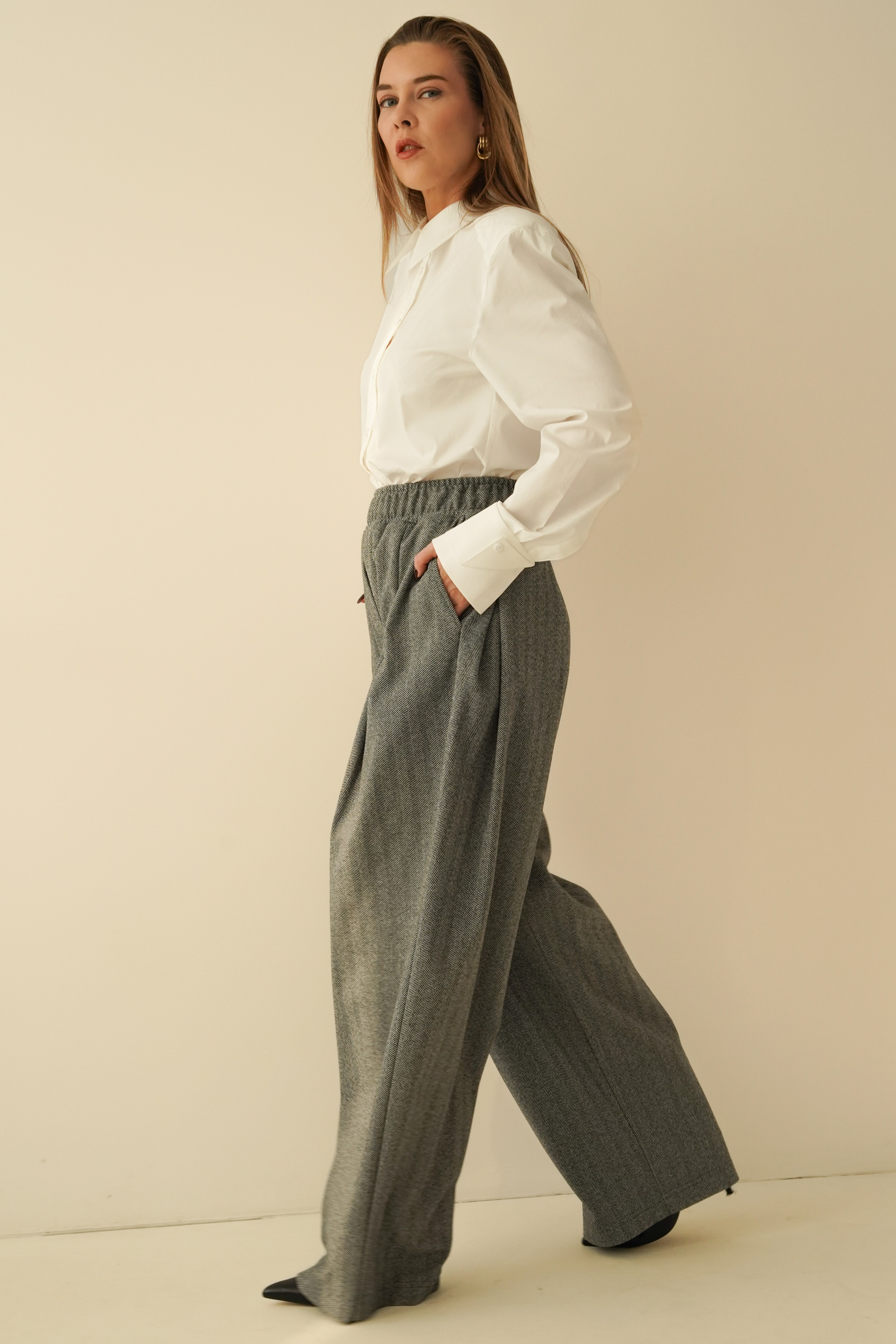 „Heritage Ease” to luźne, szerokie spodnie z zakładkami z przodu i na biodrach, które nadają sylwetce nowoczesnego, lekko architektonicznego kształtu. Wygodna gumka w pasie, praktyczne kieszenie i miękki materiał sprawiają, że noszą się niezwykle komfortowo, a drobna „jodełka” dodaje im eleganckiego, ponadczasowego charakteru.