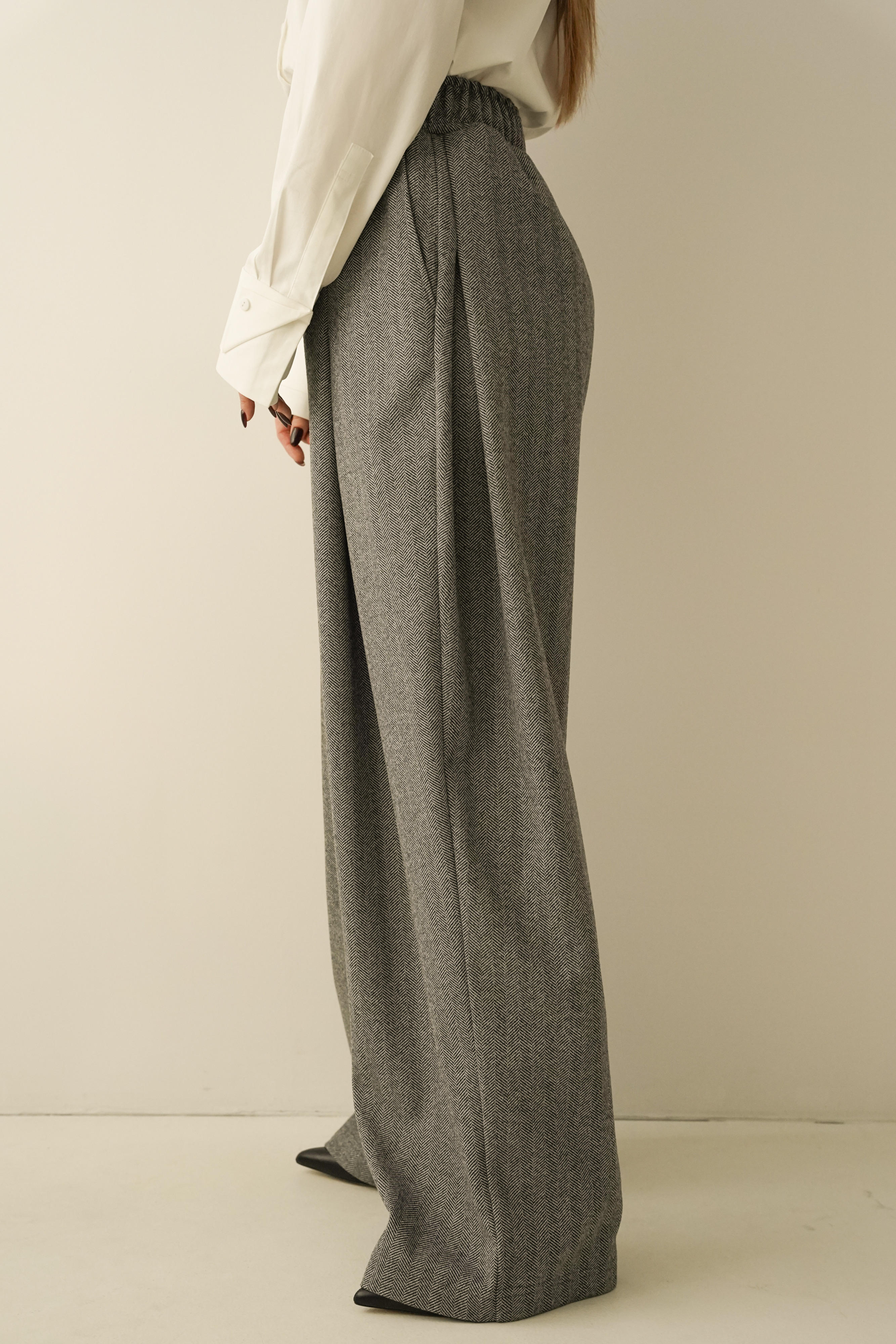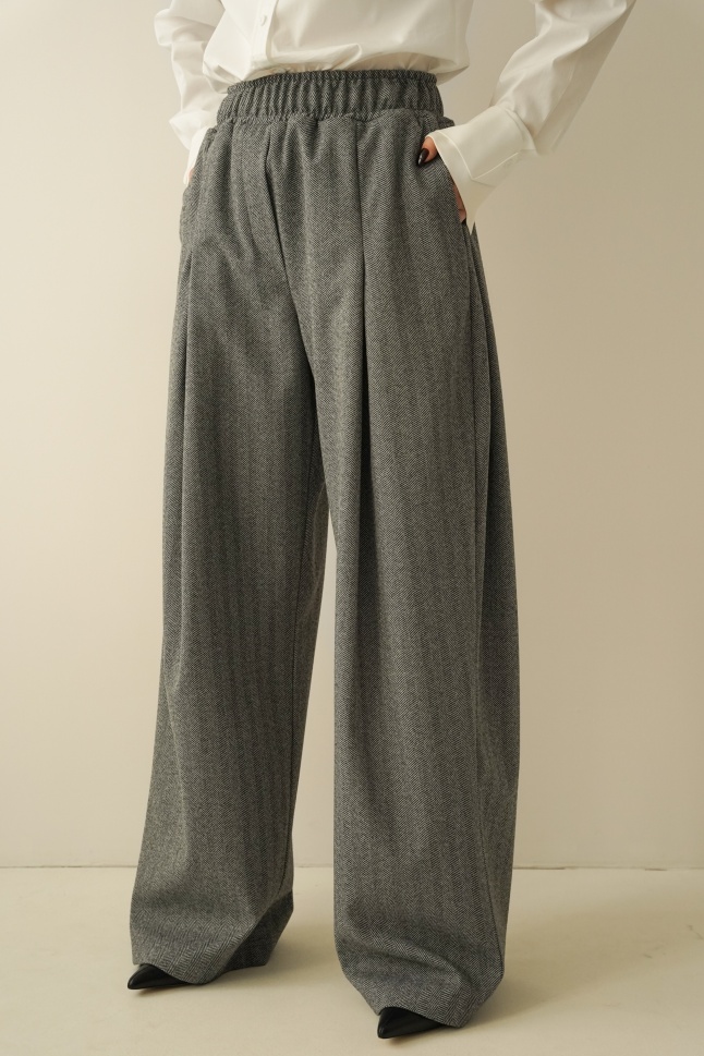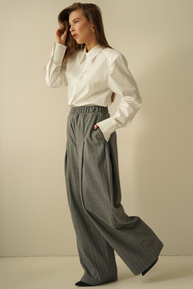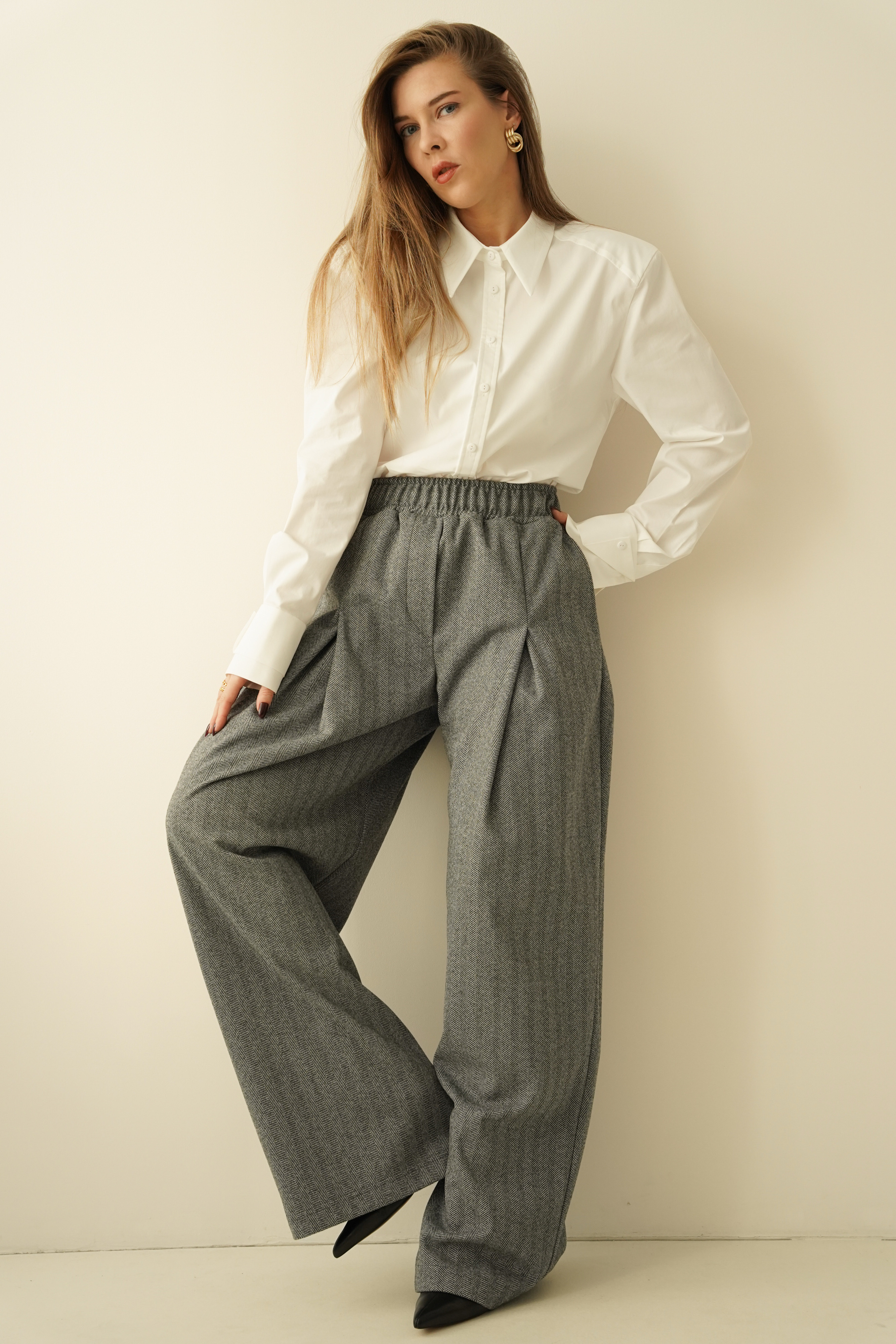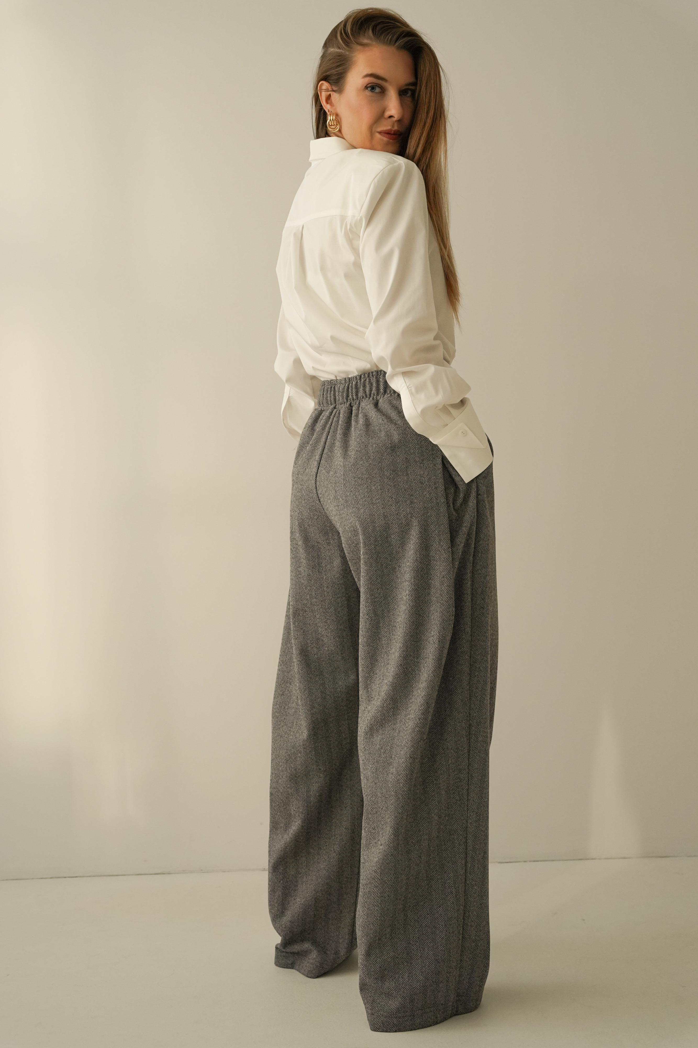 „Heritage Ease” to luźne, szerokie spodnie z zakładkami z przodu i na biodrach, które nadają sylwetce nowoczesnego, lekko architektonicznego kształtu. Wygodna gumka w pasie, praktyczne kieszenie i miękki materiał sprawiają, że noszą się niezwykle komfortowo, a drobna „jodełka” dodaje im eleganckiego, ponadczasowego charakteru.