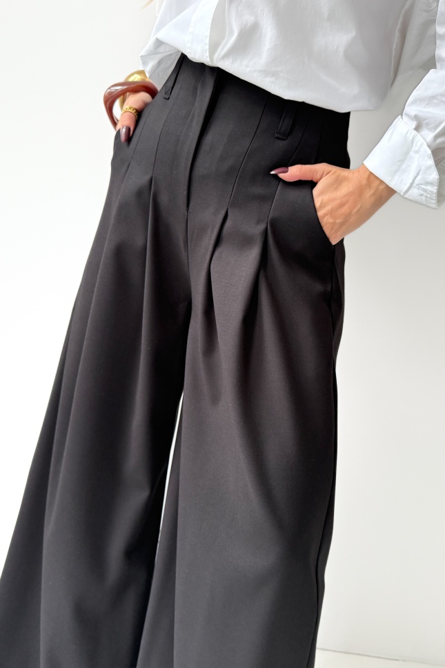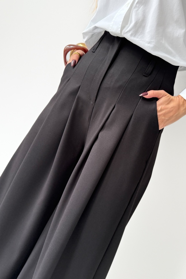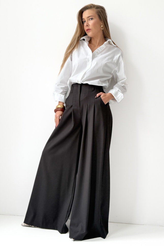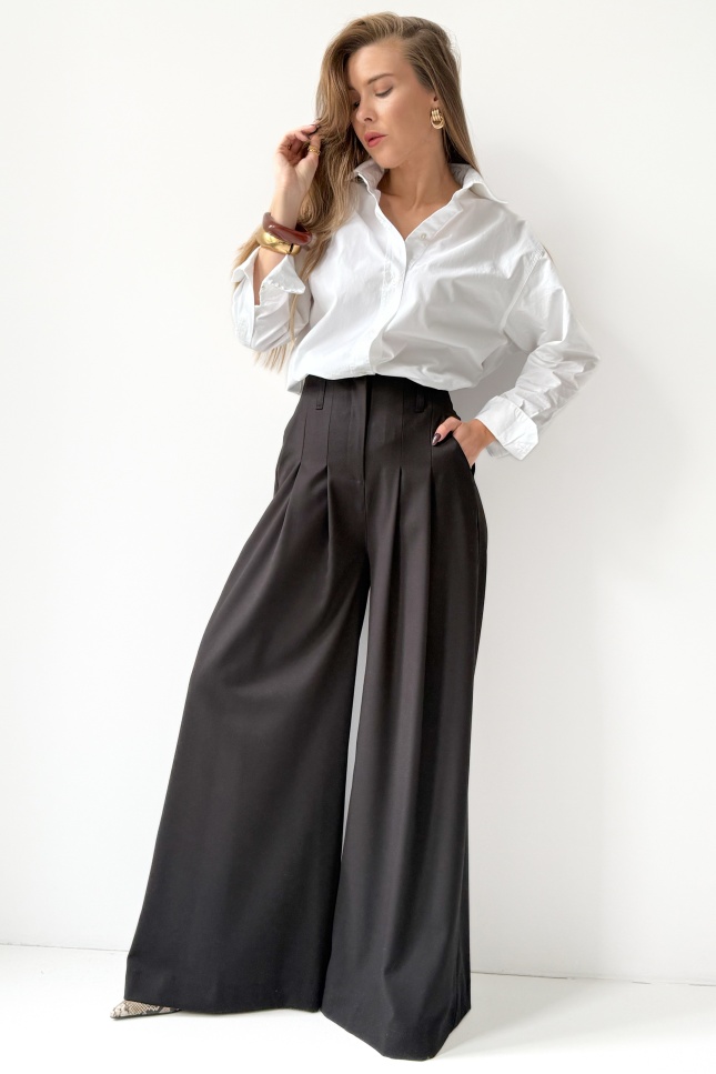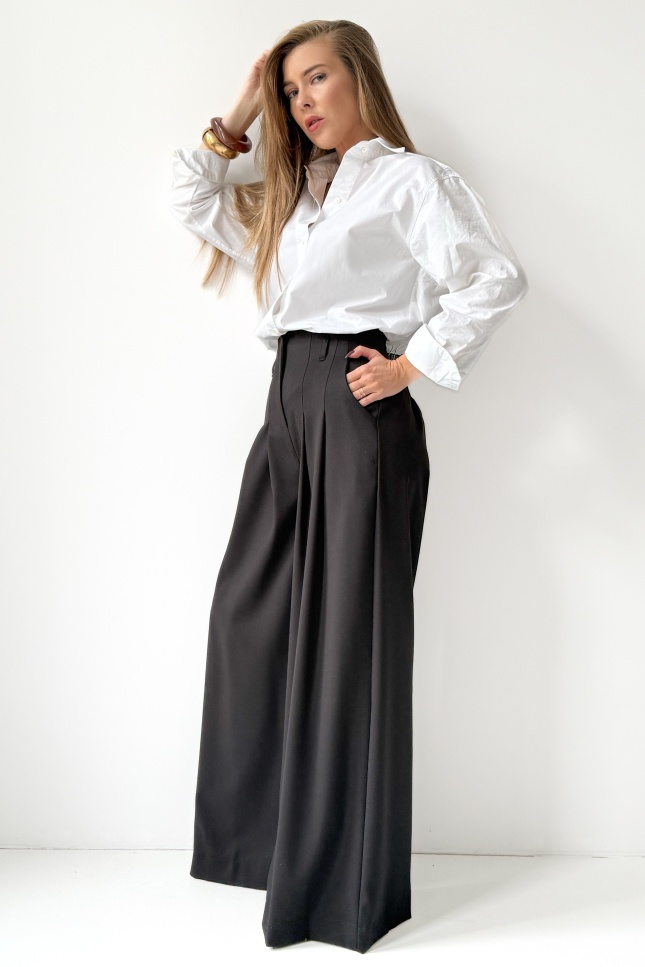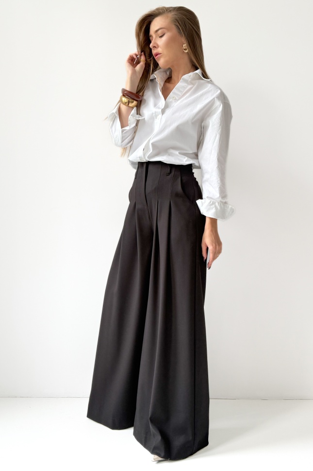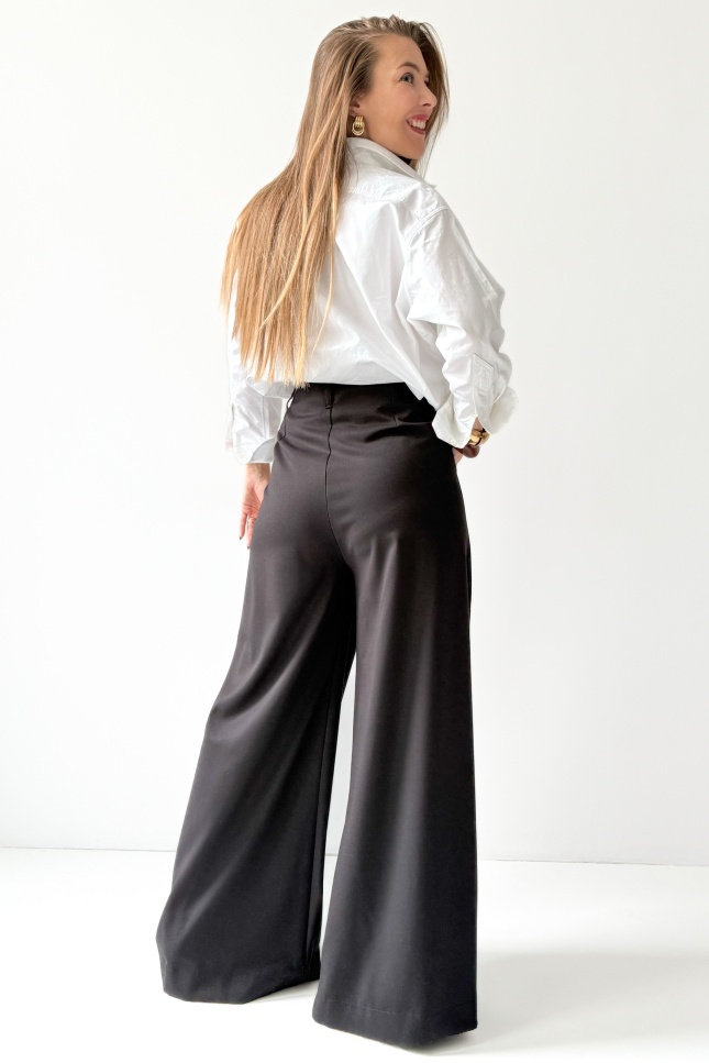 Spodnie Palazzo Flow to esencja nowoczesnej elegancji. Wysoki stan pięknie podkreśla talię, a szerokie, miękko układające się nogawki nadają sylwetce lekkości i wyrafinowanego charakteru. Subtelne zakładki w linii pasa dodają całości architektonicznej formy i sprawiają, że spodnie prezentują się niezwykle szykownie.
