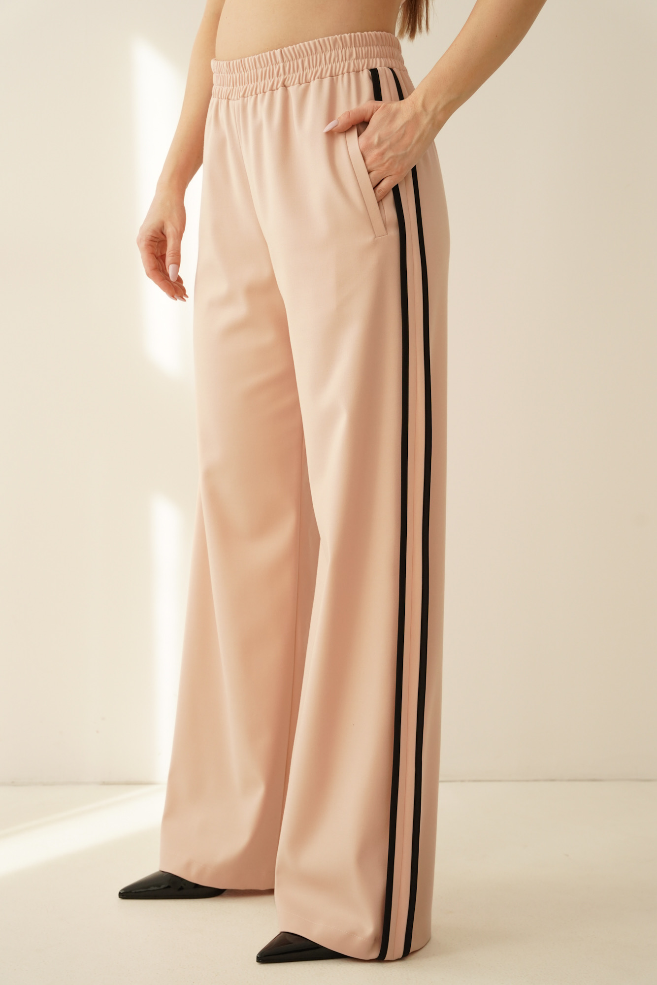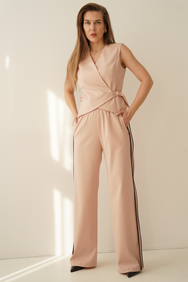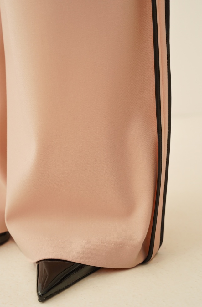 Eleganckie spodnie typu palazzo z charakterystycznym lampasem po bokach. Szeroka nogawka pięknie wydłuża sylwetkę, a elastyczna gumka w pasie zapewnia komfort noszenia bez kompromisu dla formy. Model wyposażony w kieszenie boczne. Idealne do stylizacji eleganckich i nowoczesnych zestawów w duchu premium casual. Spodnie stanowią jedną z 3 części kompletu COLETTE, który możesz skompletować zgodnie z własnymi potrzebami.