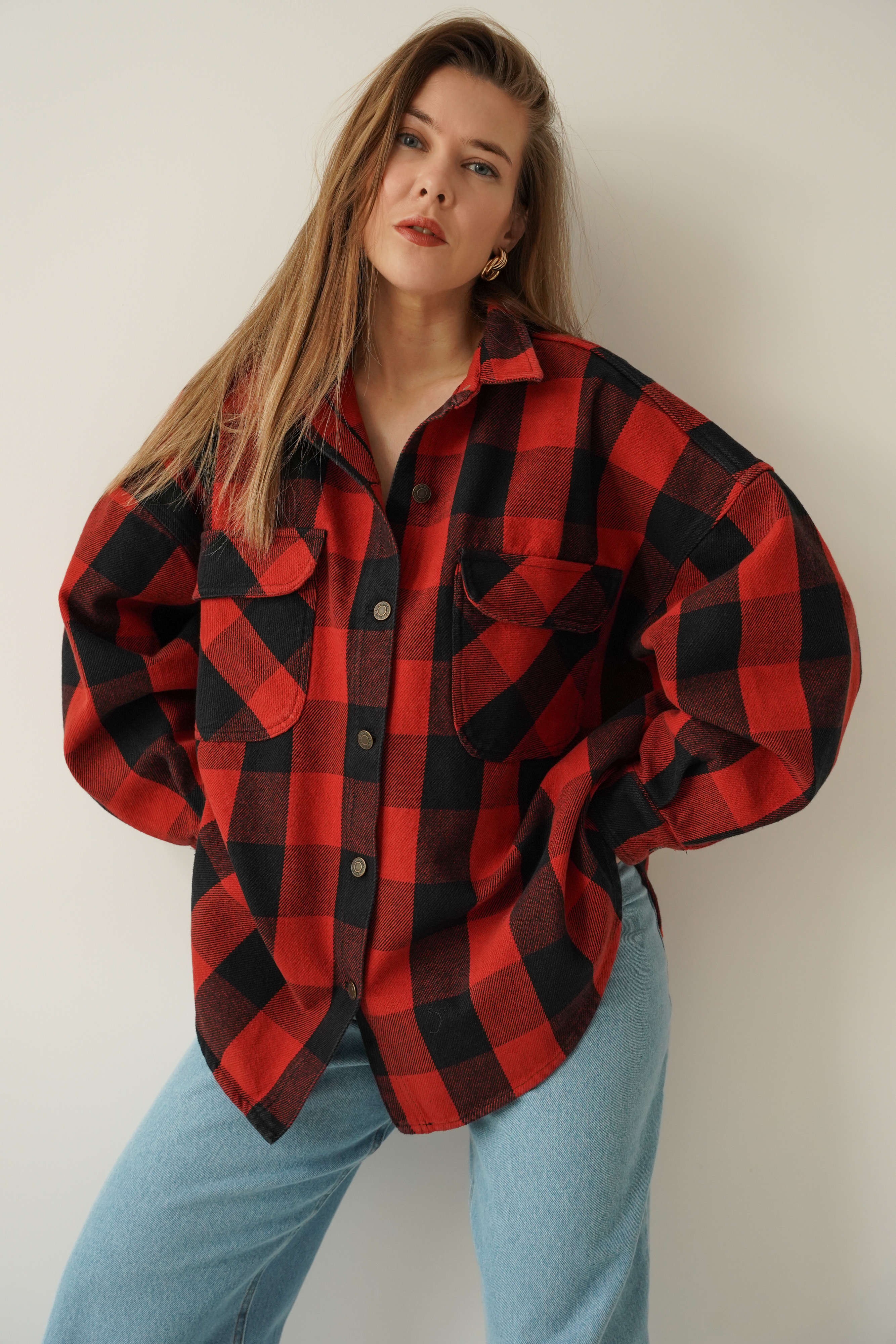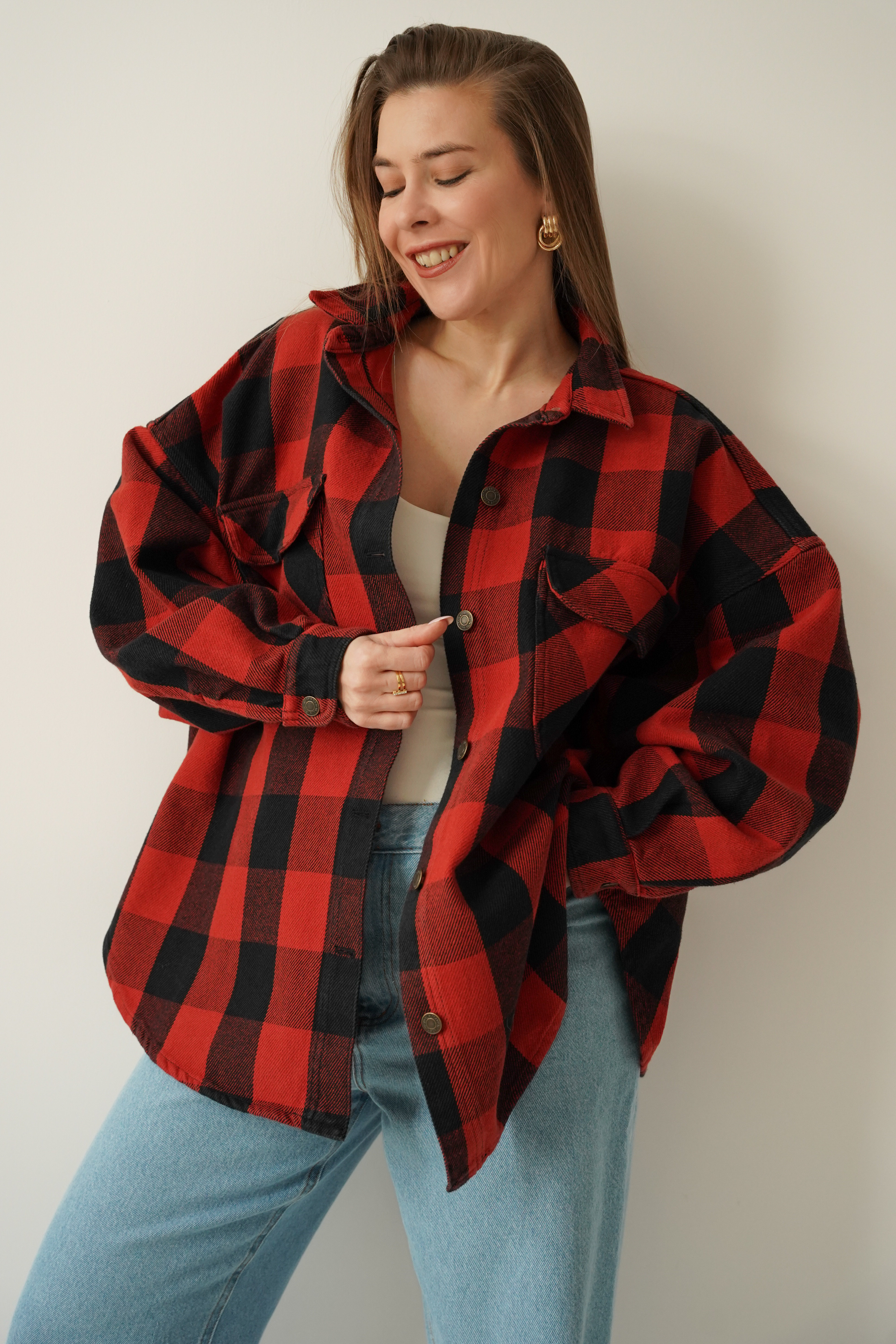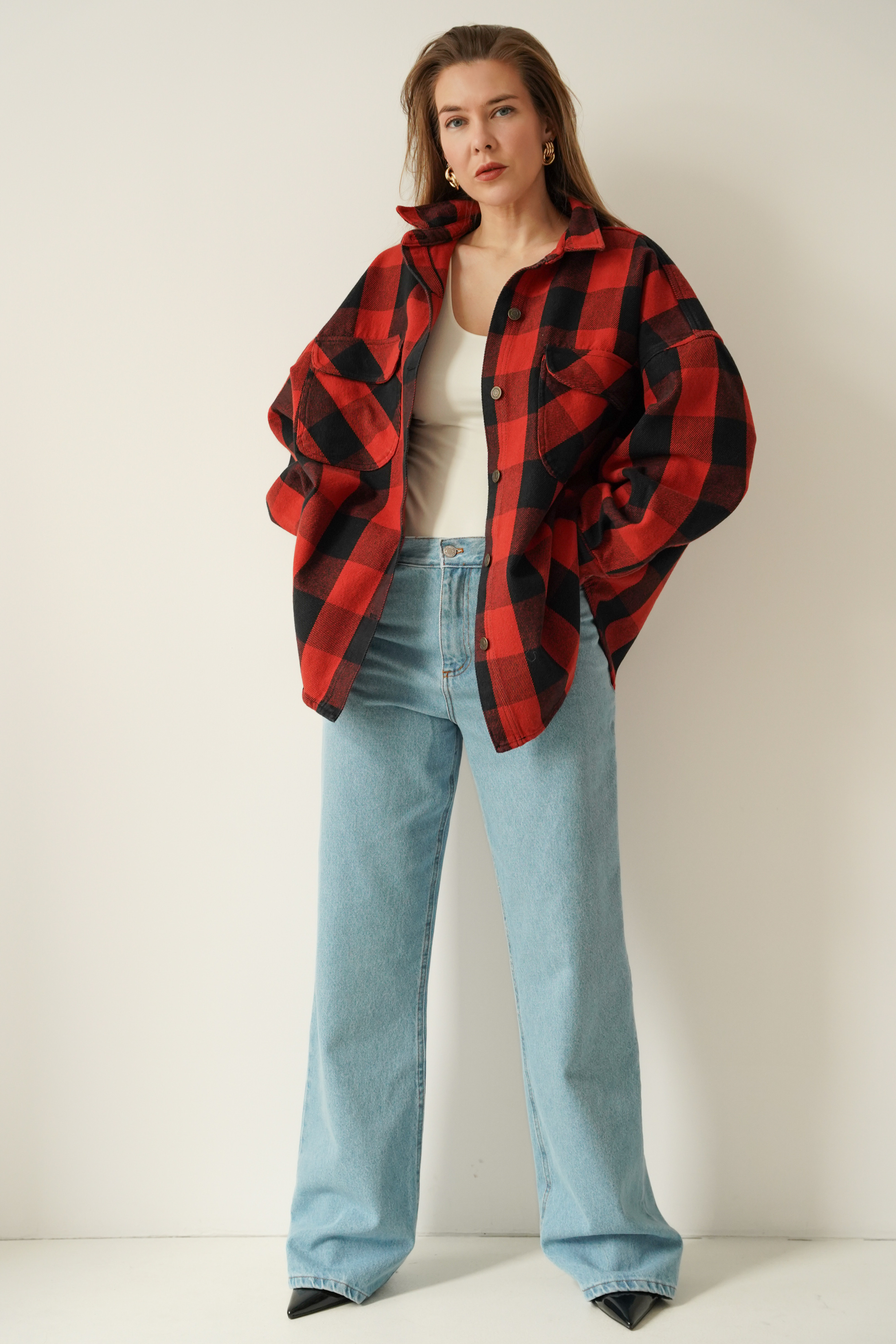 Jeansowa kurtka streetwear Urban czarno-czerwona krata