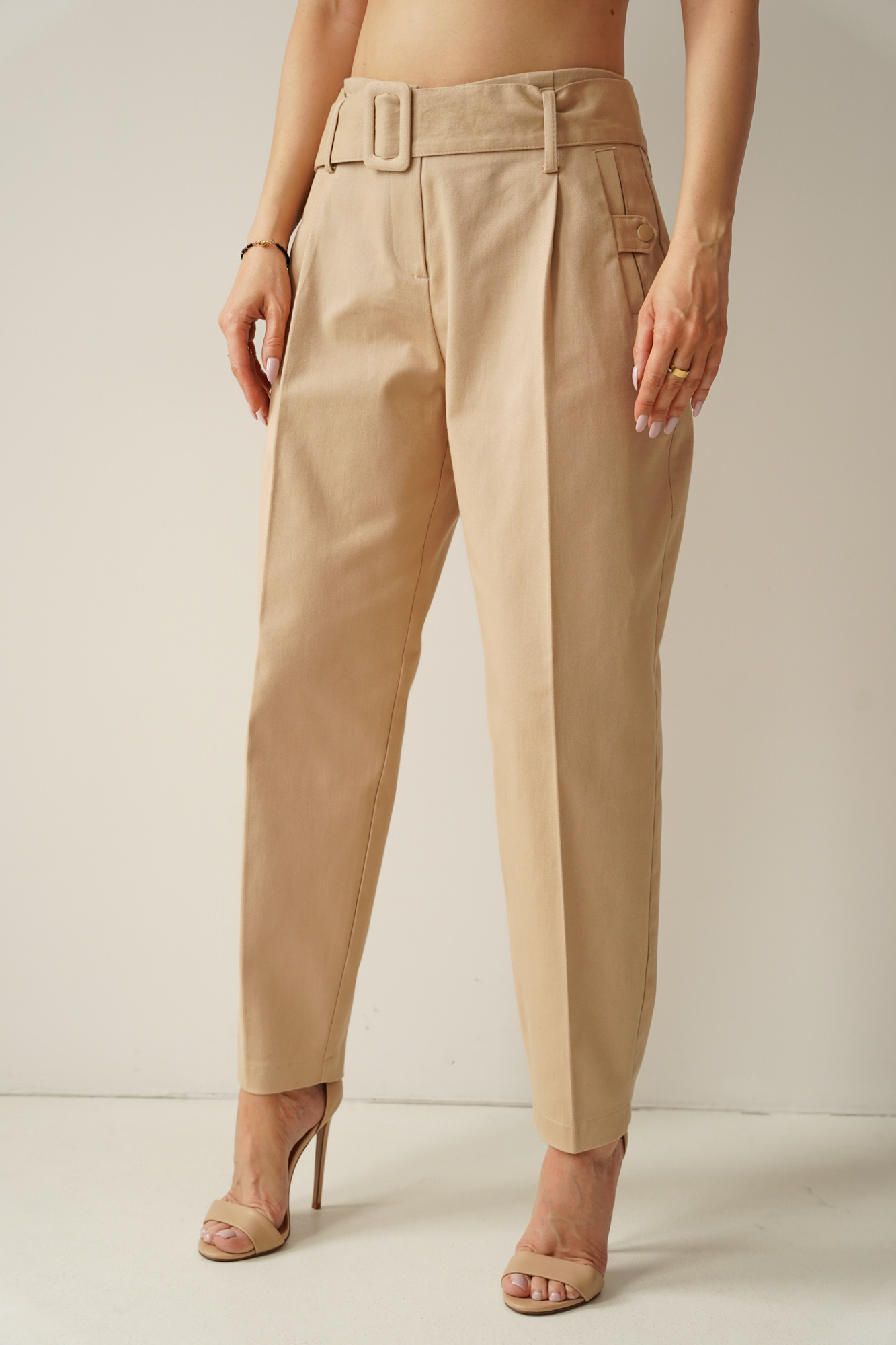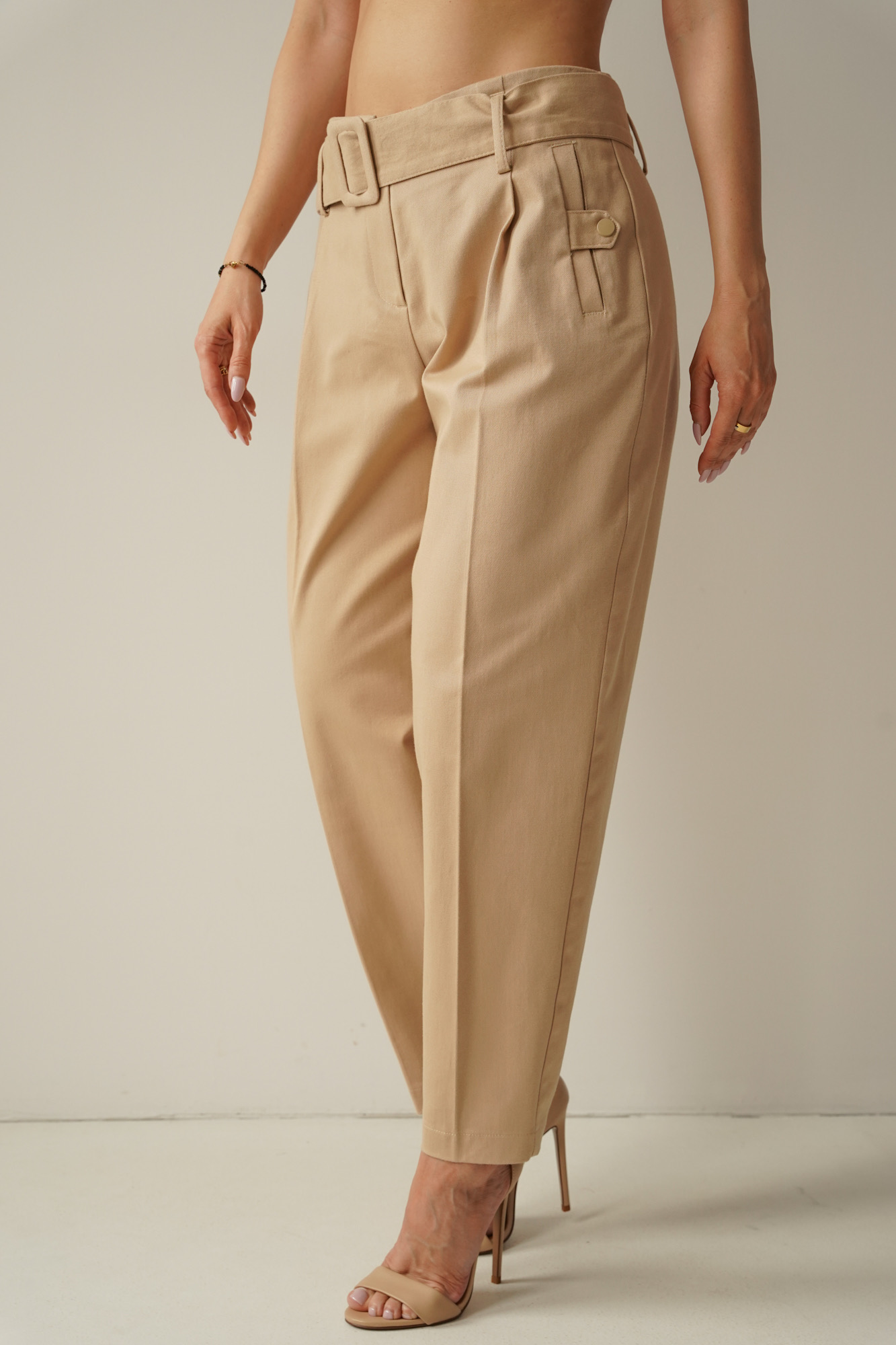 Klasyczny fason spodni inspirowany fasonem baggy, o zwężanych ku dołowi nogawkach, którego stonowany, prosty krój został połączonyz elementami streetwear'owego looku. Oryginalnie wykończone kieszenie boczne, zapinane na napy oraz szeroki pasek z klamrą pod kolor spodni nadają im niebanalnego wyrazu. Wykonane z miękkiego, bawełnianego jeansu, zapewnią Ci komfort noszenia. Ich ponadczasowy design, sprawia, że są idealną bazą wyjściową dla tworzenia wielu stylówek.