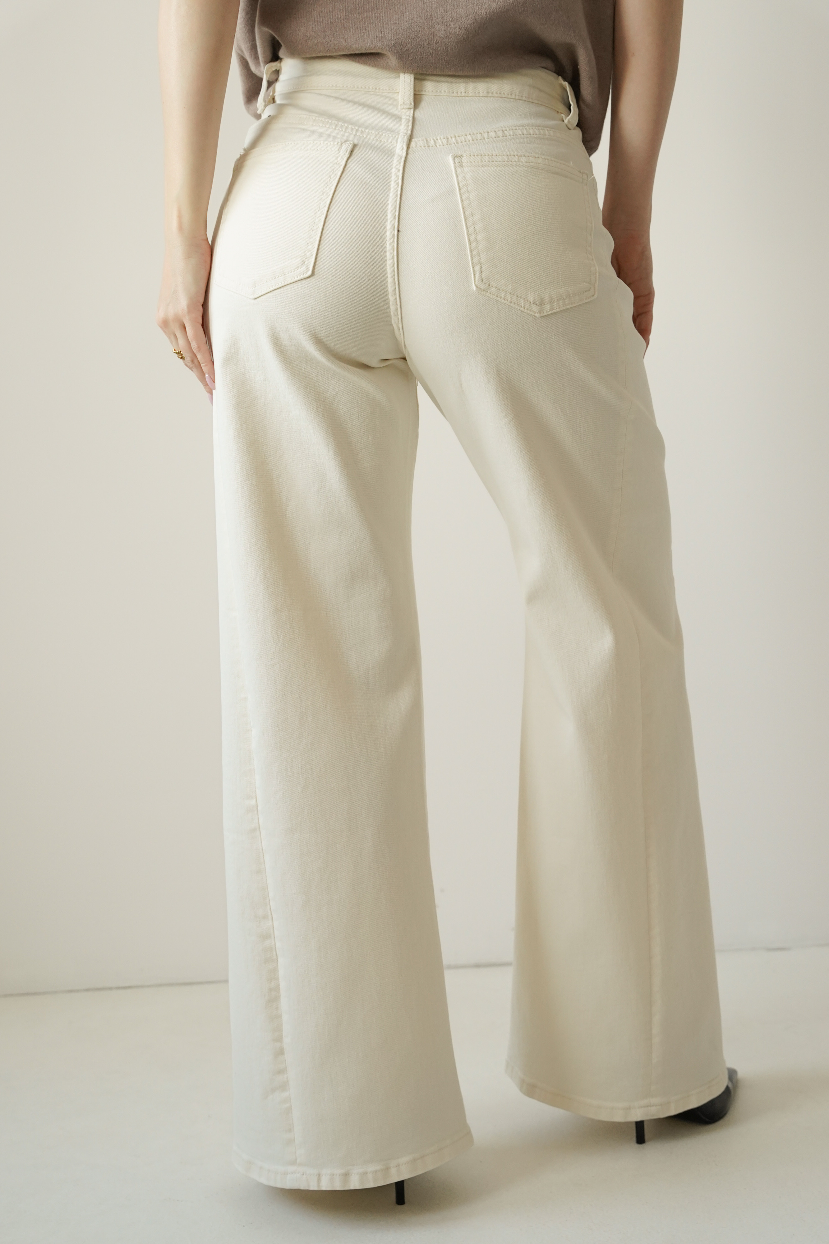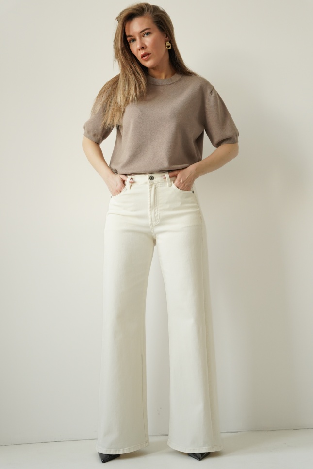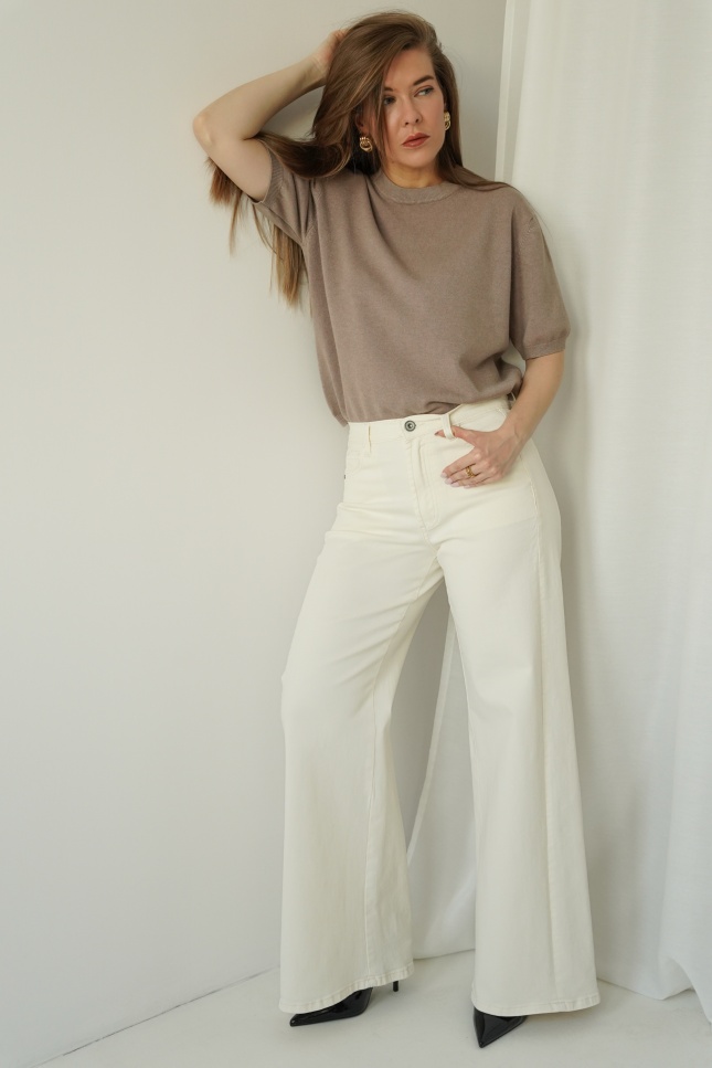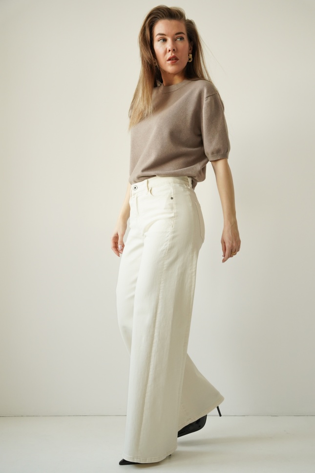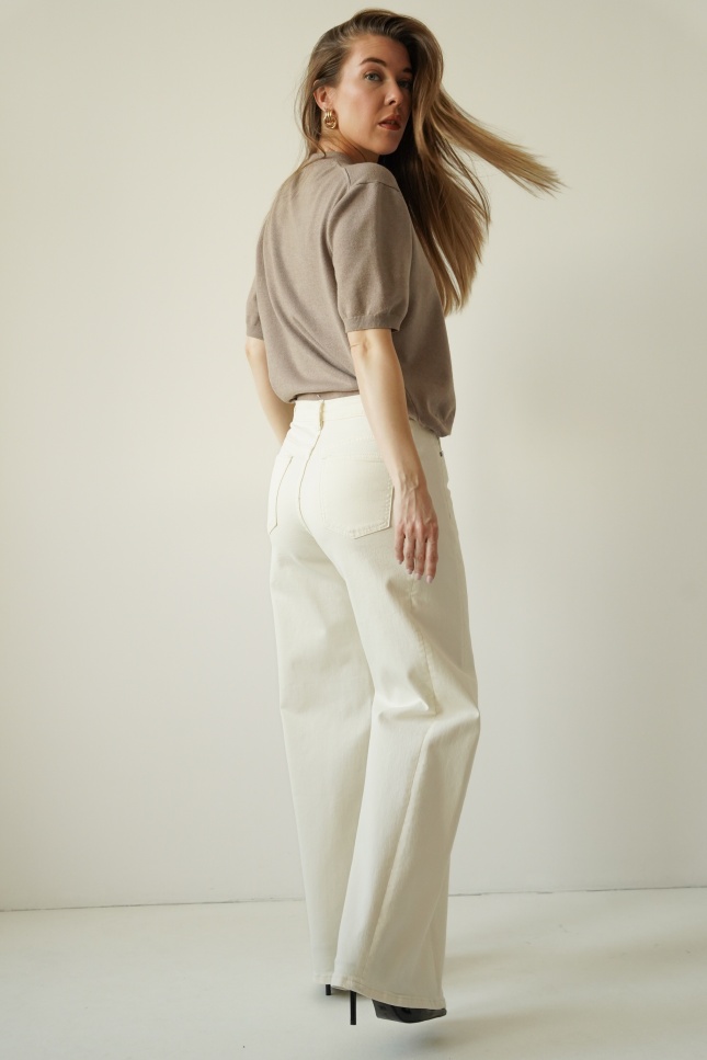 CLOUDE to jeansowe spodnie o fasonie wide leg, wykonane z wysokiej jakości bawełny w modnym odcieniu cloud dancer. Proste, szerokie nogawki, klasyczne zapięcie na guzik i zamek oraz minimalistyczna forma czynią je ponadczasowym wyborem na co dzień i na bardziej dopracowane stylizacje.