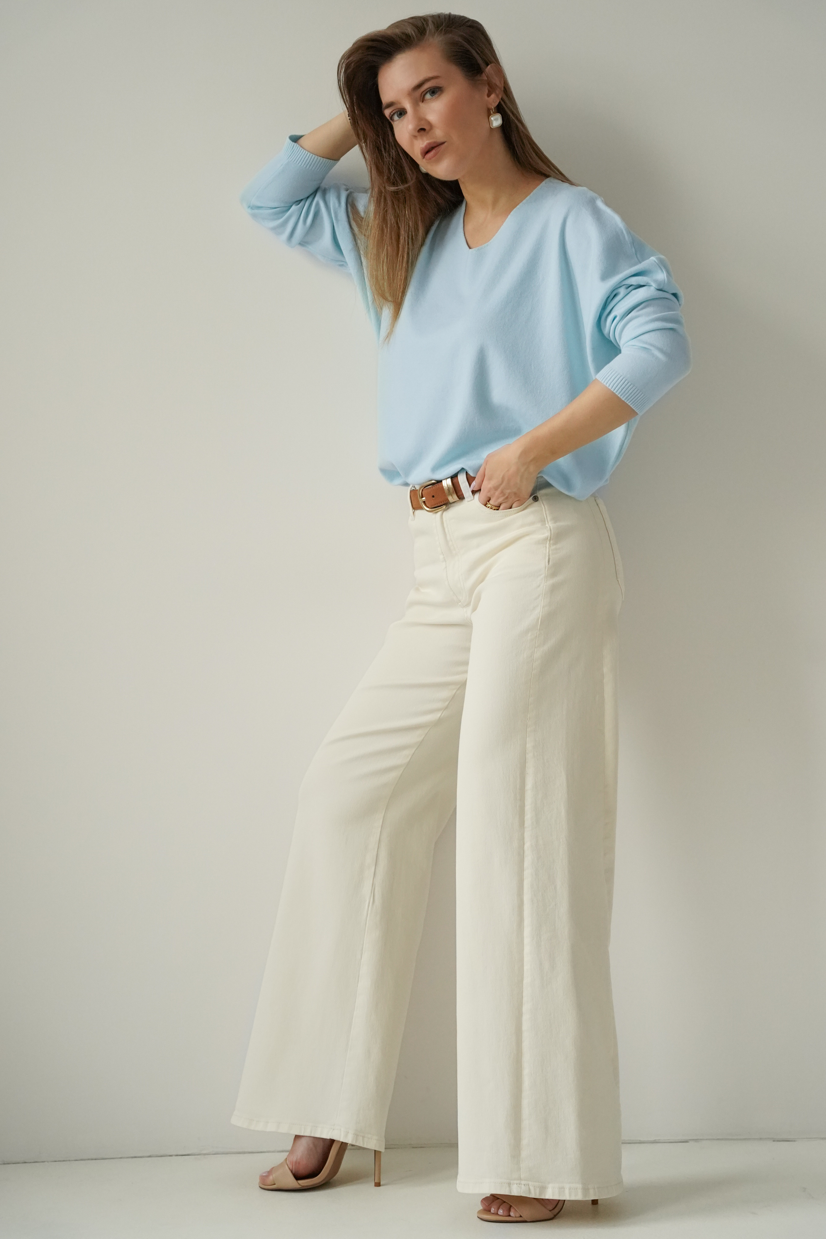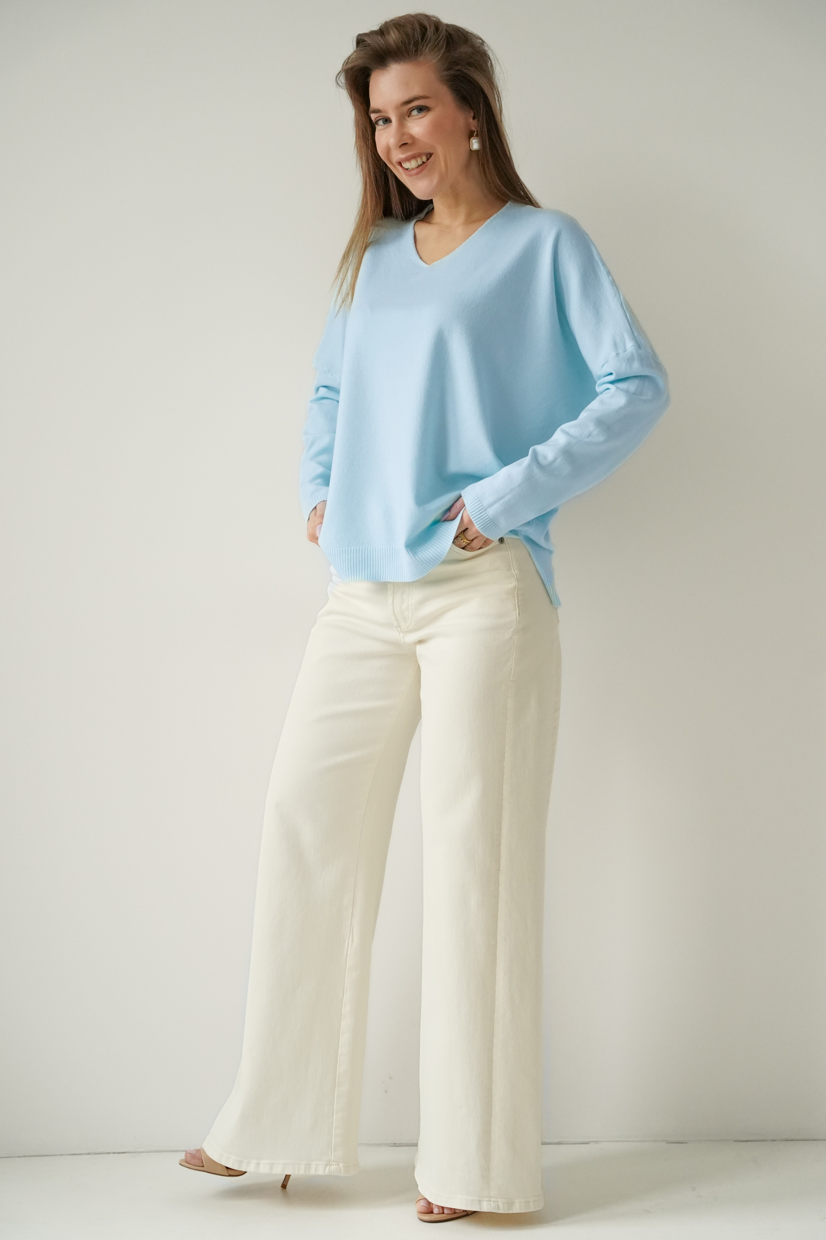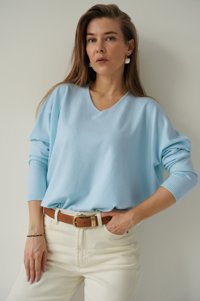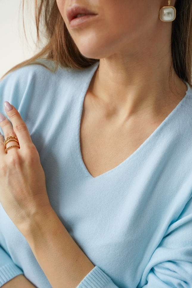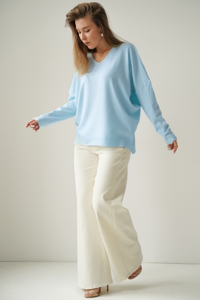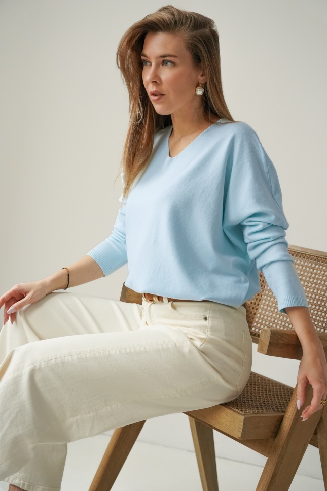 Kaszmirowy sweterek z dekoltem w serek Pura błękitny