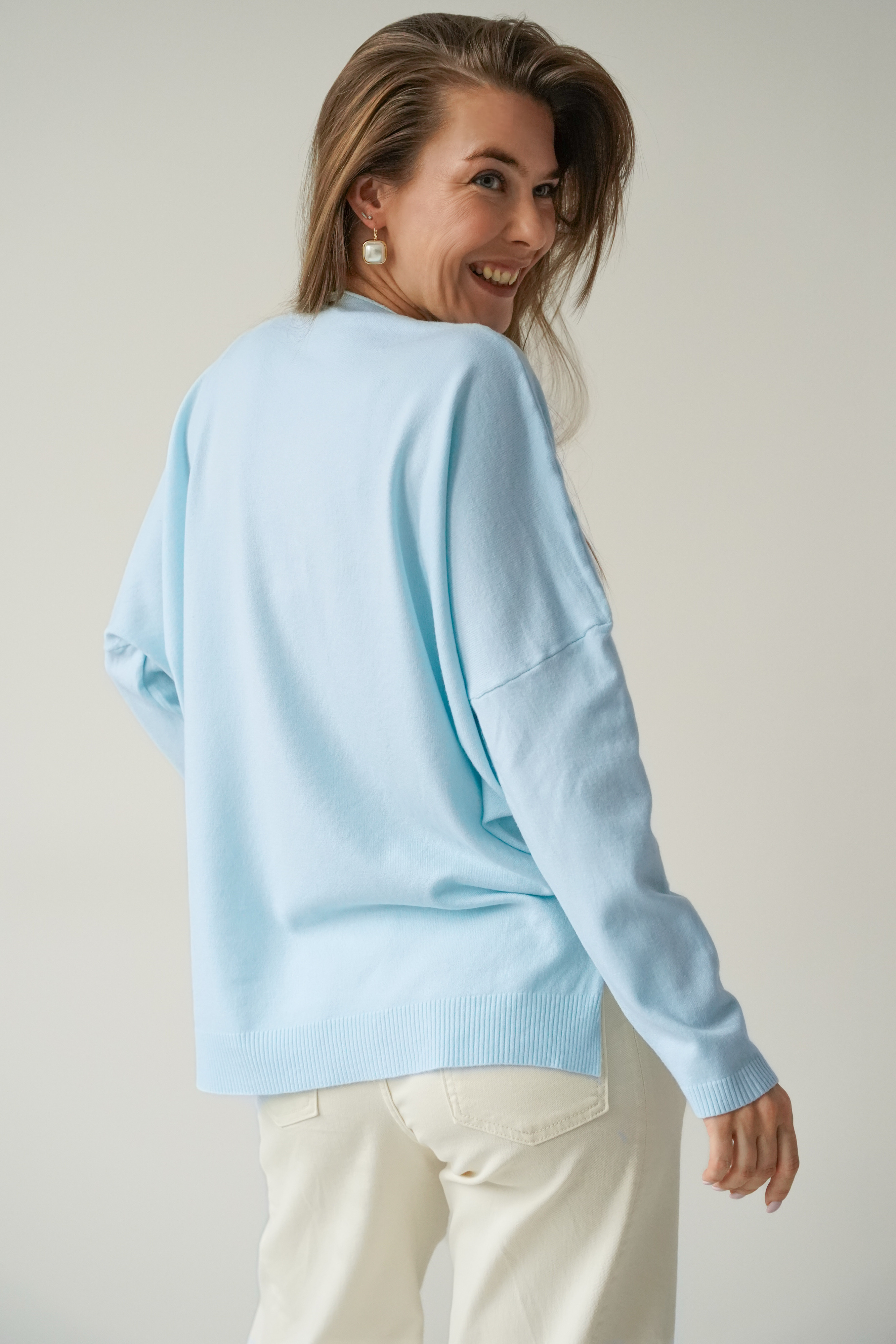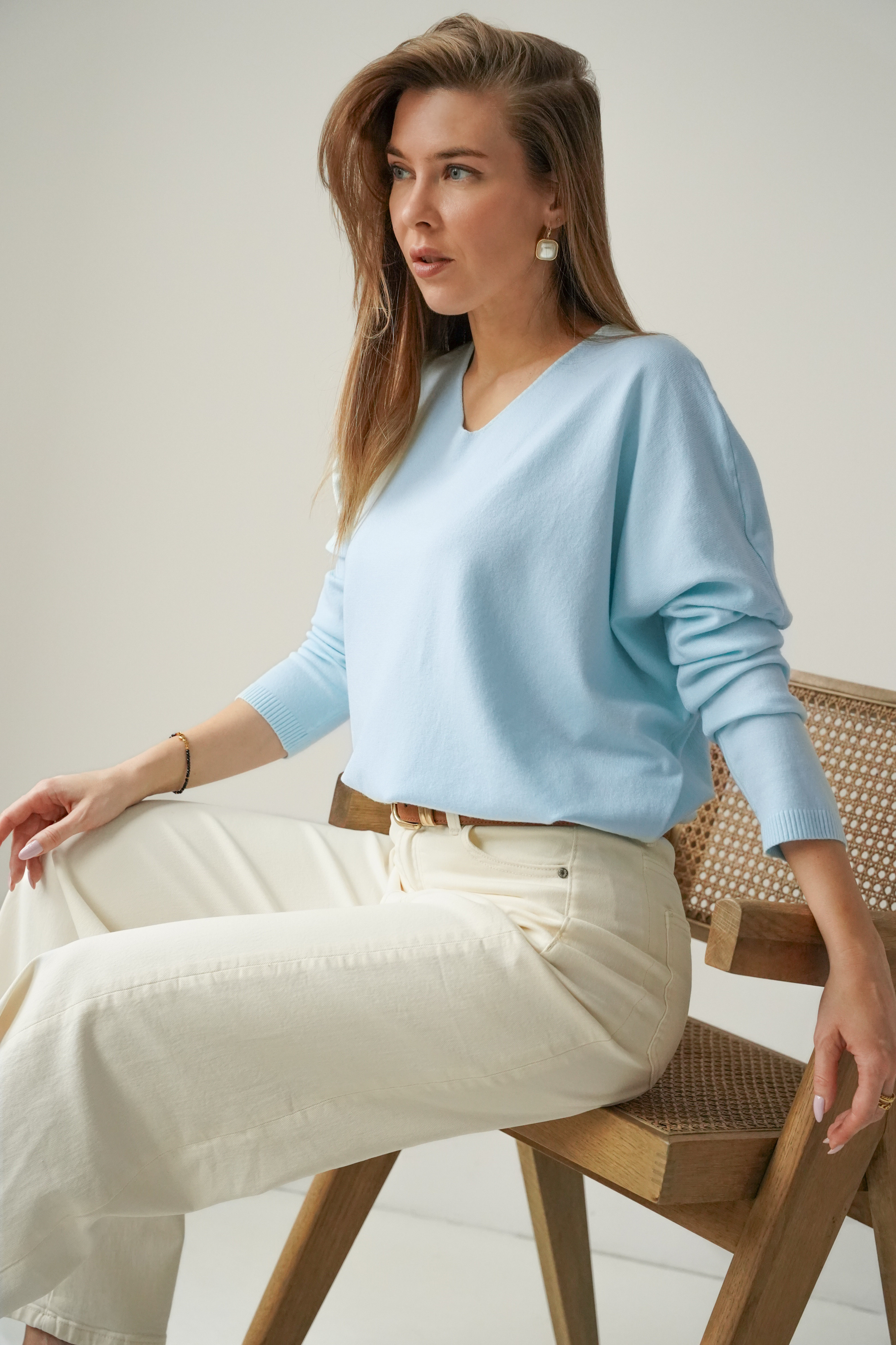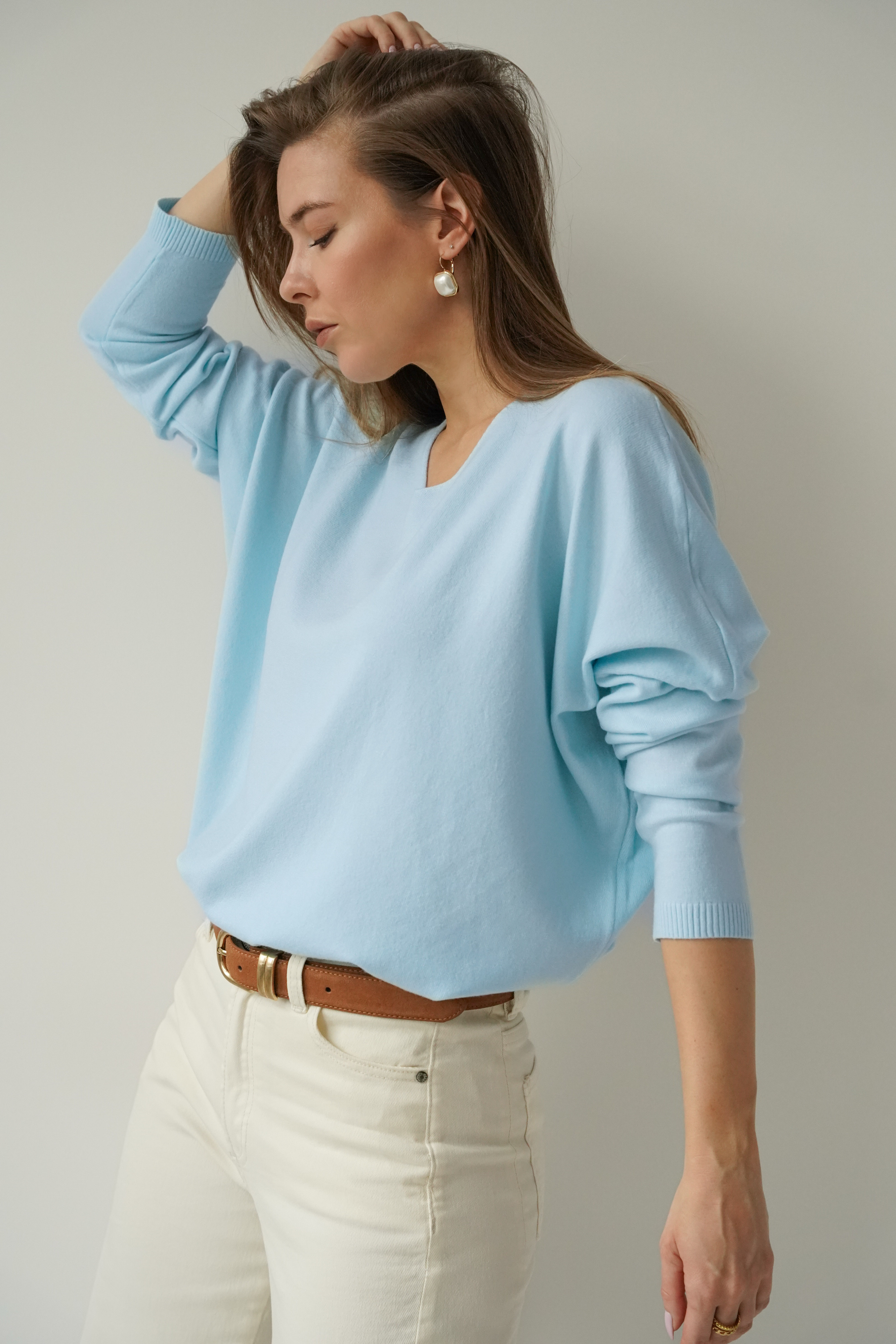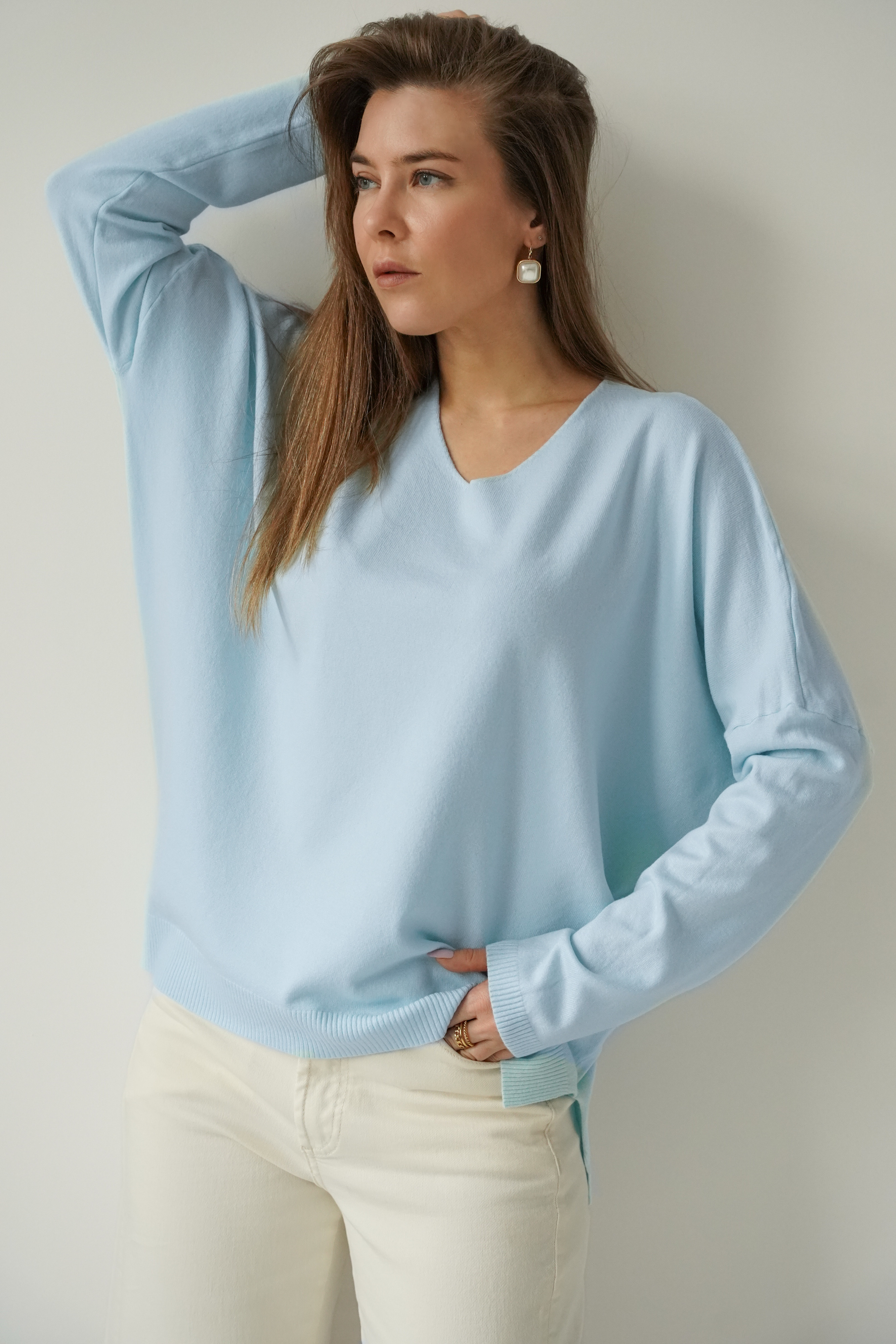 Klasyczny sweterek z dekoltem V wykonany z miękkiej, przyjemnej dla ciała dzianiny  z kaszmirem w składzie. Prosty krój z raglanowym rękawem, subtelnie przełamany niewielką asymetrią- w postaci lekko przedłużonej tylniej części oraz pęknięciami po bokach. PURA  to ponadczasowy model, który będzie świetną bazą dla stylizacji zarówno eleganckich jak i casualowych.