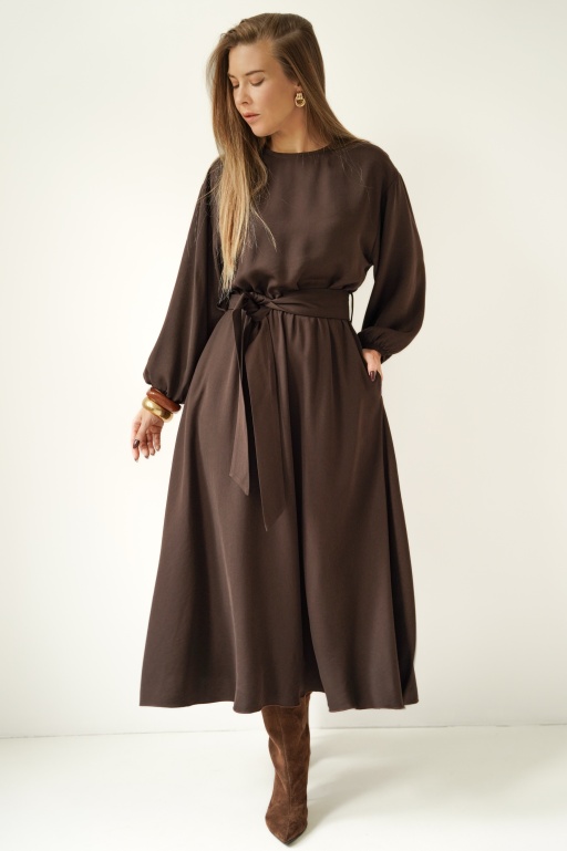 Rozkloszowana sukienka z bufiastymi rękawami Amelie czekolada