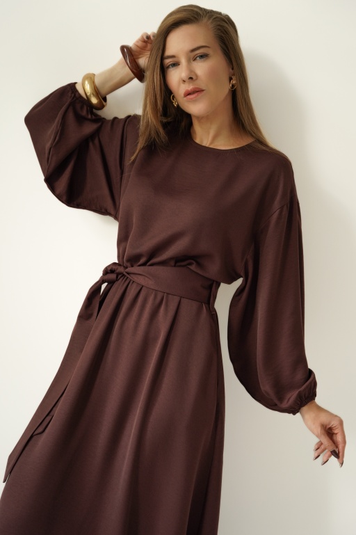 Rozkloszowana sukienka z bufiastymi rękawami Amelie spicy chocolate