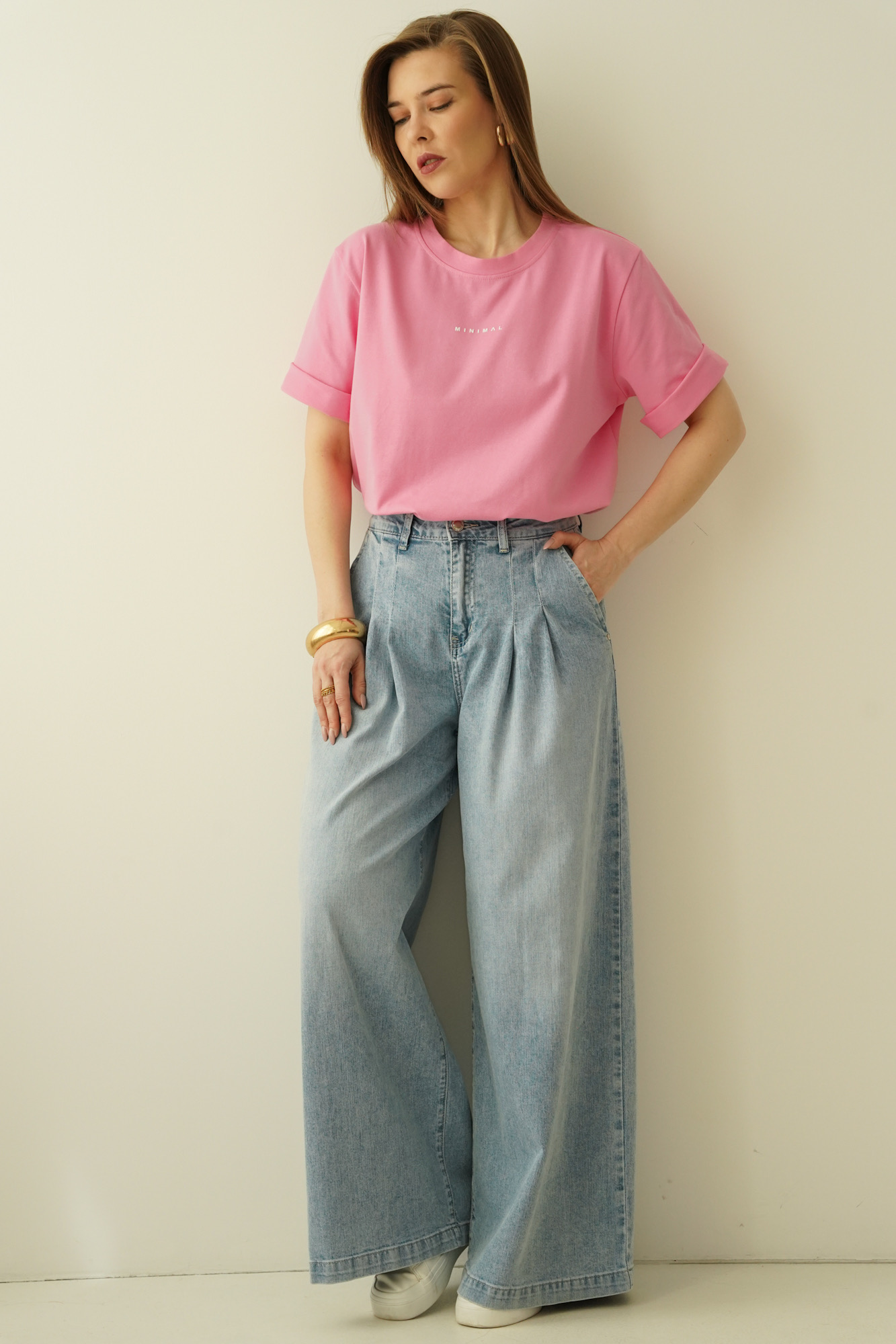 Minimalistyczny design czyni z niego niezastąpioną bazę garderoby – sprawdzi się zarówno w niezobowiązujących, miejskich stylizacjach, jak i w modnych zestawieniach o charakterze smart casual. Łącząc go z szerokimi spodniami typu palazzo, jeansową midi spódnicą lub klasycznymi cygaretkami uzyskasz świeży, modny look. W chłodniejsze dni świetnie sprawdzi się pod oversize'ową marynarką lub jeansową kurtką.