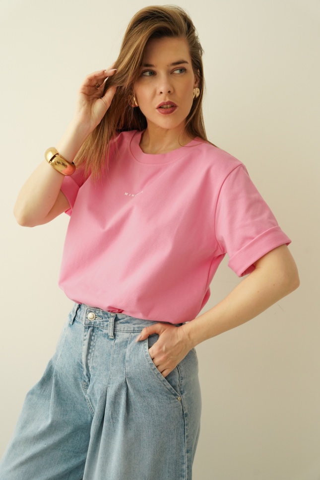 Klasyczny, basicowy t-shirt z minimalistycznym nadrukiem to kwintesencja współczesnej prostoty. Wykonany z miękkiej, delikatnej bawełny z subtelnym dodatkiem elastanu, doskonale dopasowuje się do sylwetki, zapewniając komfort noszenia przez cały dzień.
