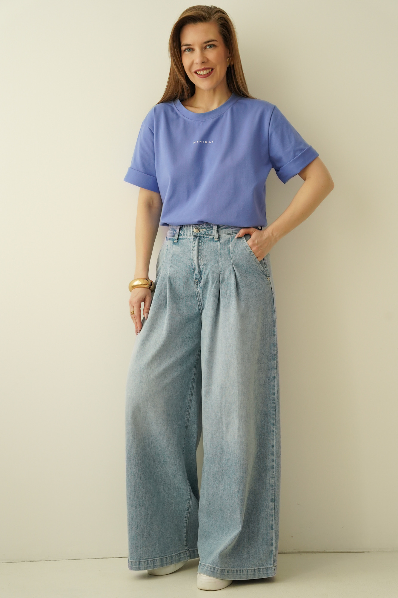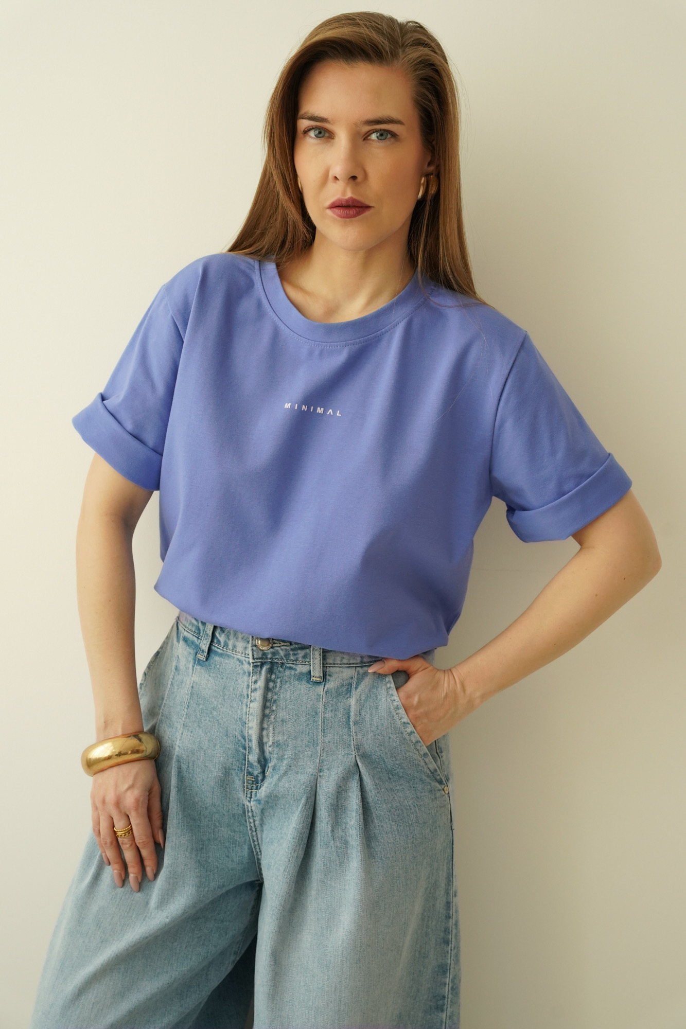 Klasyczny, basicowy t-shirt z minimalistycznym nadrukiem to kwintesencja współczesnej prostoty. Wykonany z miękkiej, delikatnej bawełny z subtelnym dodatkiem elastanu, doskonale dopasowuje się do sylwetki, zapewniając komfort noszenia przez cały dzień.