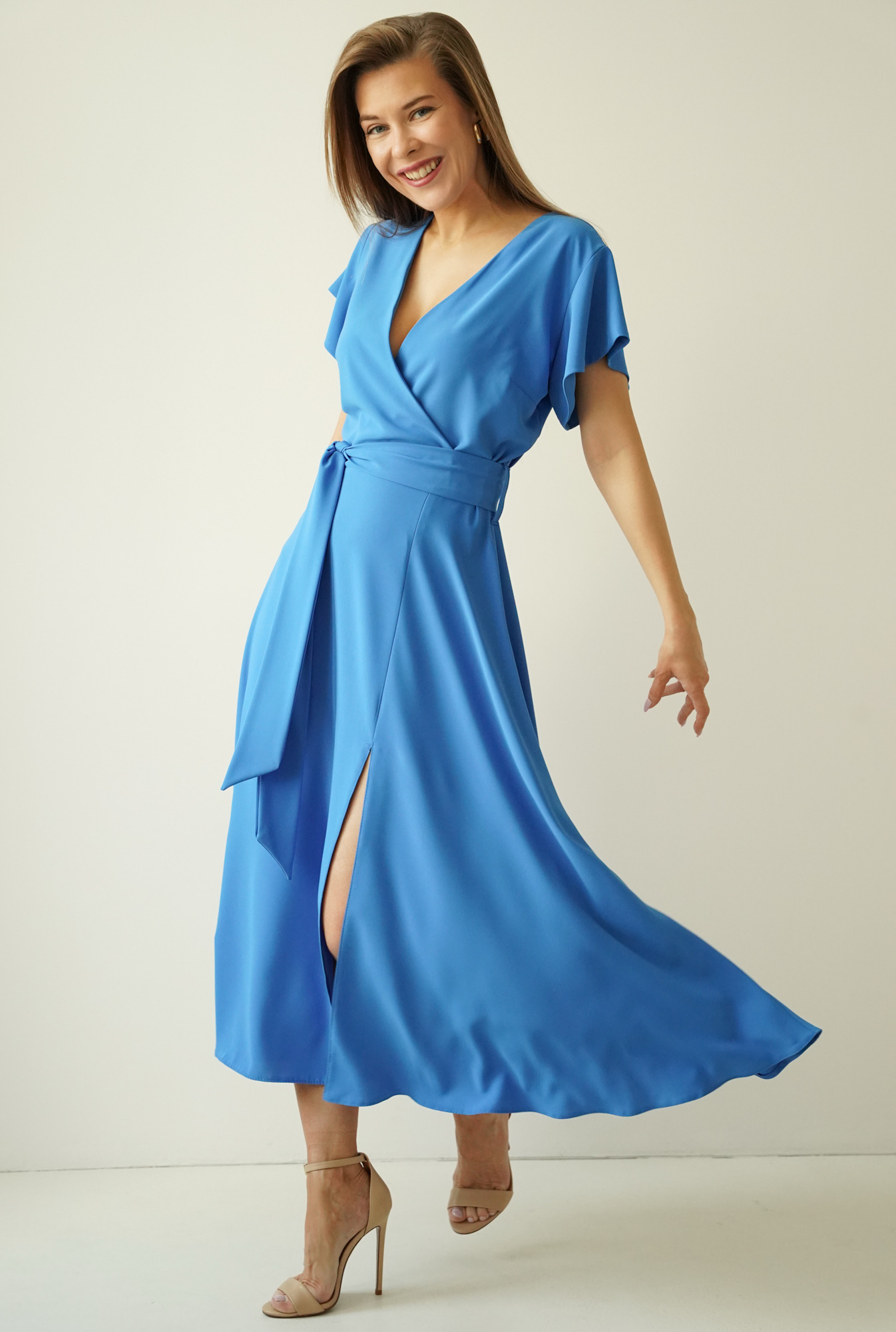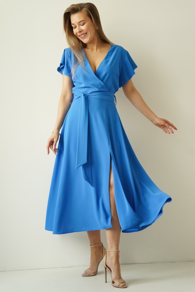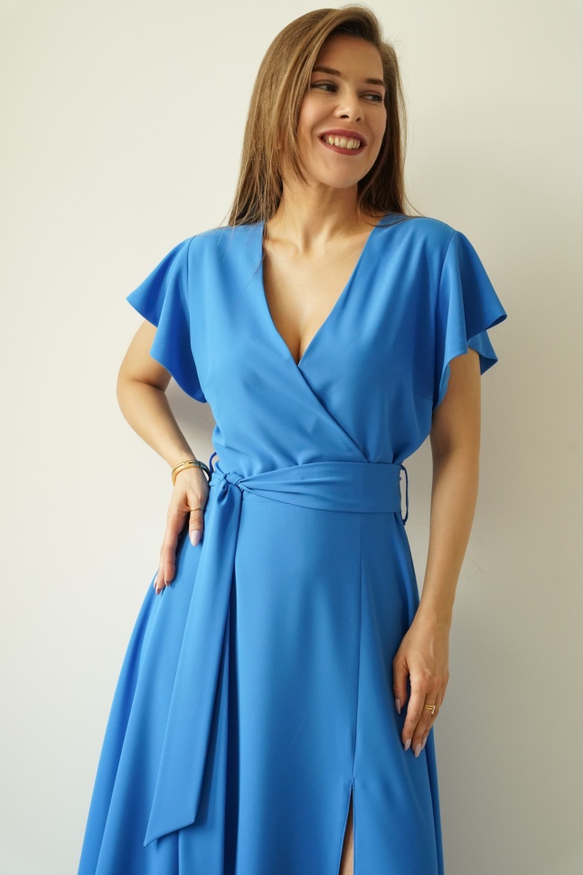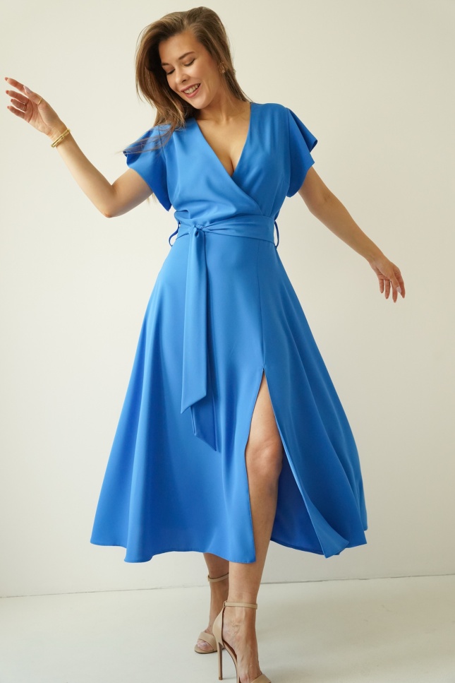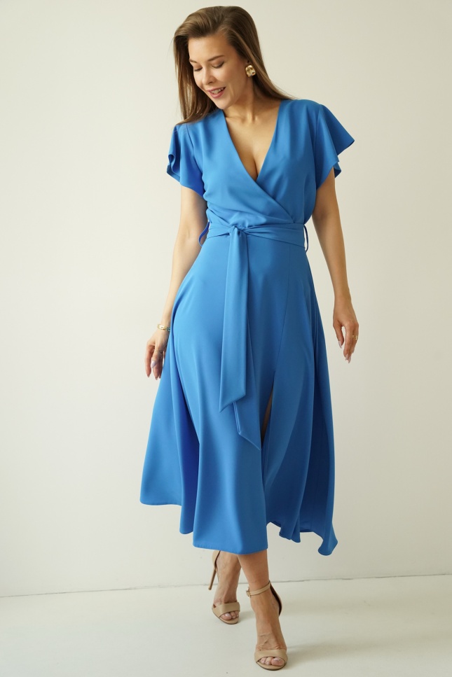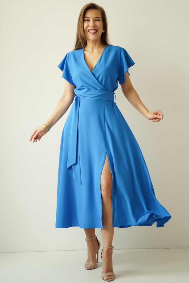Sukienka „Feminine Charm” to kwintesencja kobiecej subtelności połączonej z ponadczasową elegancją. Rozkloszowany fason z efektownym rozcięciem pięknie eksponuje sylwetkę, a kopertowy dekolt subtelnie podkreśla linię biustu. Krótki rękawek a'la falbanka dodaje sukience wdzięku i lekkości, podczas gdy wiązany pasek w talii idealnie akcentuje kobiece kształty. Delikatny dekolt w serek na plecach stanowi zmysłowy akcent, dodając całości uroku.