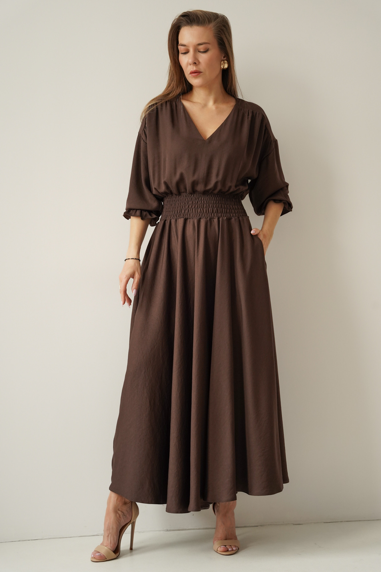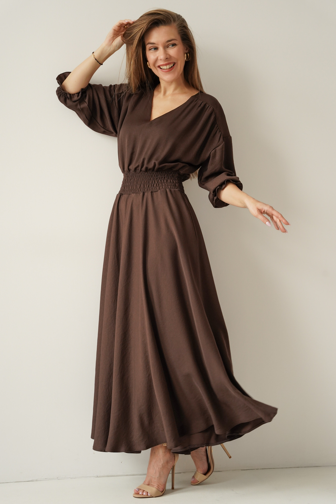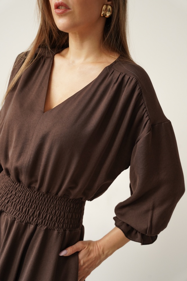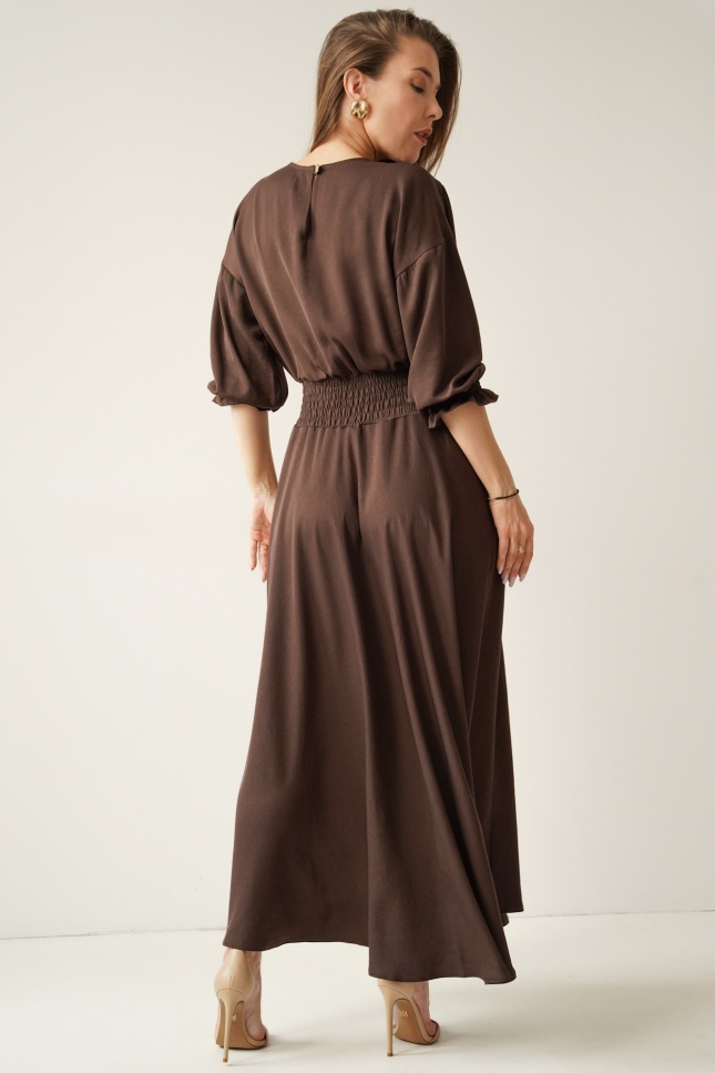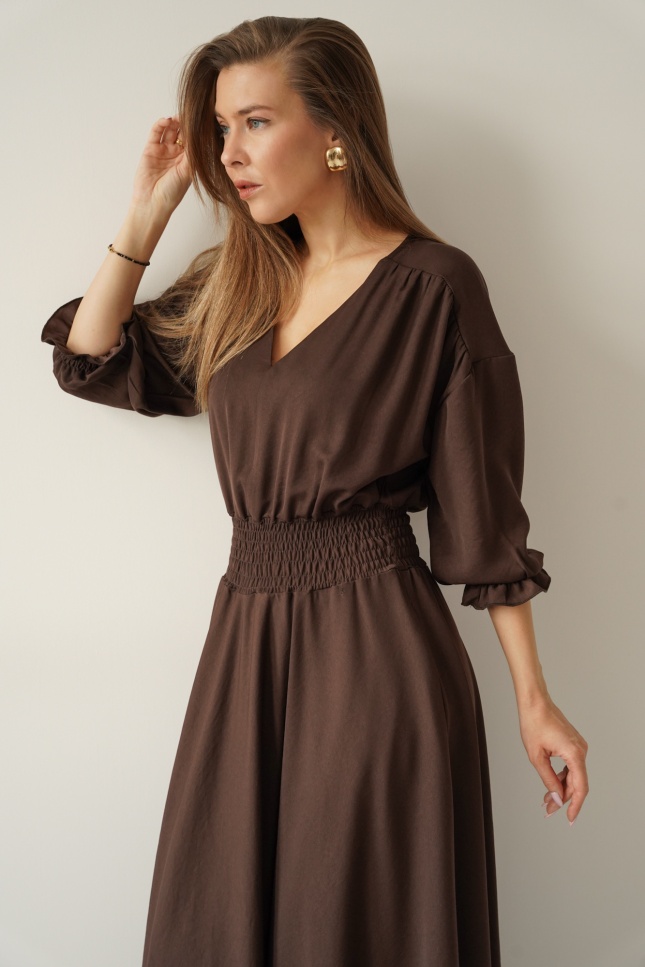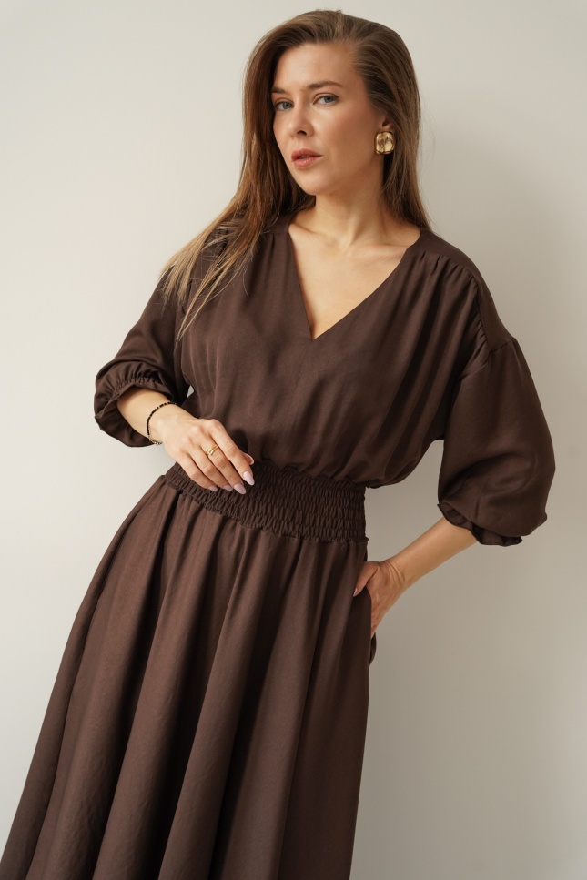 Kobieca sukienka w typie carmenki z bufiastymi rękawami Paloma czekolada