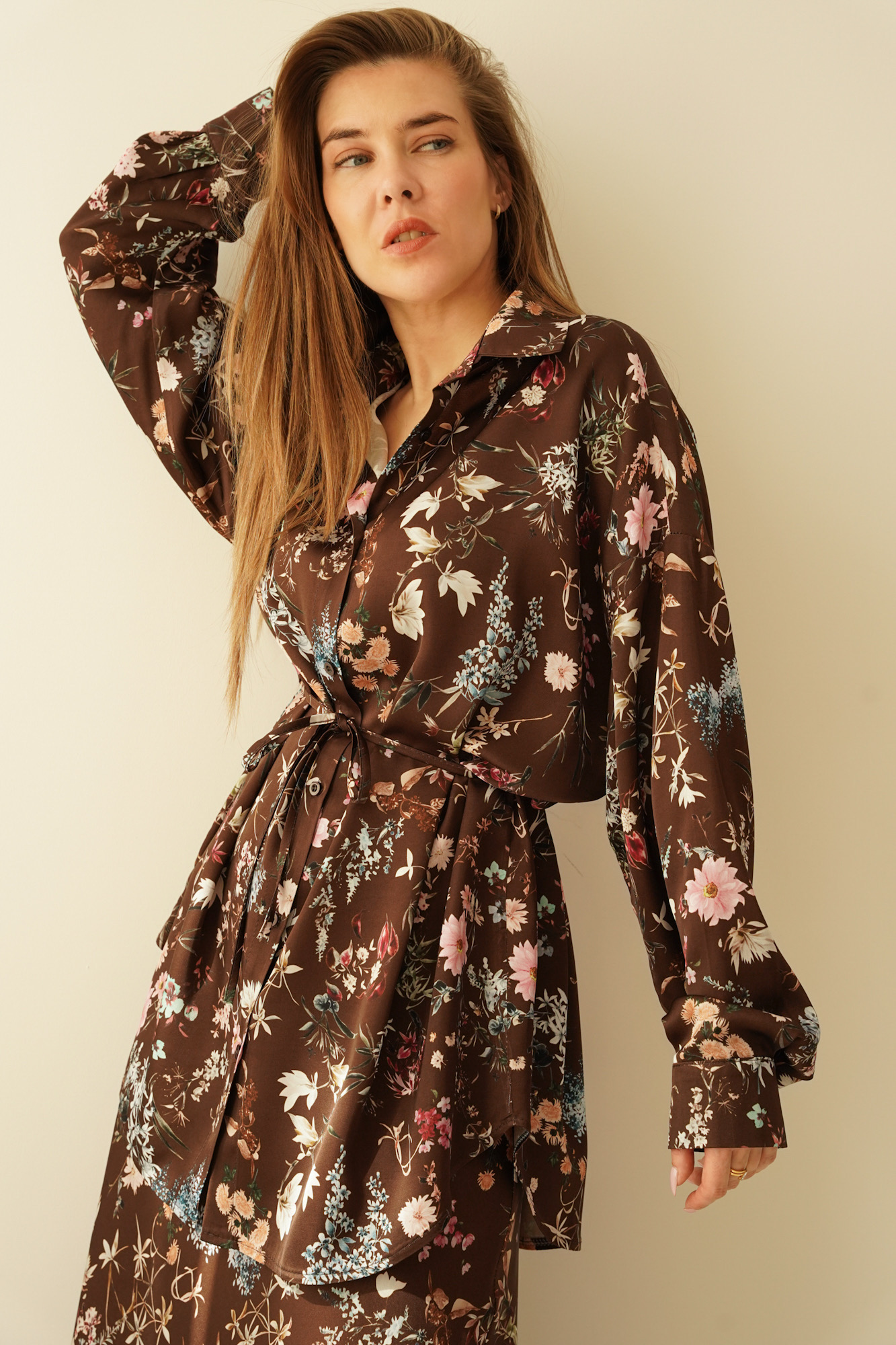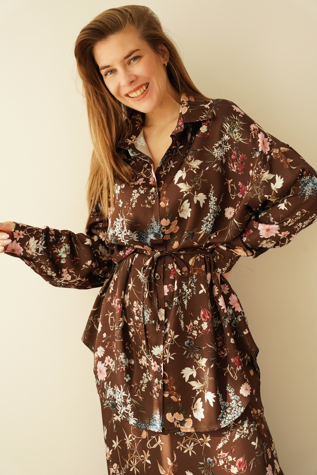 Anais to elegancki komplet damski premium składający się z luźnej koszuli wiązanej w talii delikatnym troczkiem oraz kobiecej spódnicy maxi. Model został uszyty ze szlachetnej tkaniny o jedwabnym chwycie będącej mieszanką 70% wiskozy i 30% cupro, dzięki czemu jest lekki, miękki, przyjemny dla ciała i pięknie układa się na sylwetce. Kwiatowy wzór dodaje mu subtelnego, romantycznego charakteru, a dopracowany fason sprawia, że komplet doskonale sprawdzi się zarówno na co dzień, jak i podczas ważnych uroczystości. To propozycja dla kobiet ceniących francuski szyk, ponadczasową elegancję i szlachetną jakość.