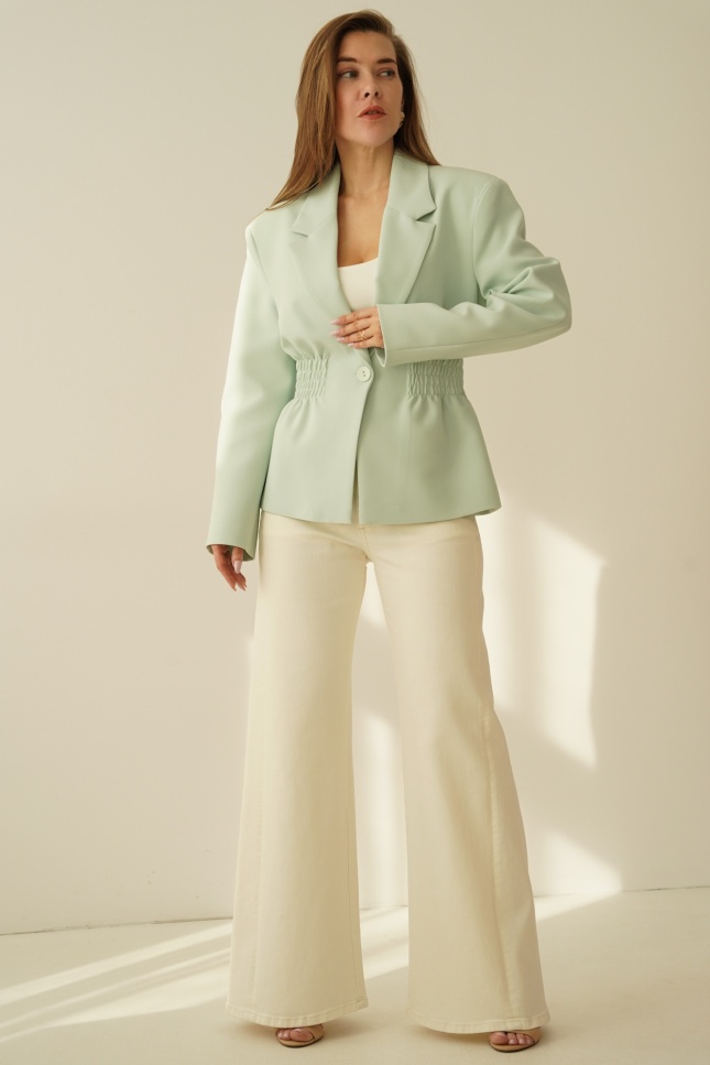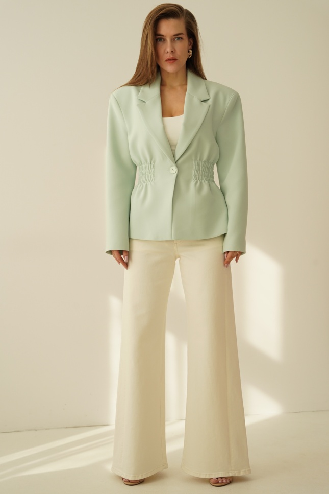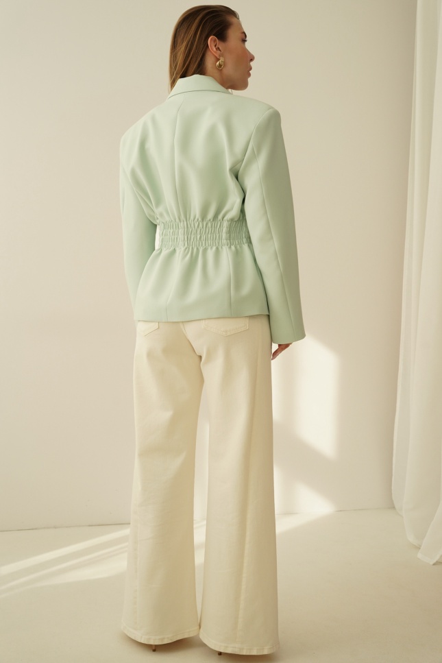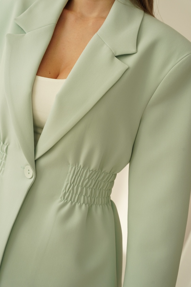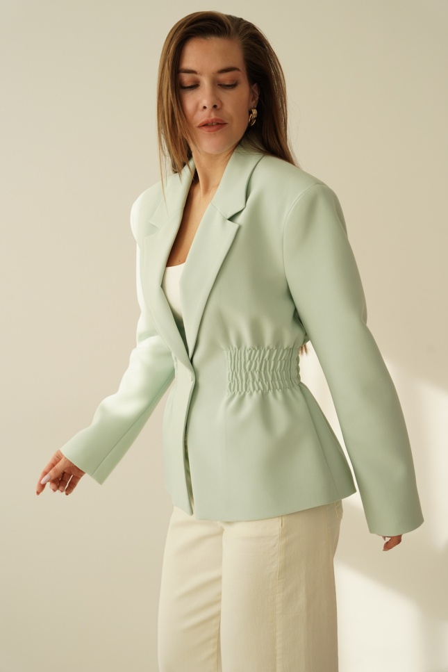 Żakiet „Eleganza” to subtelna mieszanka ponadczasowej elegancji i nowoczesnego designu. Dopasowany fason zapinany na pojedynczy, guzik oraz efektowna, szeroka guma wszyta w talii pięknie podkreślają kobiecą sylwetkę, eksponując jej najpiękniejsze atuty.