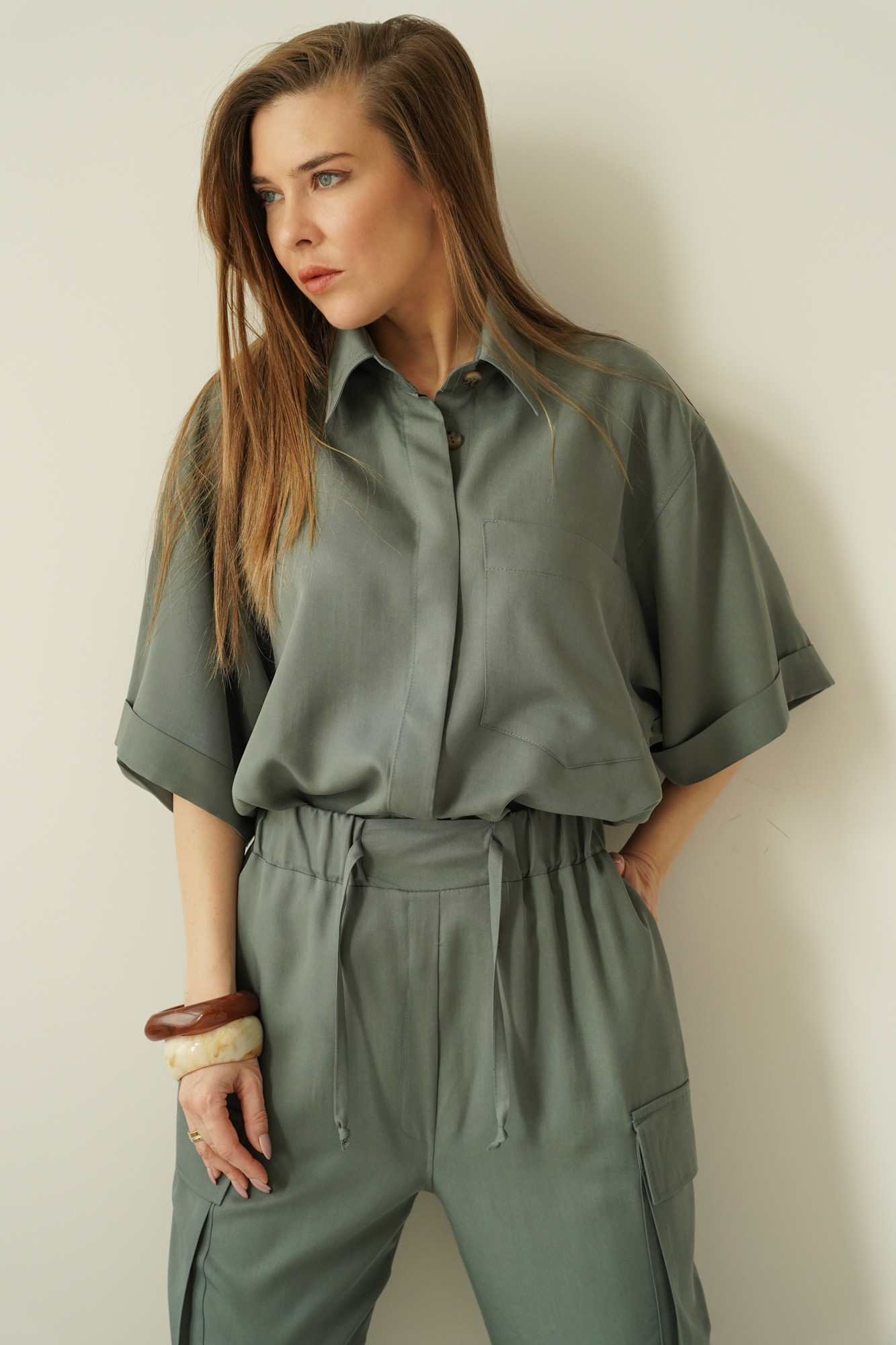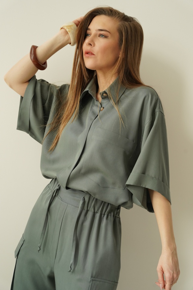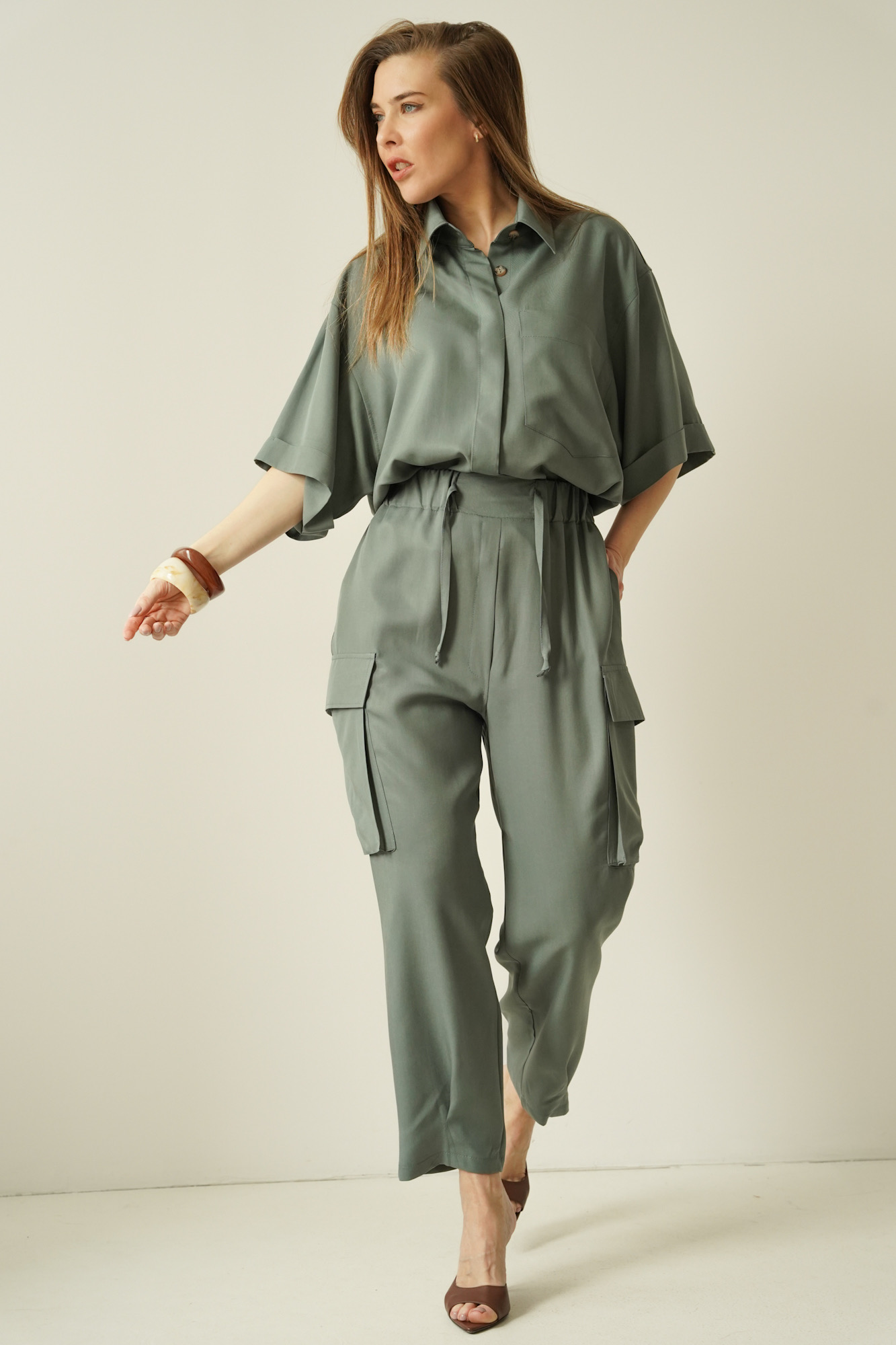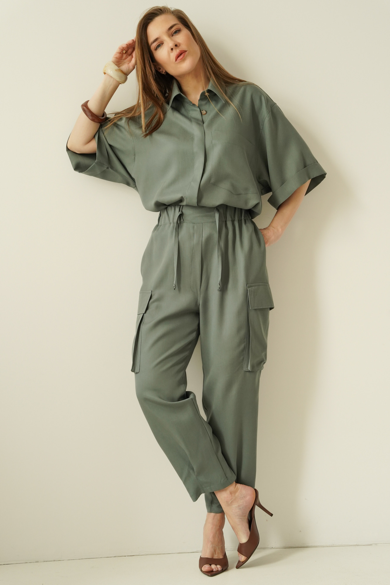 Safari to casualowy komplet damski inspirowany stylem safari, uszyty w polskiej szwalni z naturalnej, przewiewnej tkaniny 100% tencel. Zestaw tworzą nowoczesna pudełkowa koszula oraz spodnie cargo ze zwężanymi nogawkami, które nadają sylwetce modowego, miejskiego charakteru. Tencel jest miękki, oddychający i przyjemny dla skóry, dzięki czemu komplet doskonale sprawdza się w sezonie wiosna–lato. Model Safari to idealny wybór na co dzień, do miasta, na wyjazdy i do stylizacji smart casual. Ponadczasowa forma, naturalny materiał i lokalna produkcja sprawiają, że to komplet premium, który łączy wygodę z nowoczesną elegancją.