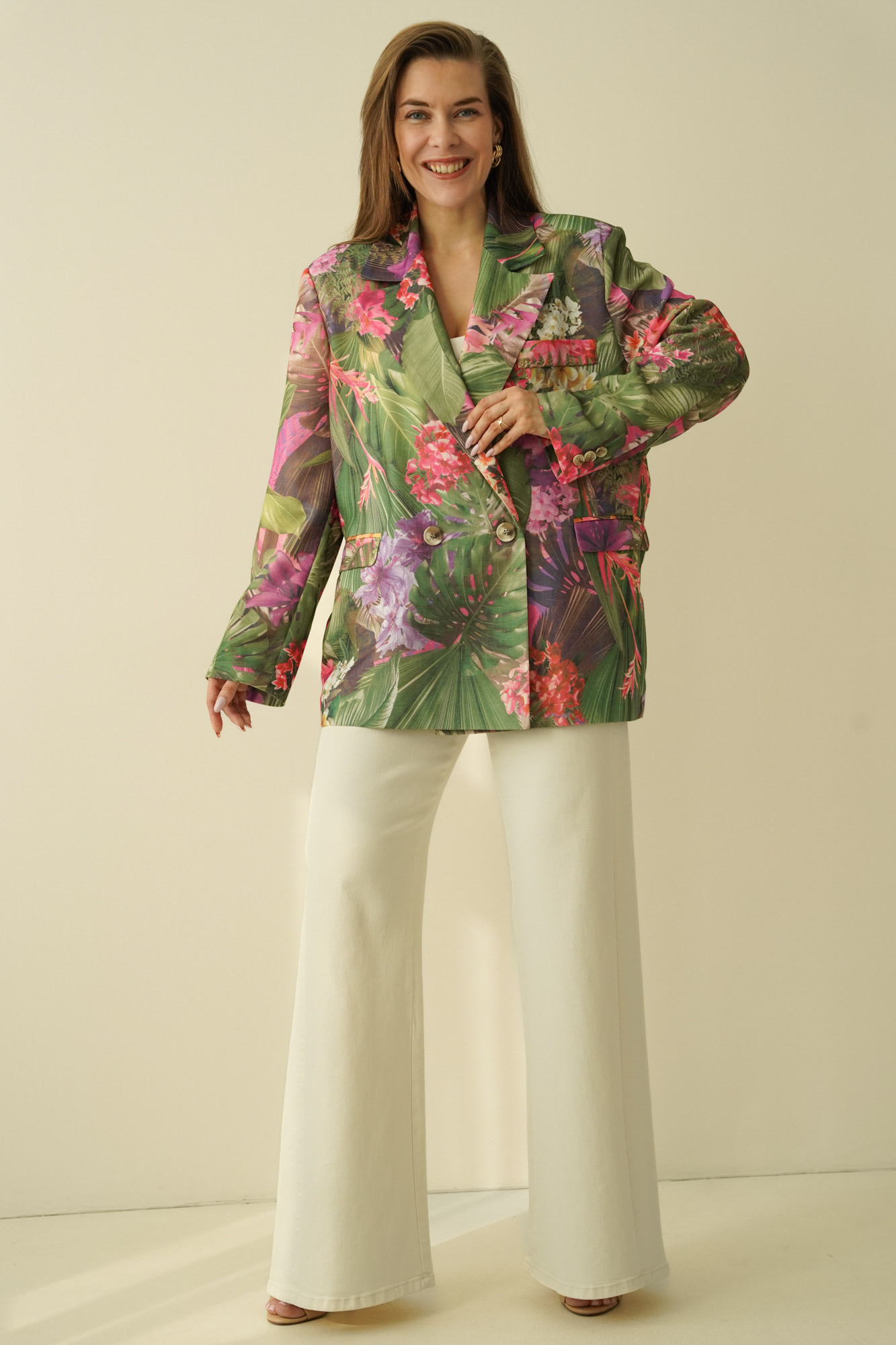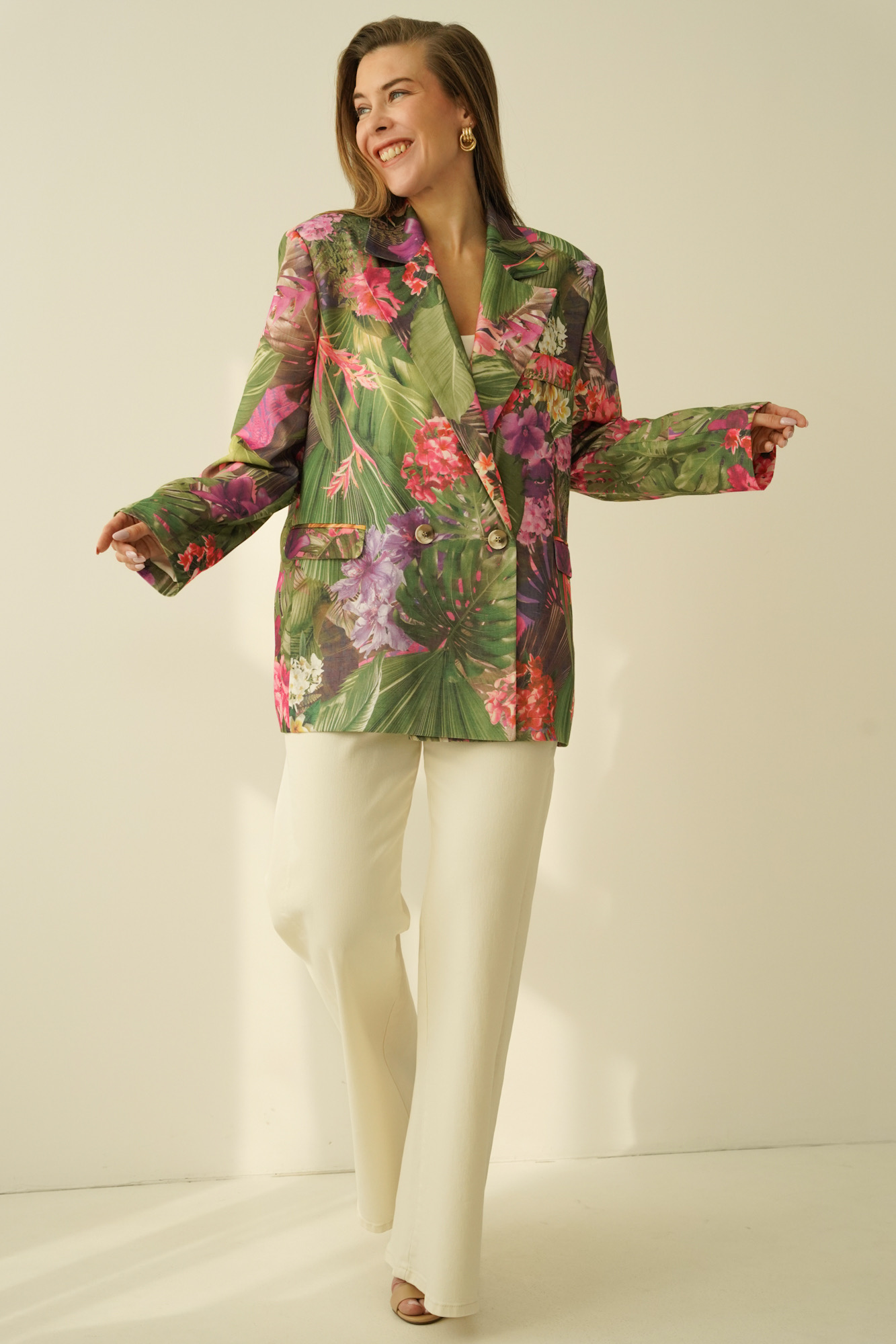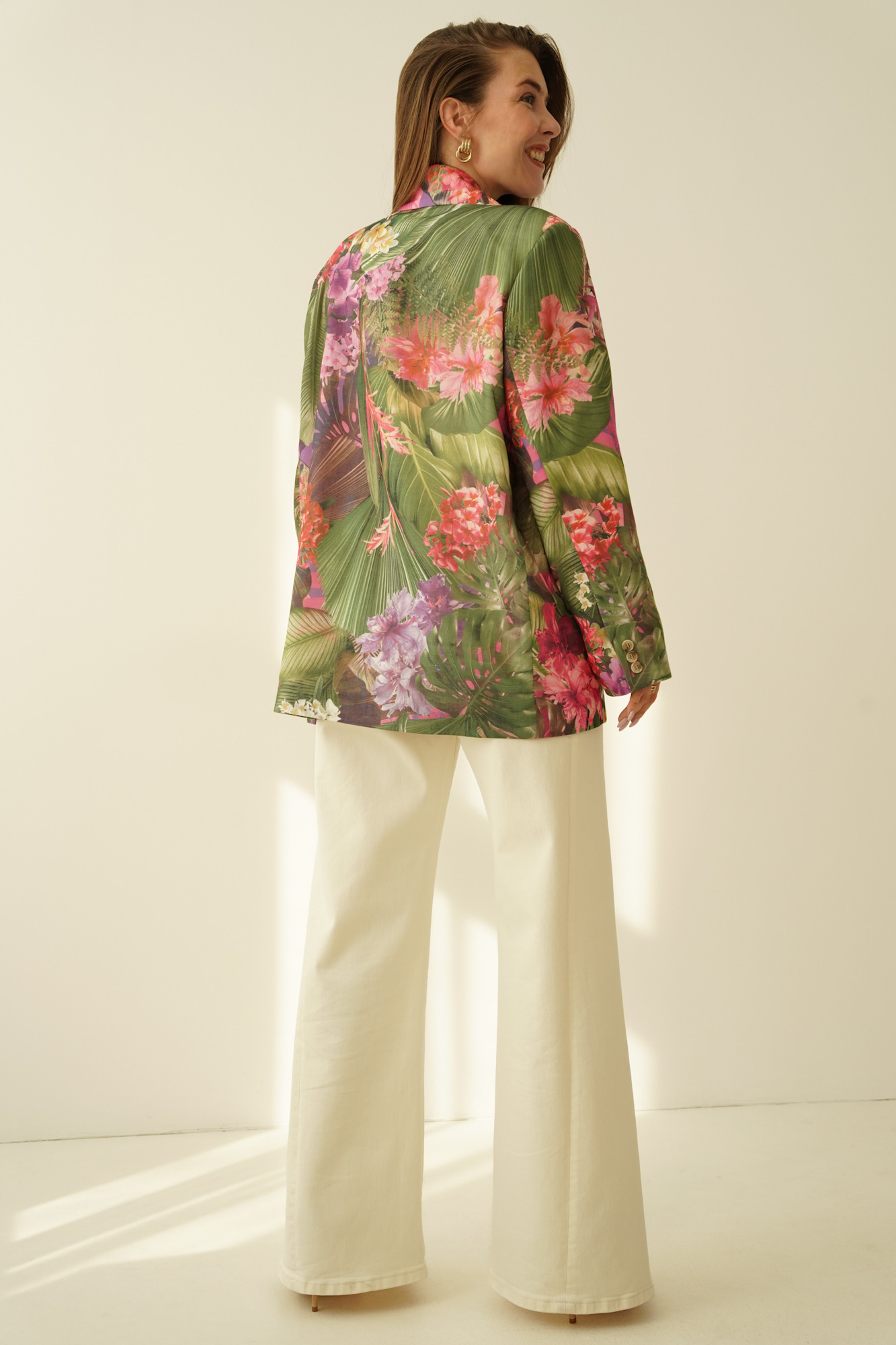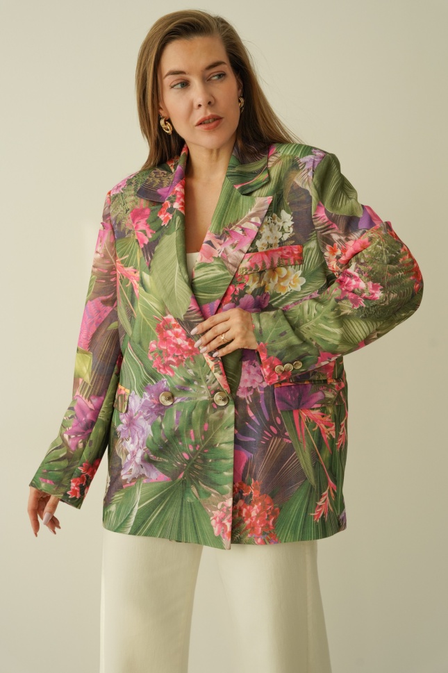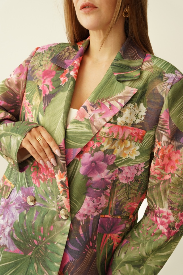 Odkryj klimat tropikalnej elegancji dzięki naszej wyjątkowej lnianej marynarce. Ta dwurzędowo zapinana marynarka zaskakuje oryginalnym, tropikalnym wzorem utrzymanym w soczystych kolorach, które przyciągają spojrzenia i emanują pozytywną energią. Wykonana z przewiewnego, wysokiej jakości lnu, gwarantuje komfort nawet w ciepłe dni. Wewnątrz znajduje się delikatna podszewka z naturalnej wiskozy, zapewniająca wygodę noszenia oraz oddychalność. Idealna na wyjątkowe okazje i stylowe letnie wieczory.