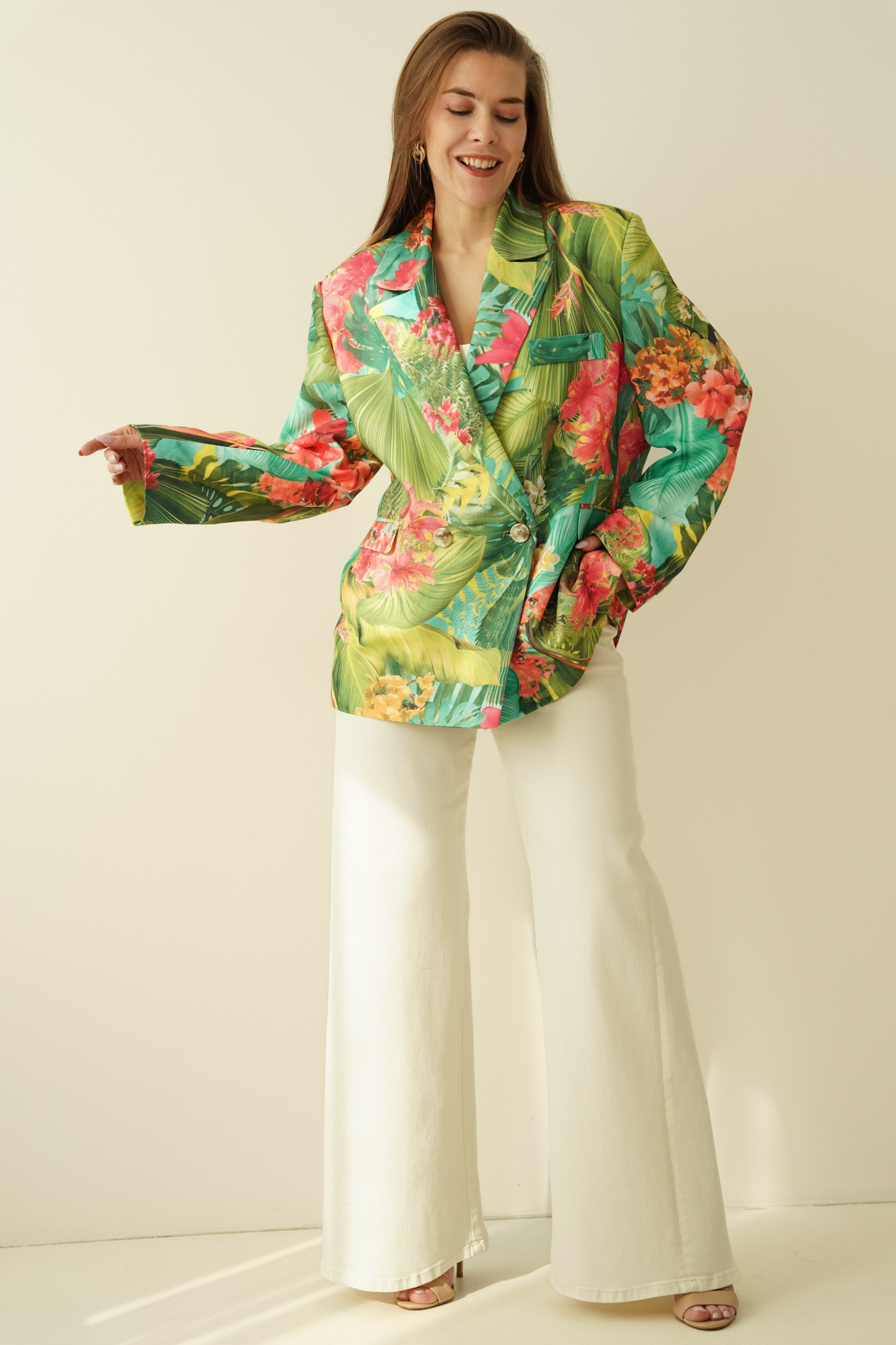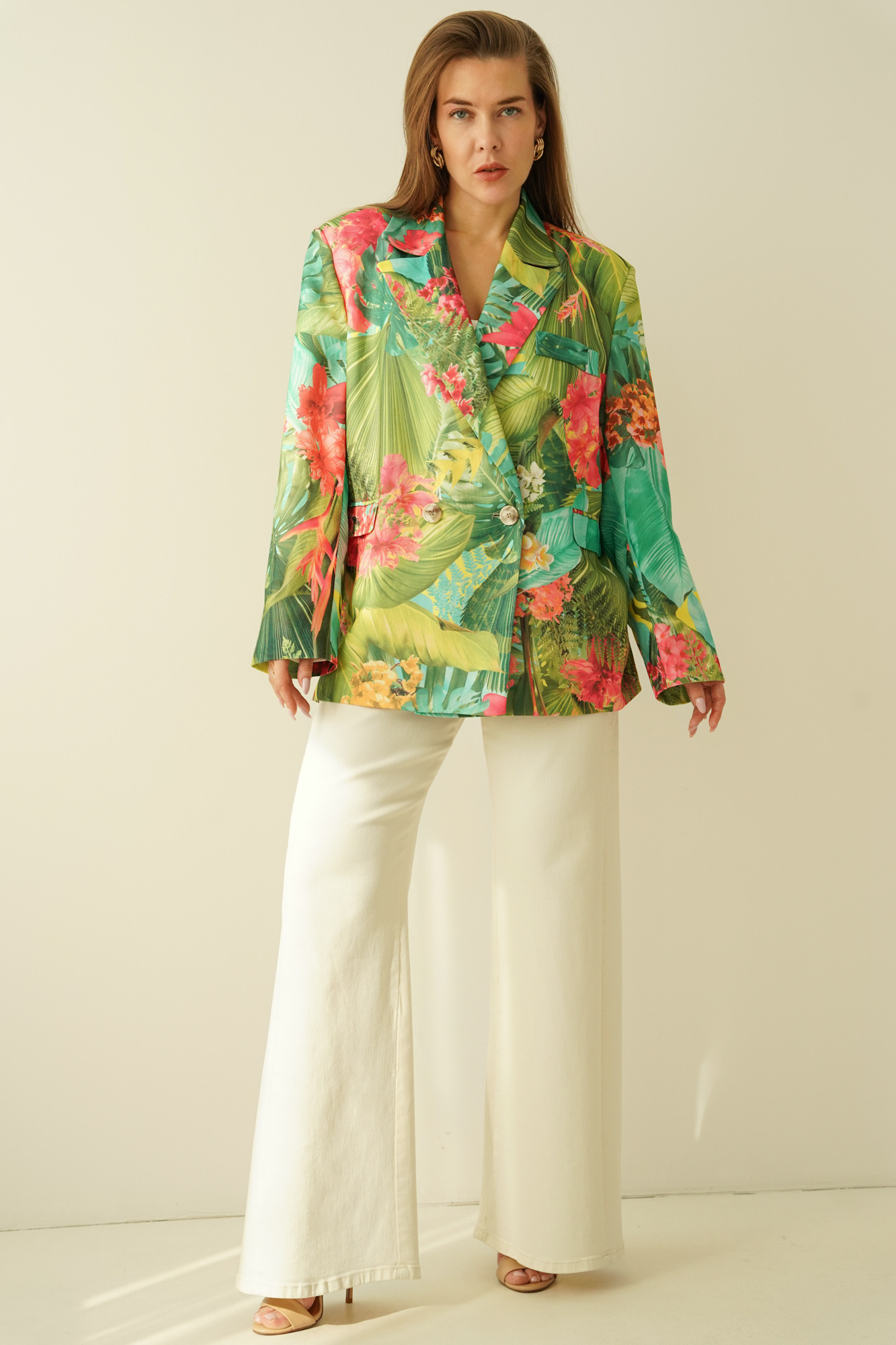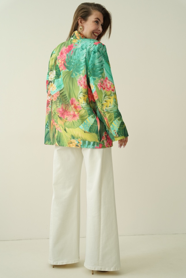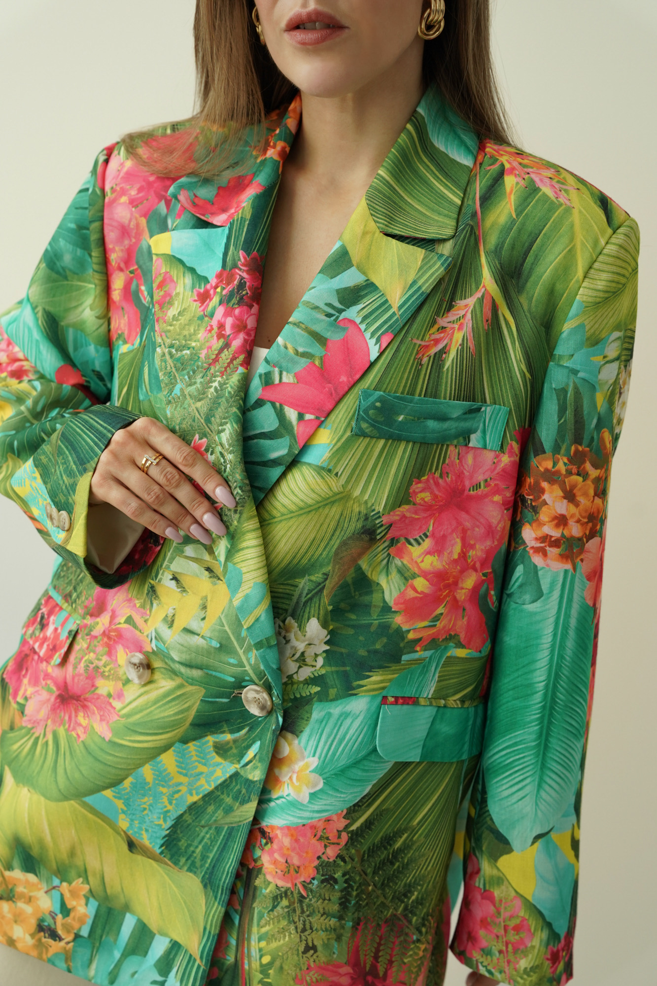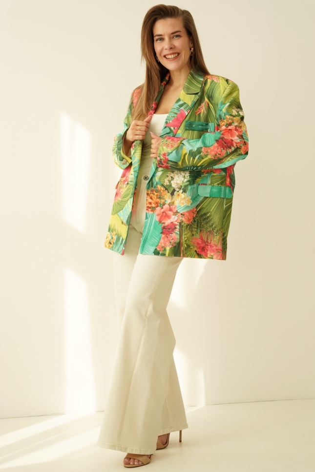 Odkryj klimat tropikalnej elegancji dzięki naszej wyjątkowej lnianej marynarce. Ta dwurzędowo zapinana marynarka zaskakuje oryginalnym, tropikalnym wzorem utrzymanym w soczystych kolorach, które przyciągają spojrzenia i emanują pozytywną energią. Wykonana z przewiewnego, wysokiej jakości lnu, gwarantuje komfort nawet w ciepłe dni. Wewnątrz znajduje się delikatna podszewka z naturalnej wiskozy, zapewniająca wygodę noszenia oraz oddychalność. Idealna na wyjątkowe okazje i stylowe letnie wieczory.