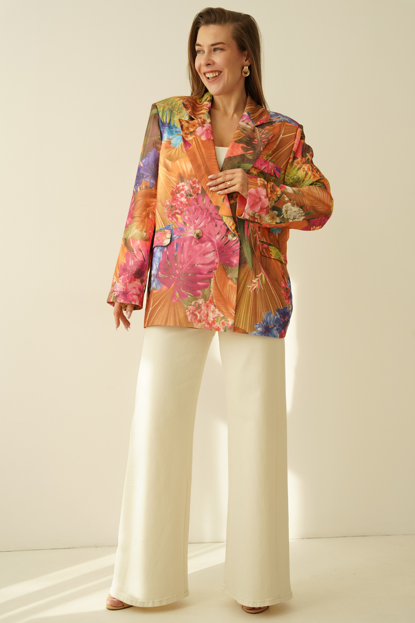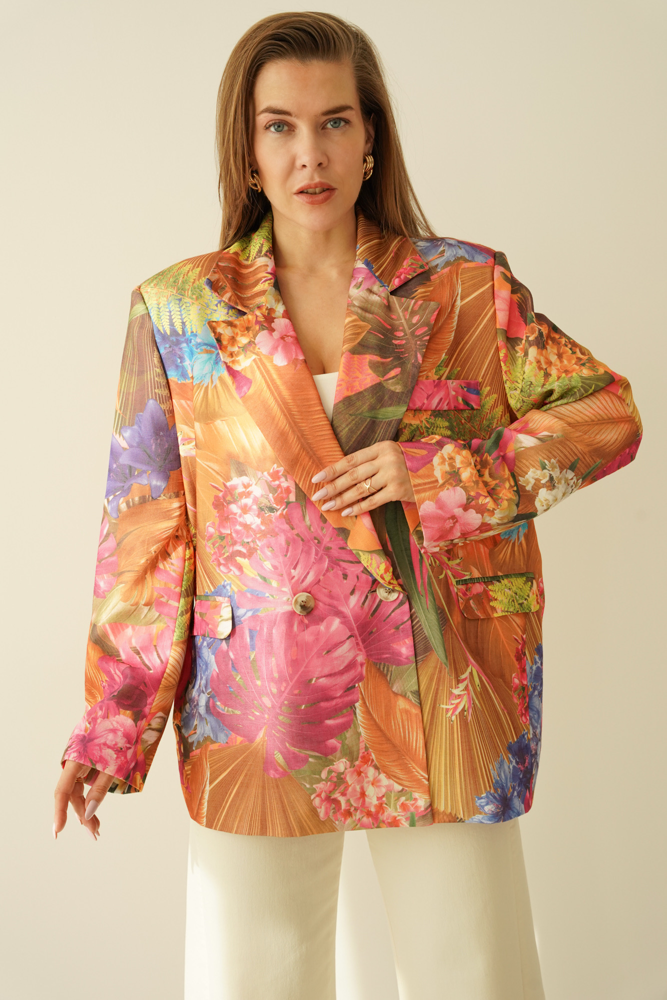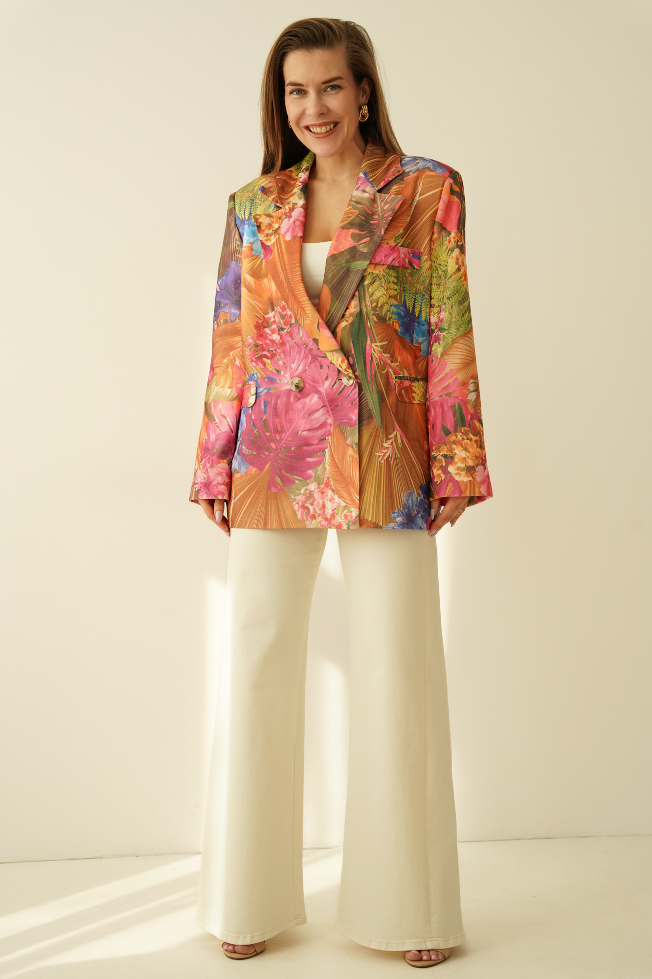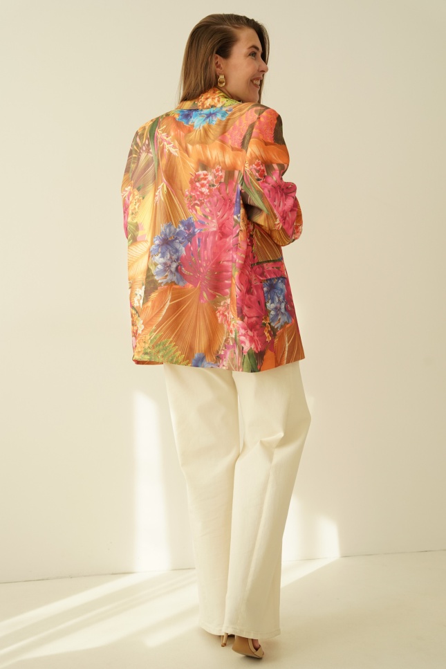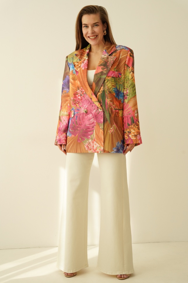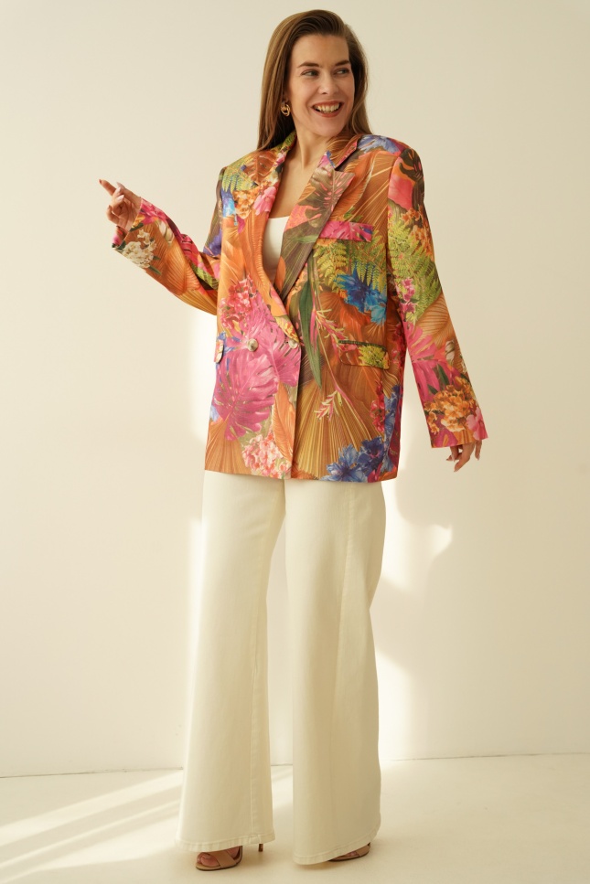 Odkryj klimat tropikalnej elegancji dzięki naszej wyjątkowej lnianej marynarce. Ta dwurzędowo zapinana marynarka zaskakuje oryginalnym, tropikalnym wzorem utrzymanym w soczystych kolorach, które przyciągają spojrzenia i emanują pozytywną energią. Wykonana z przewiewnego, wysokiej jakości lnu, gwarantuje komfort nawet w ciepłe dni. Wewnątrz znajduje się delikatna podszewka z naturalnej wiskozy, zapewniająca wygodę noszenia oraz oddychalność. Idealna na wyjątkowe okazje i stylowe letnie wieczory.