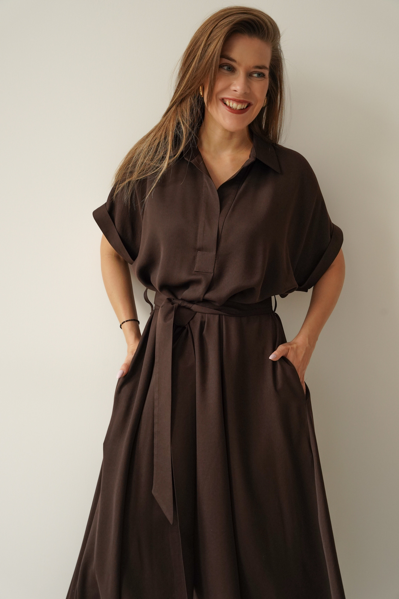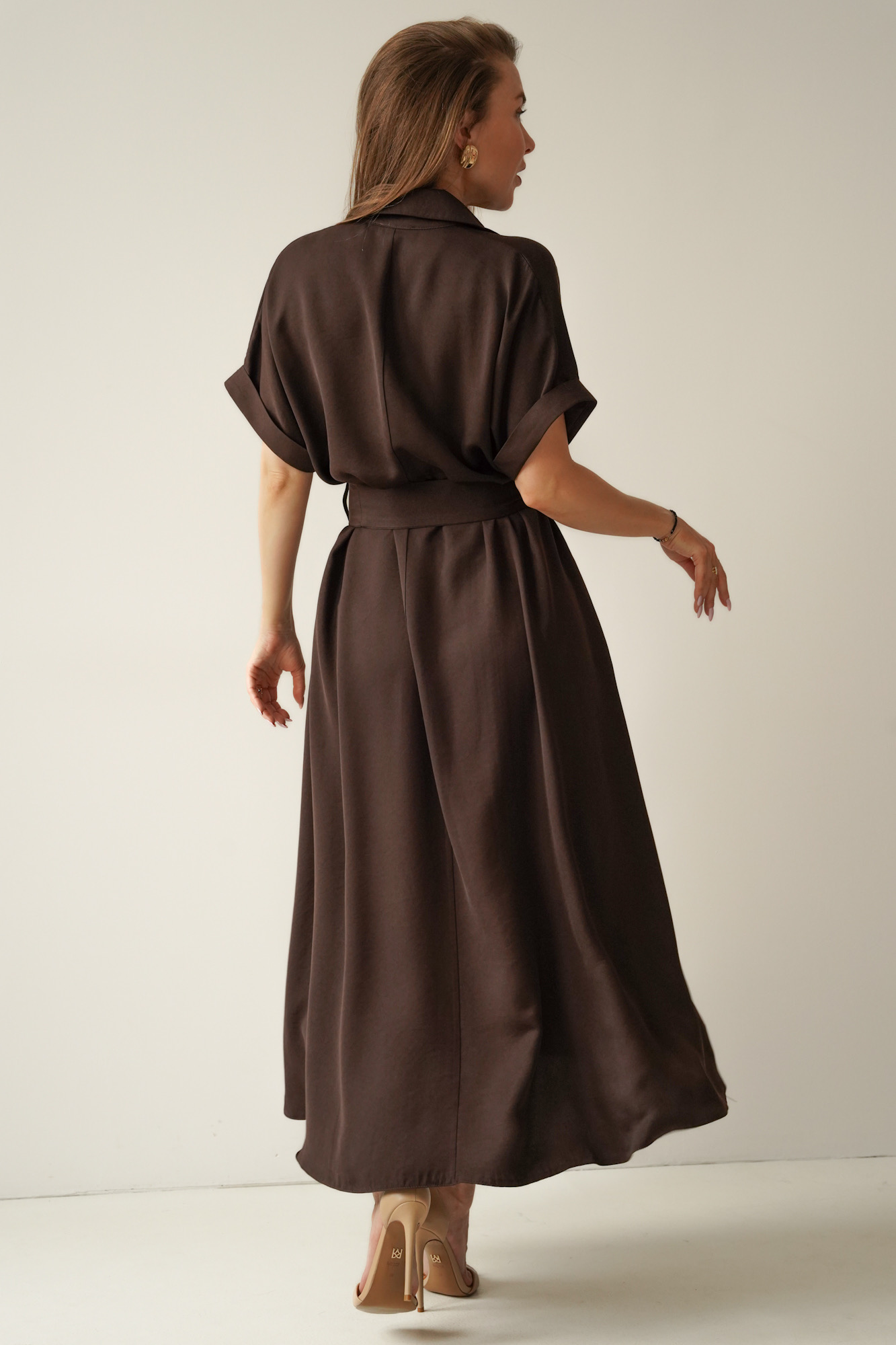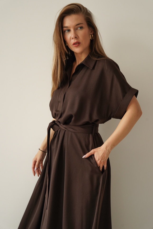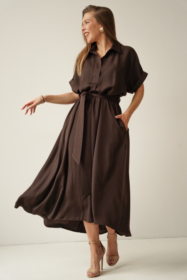 Luźna sukienka smart casual z kołnierzykiem Elan czekolada