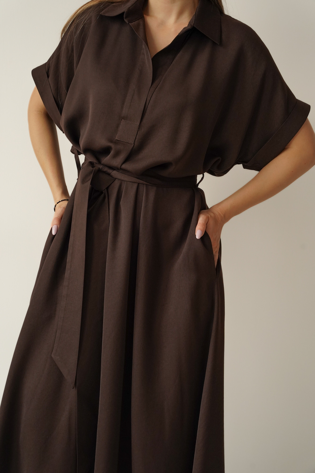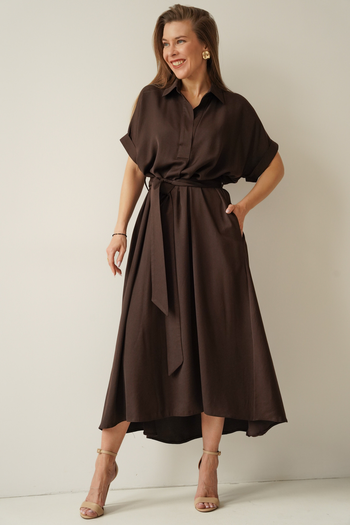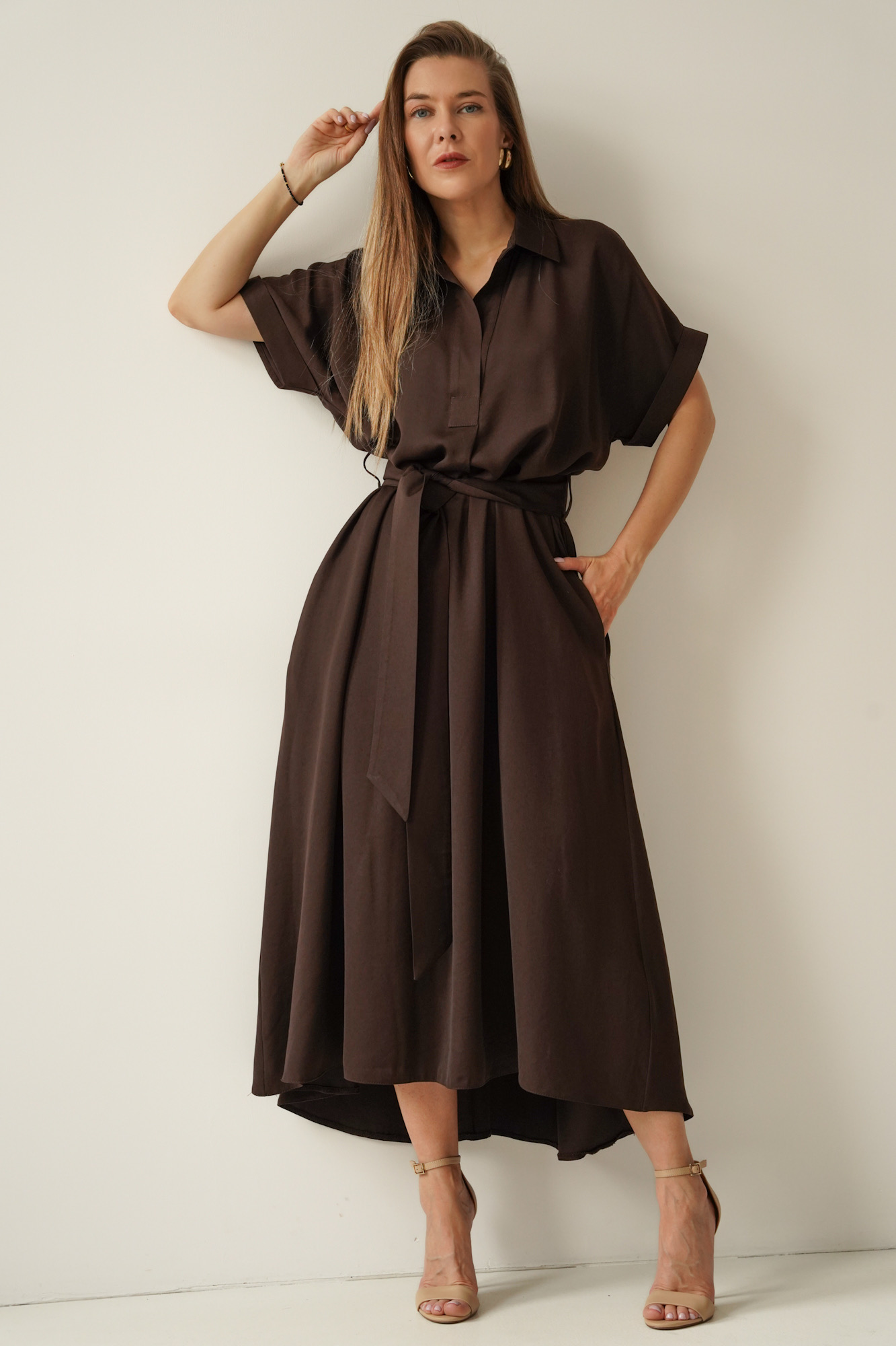 Luźna sukienka smart casual z kołnierzykiem Elan czekolada